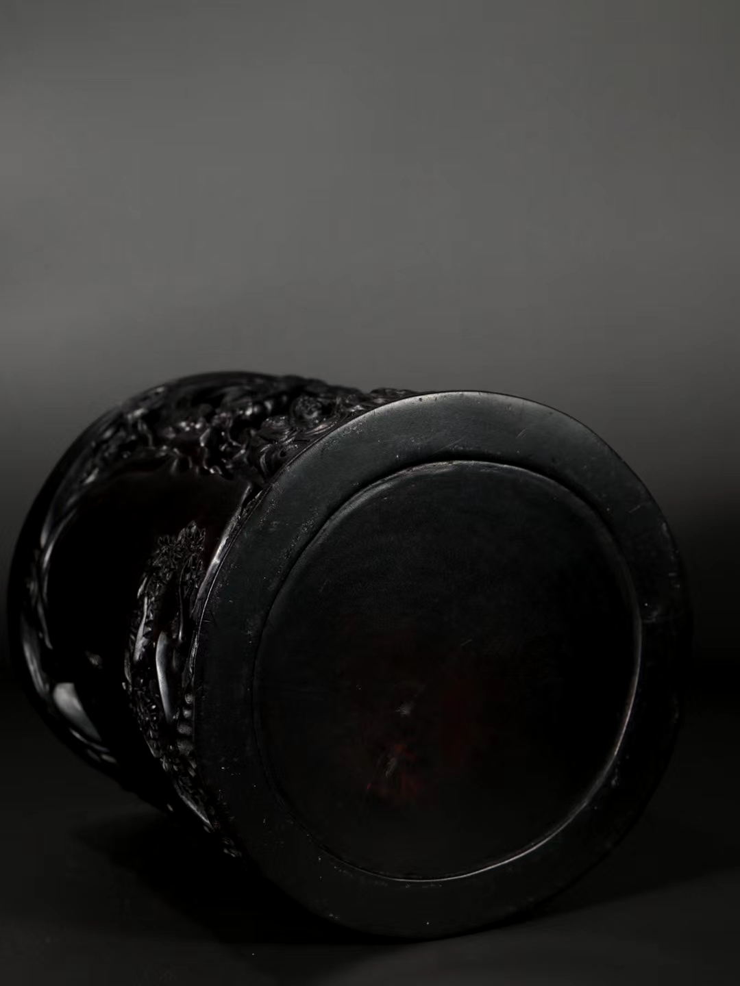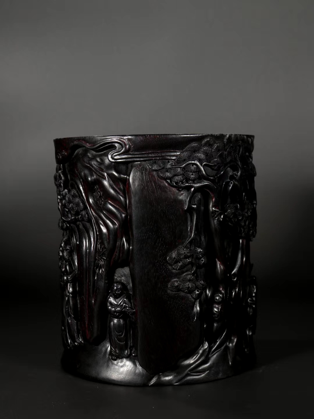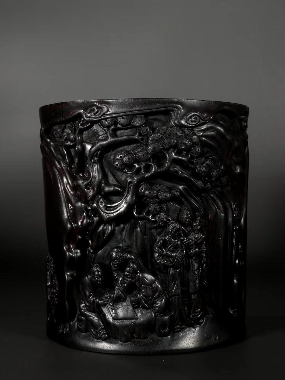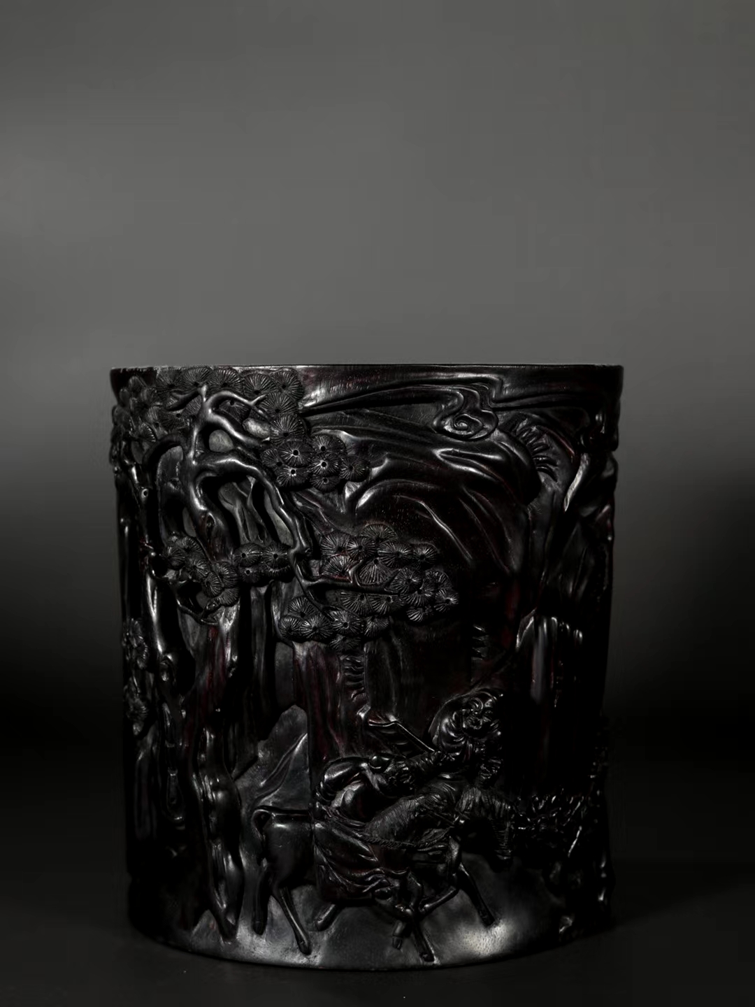 人物故事 文房笔筒,采用檀木精雕而成,材质上乘,木质坚硬,形制古雅,内部掏空,整木成器,浮雕人物精美生动,五官精致,树木茂盛,雕工精细,皮壳包浆老辣,纹理清晰,收藏价值高!规格:高15cm宽13.4cm 重981克。