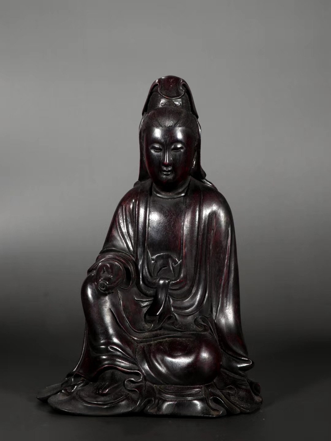 书卷观音 摆件 观音品相好,开脸清晰,面容慈善,发善高耸,双目微闭,衣饰缕缕,手拿书卷,座姿自在,线条流畅,木质坚硬,油份 足,包浆浓郁。材质:木,规格:18.8cm宽13.7**10cm 重703克。