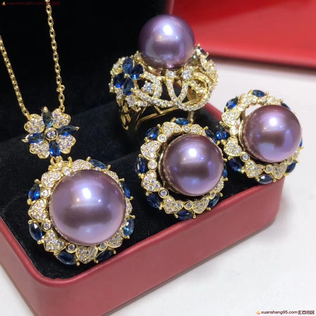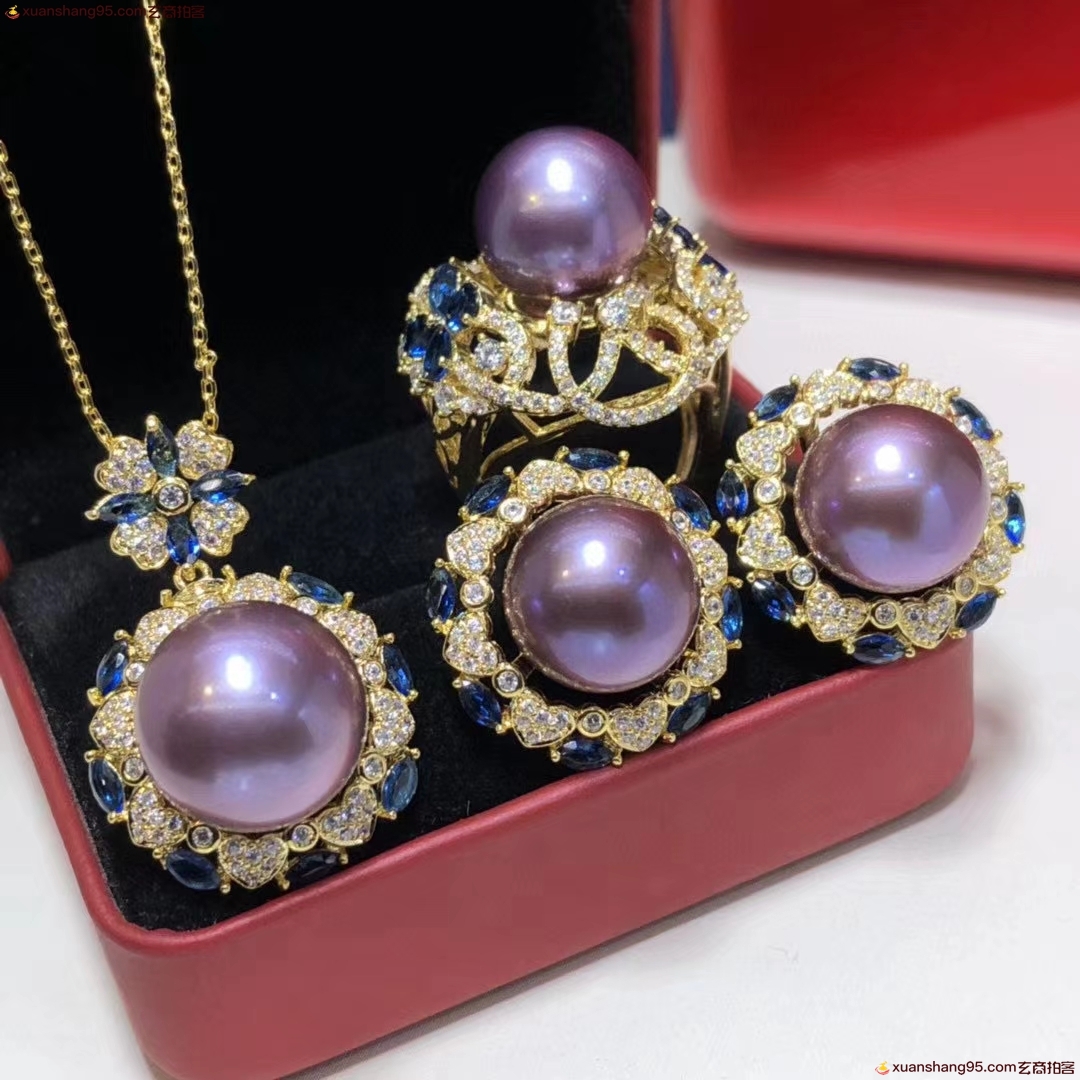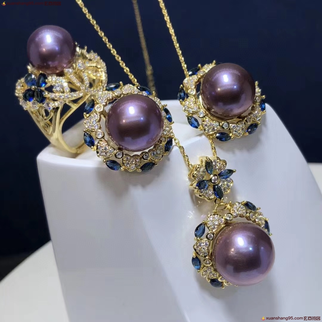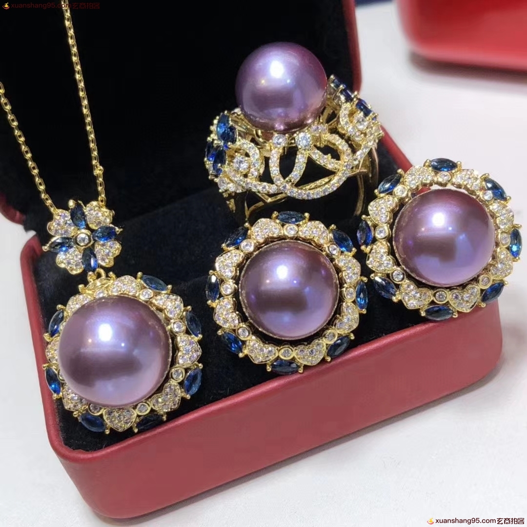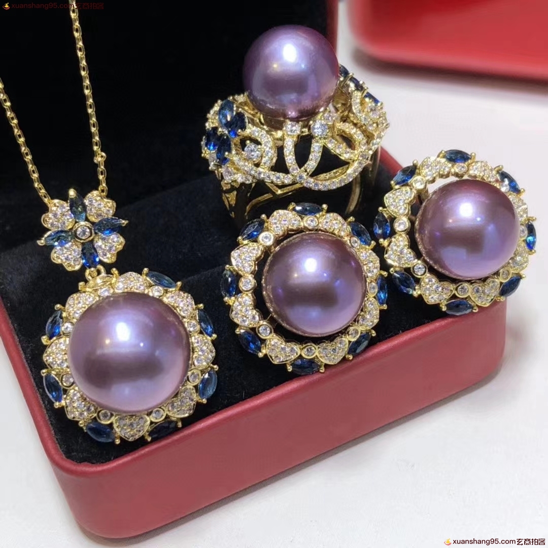 纯天然 妖艳紫 珍珠首饰套装 纯天然 颜色 强光 正圆 ,18KB包金工艺,佩戴佳品,吊坠尺寸12毫米 耳钉和戒指尺寸11毫米。
