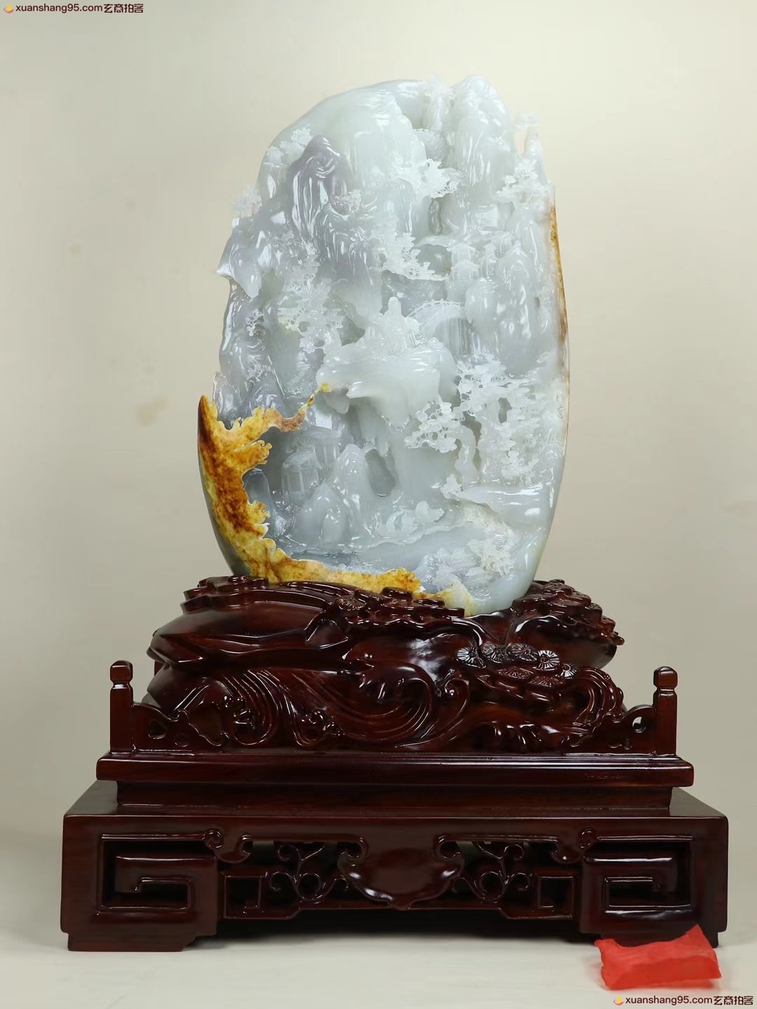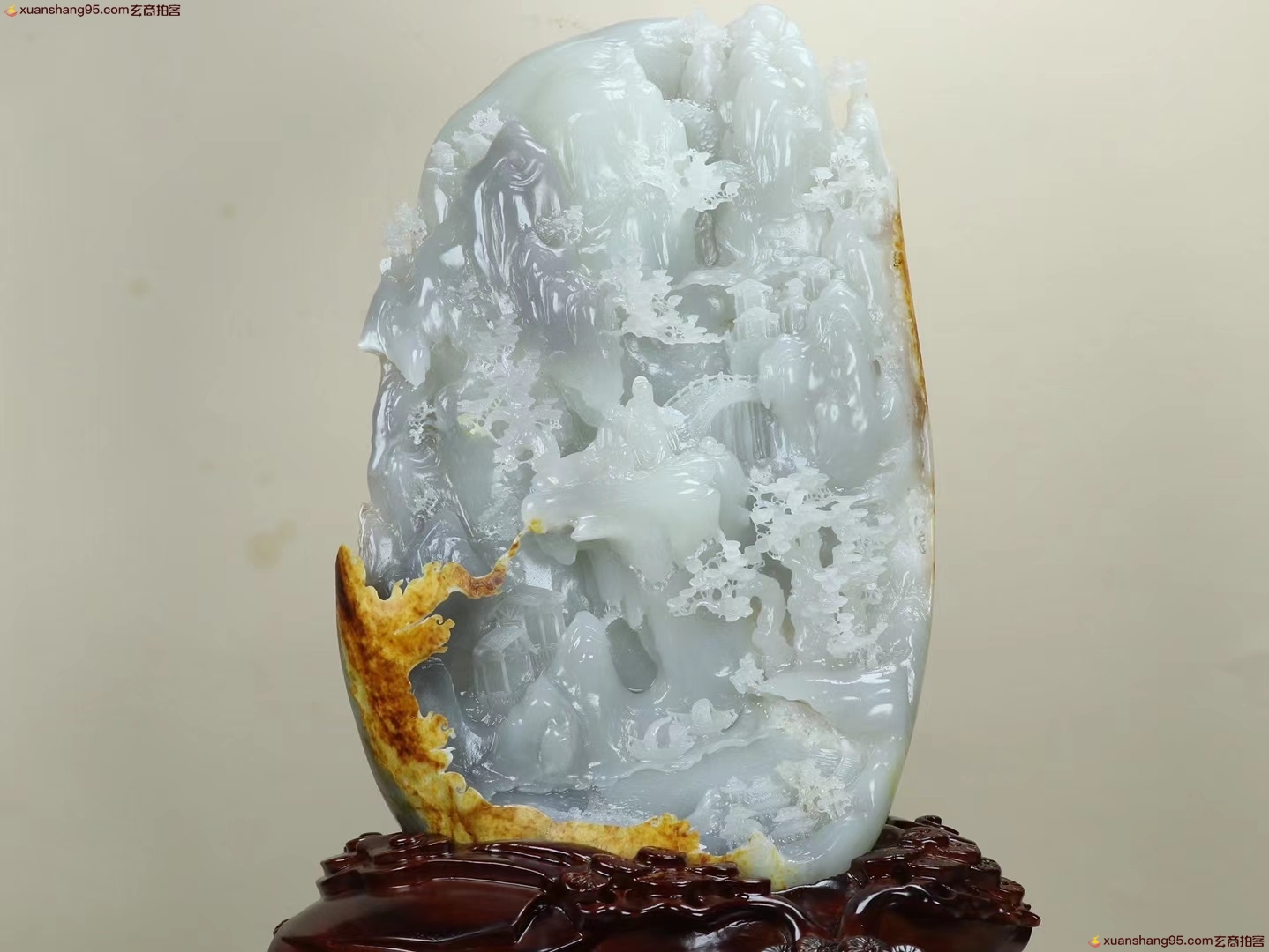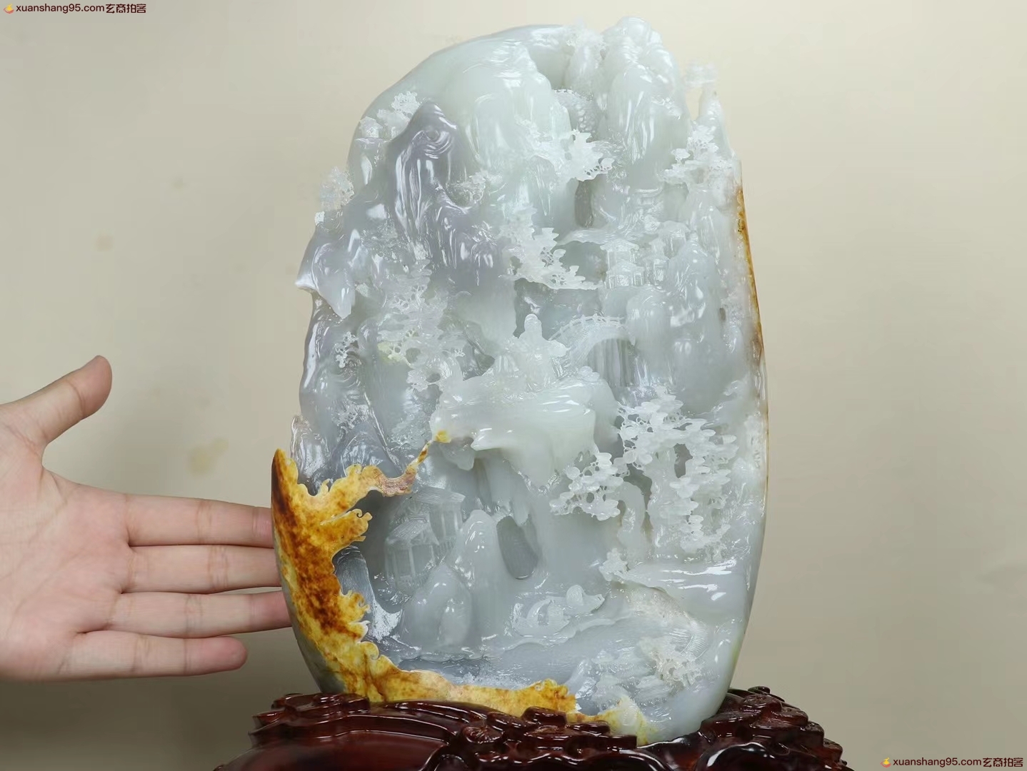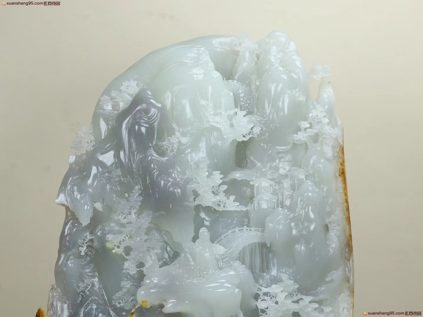 【山水怡情 摆件】精品和田玉烟紫摆件 玉质温润细腻油性十足精工雕琢,两个老人悠闲交谈,白云飘渺,江波浩淼,一股宁静致远的情怀蔓延开来,不与尘俗,与云为伴,有山水画之气韵,尽显人间大美之意。尺寸约270-180-60mm带底座约410mm。