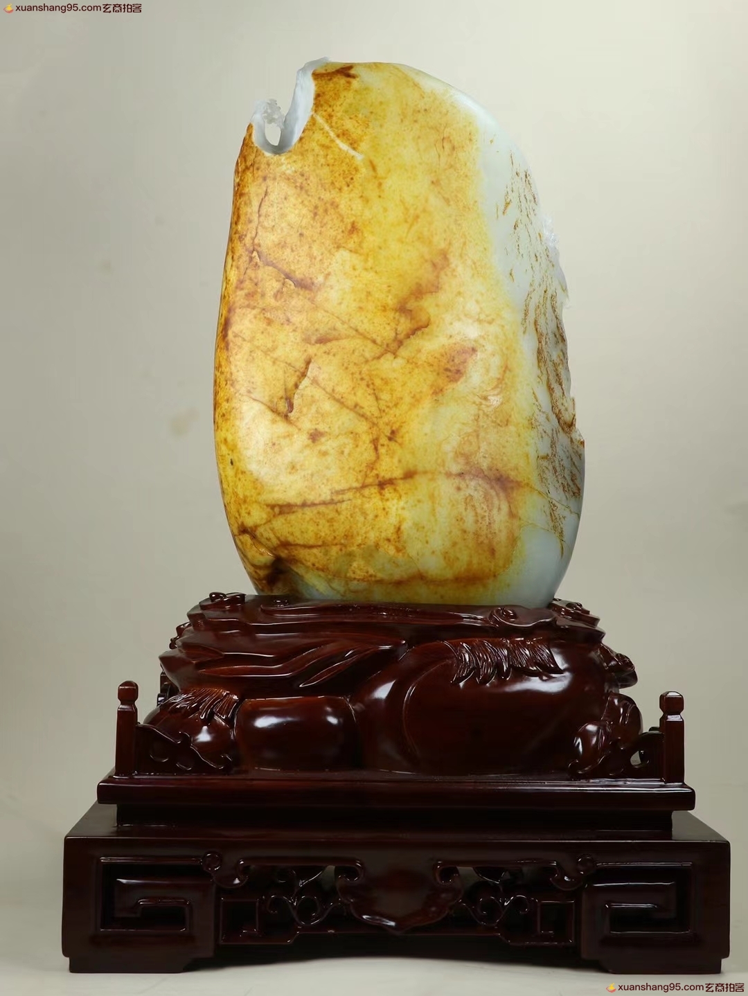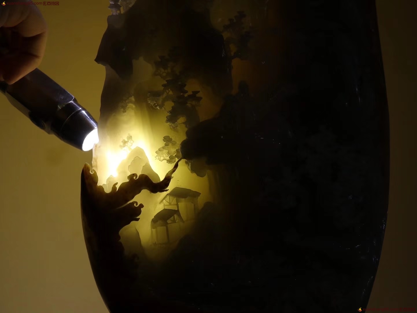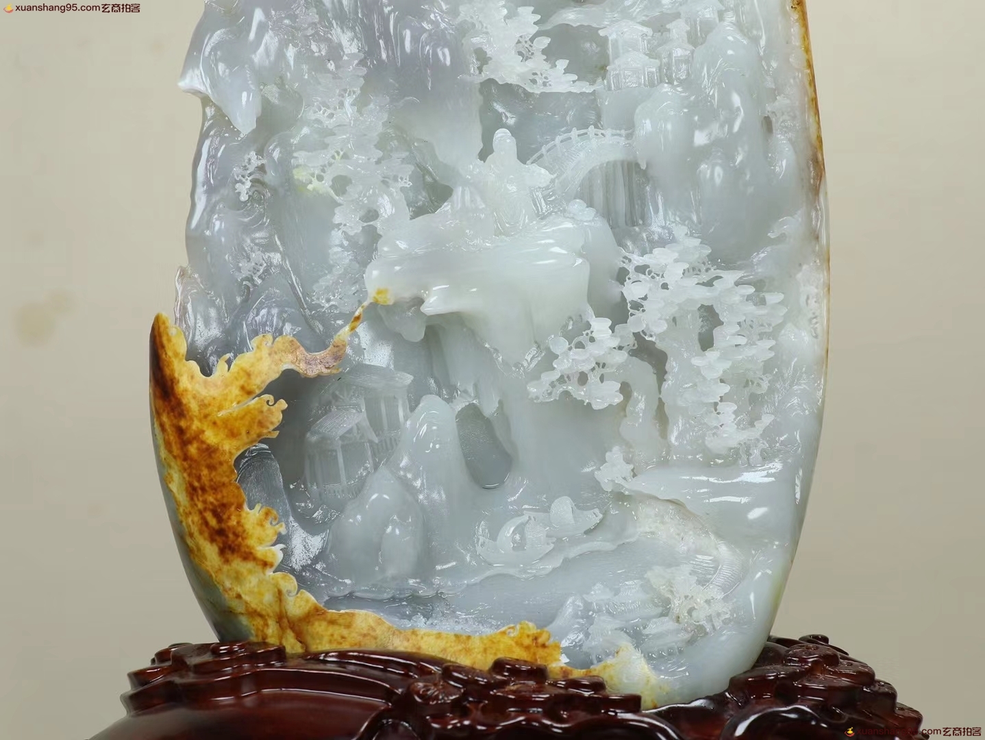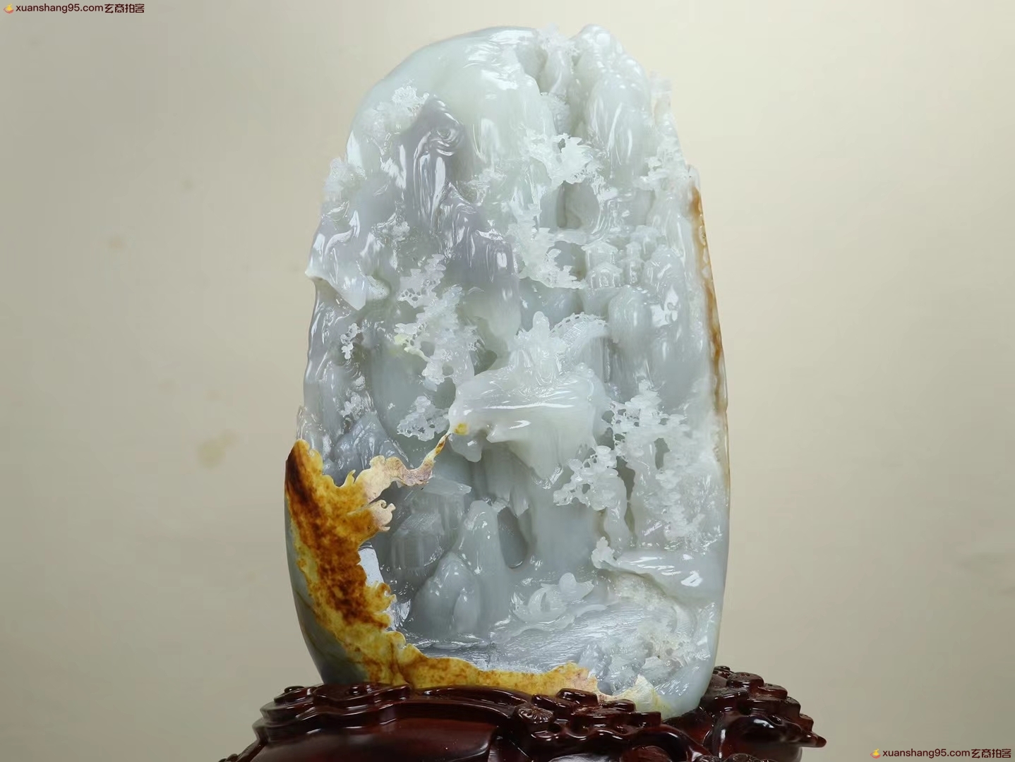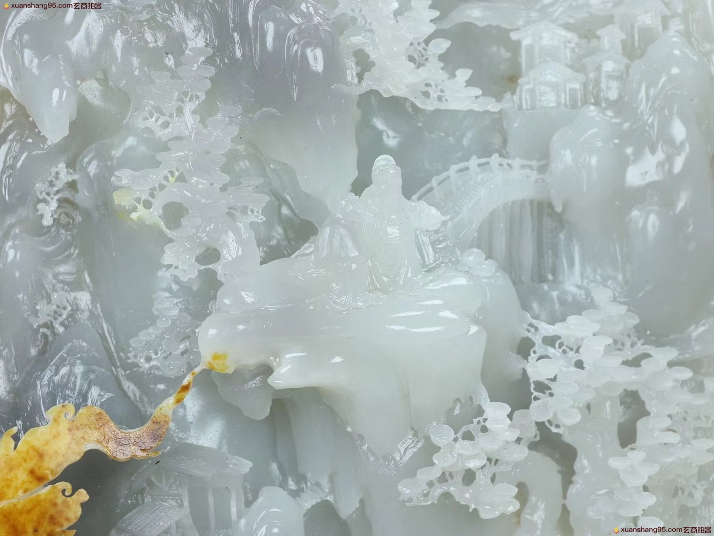 【山水怡情 摆件】精品和田玉烟紫摆件 玉质温润细腻油性十足精工雕琢,两个老人悠闲交谈,白云飘渺,江波浩淼,一股宁静致远的情怀蔓延开来,不与尘俗,与云为伴,有山水画之气韵,尽显人间大美之意。尺寸约270-180-60mm带底座约410mm。
