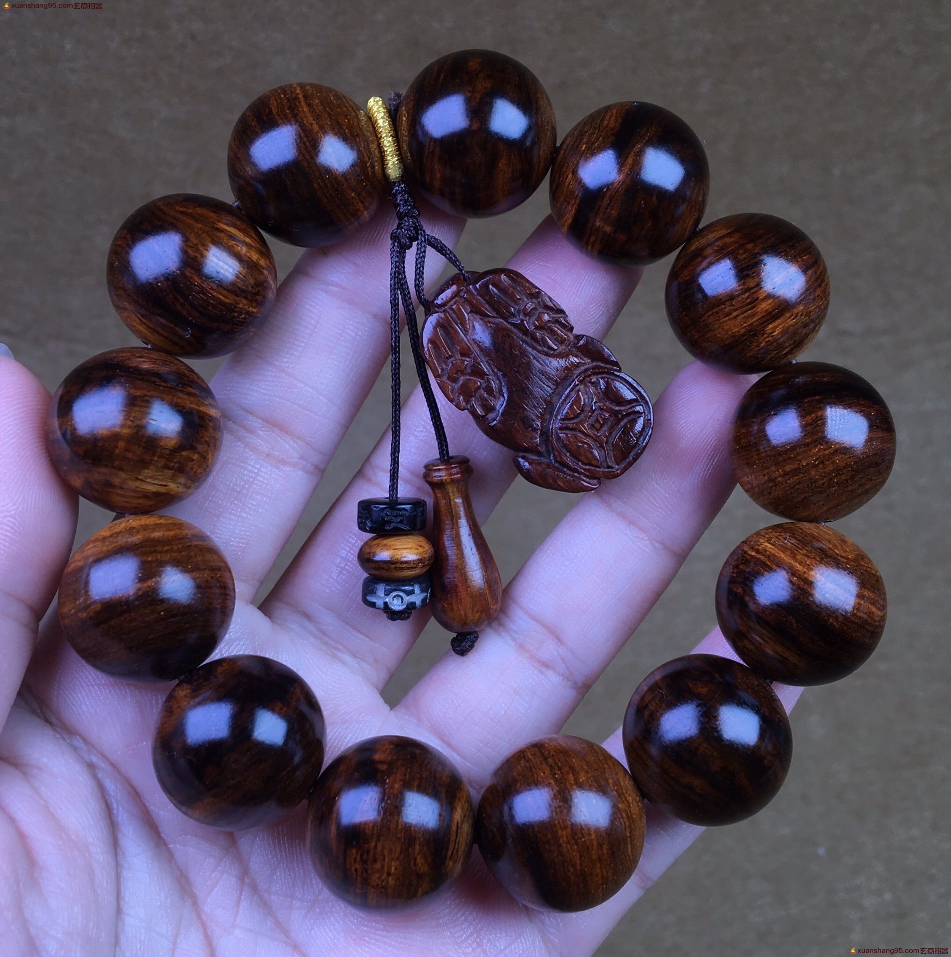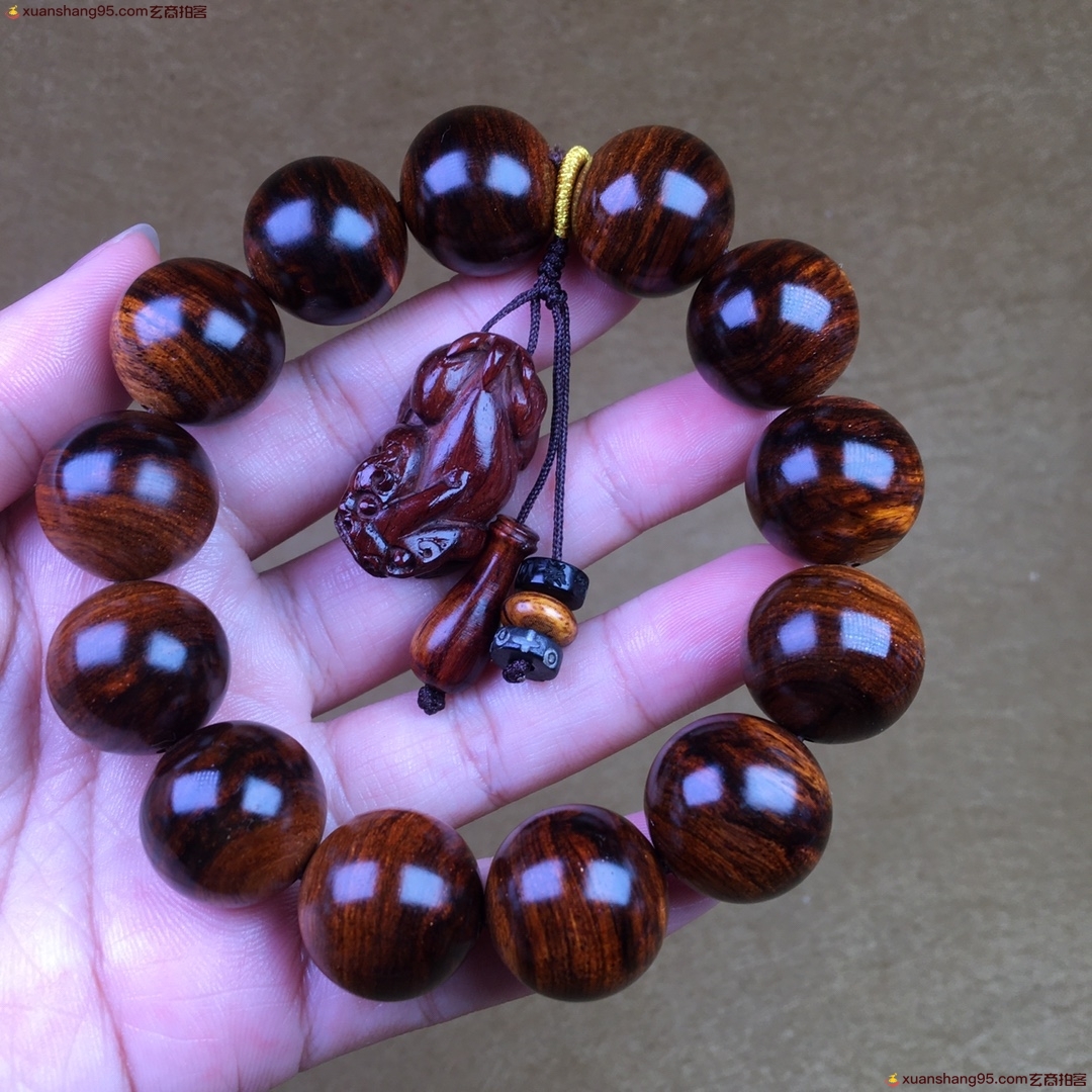 精品 海南黄花梨 手串,顶级材质,颗颗精选,满纹虎皮纹,纹理清晰流畅,尺寸:1.8厘米