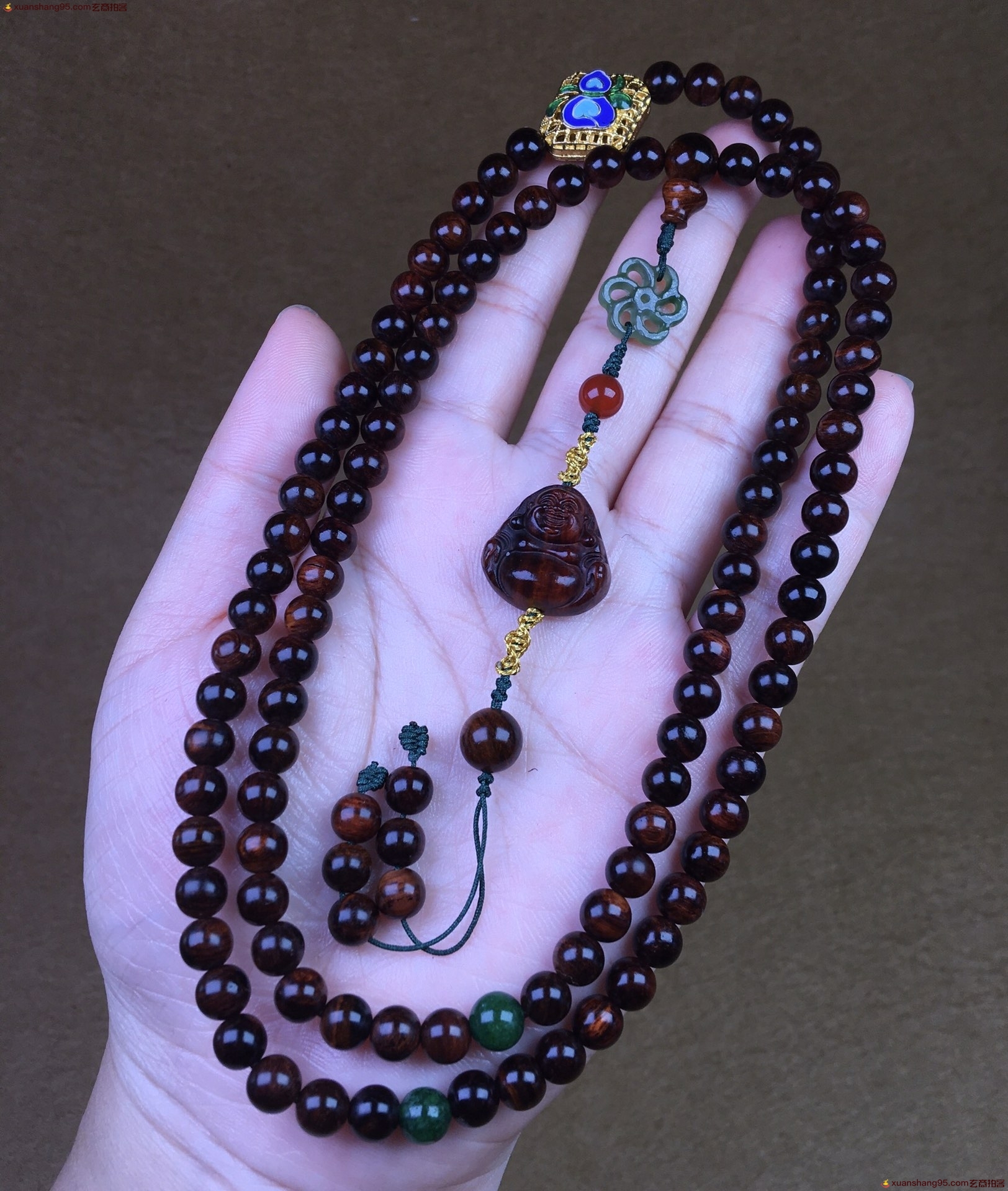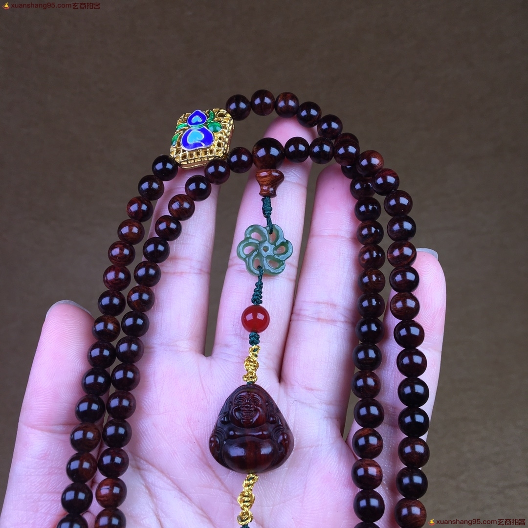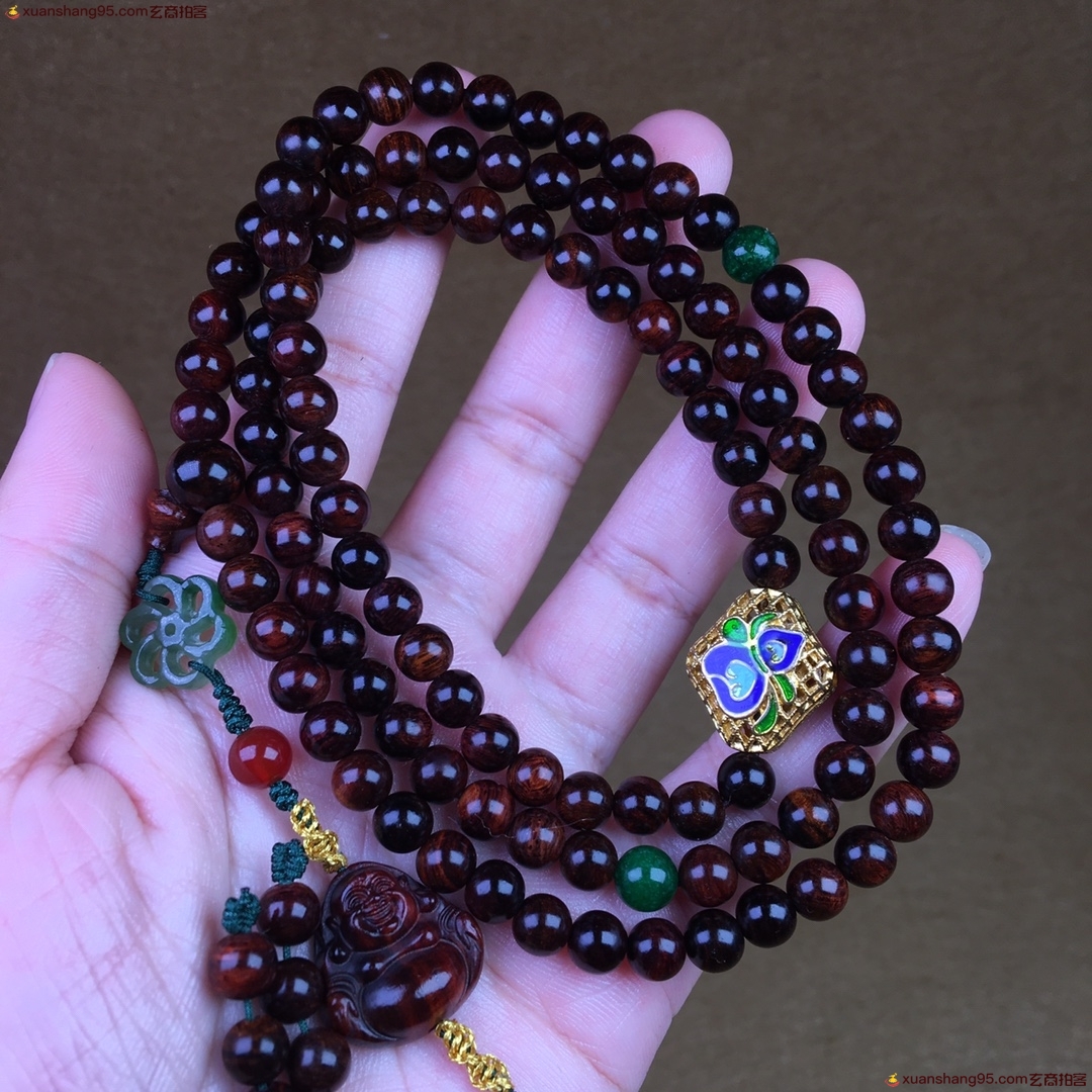 精品 海南黄花梨 108颗 佛珠,颗颗精选紫油梨,高油密,搭配弥勒佛吊坠,和田玉,景泰蓝配件,精致美观,完美无瑕,*值性价比。 尺寸:0.6厘米