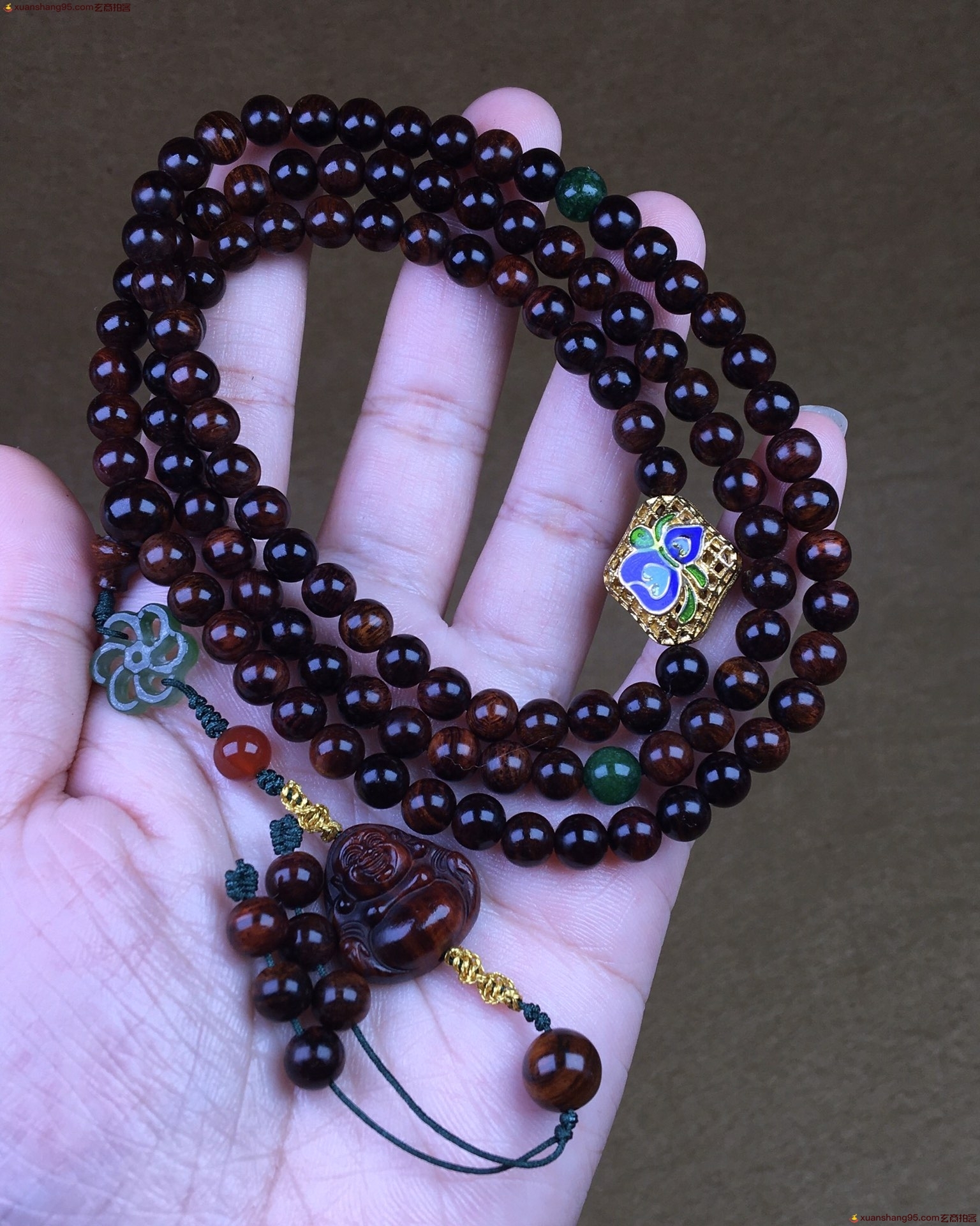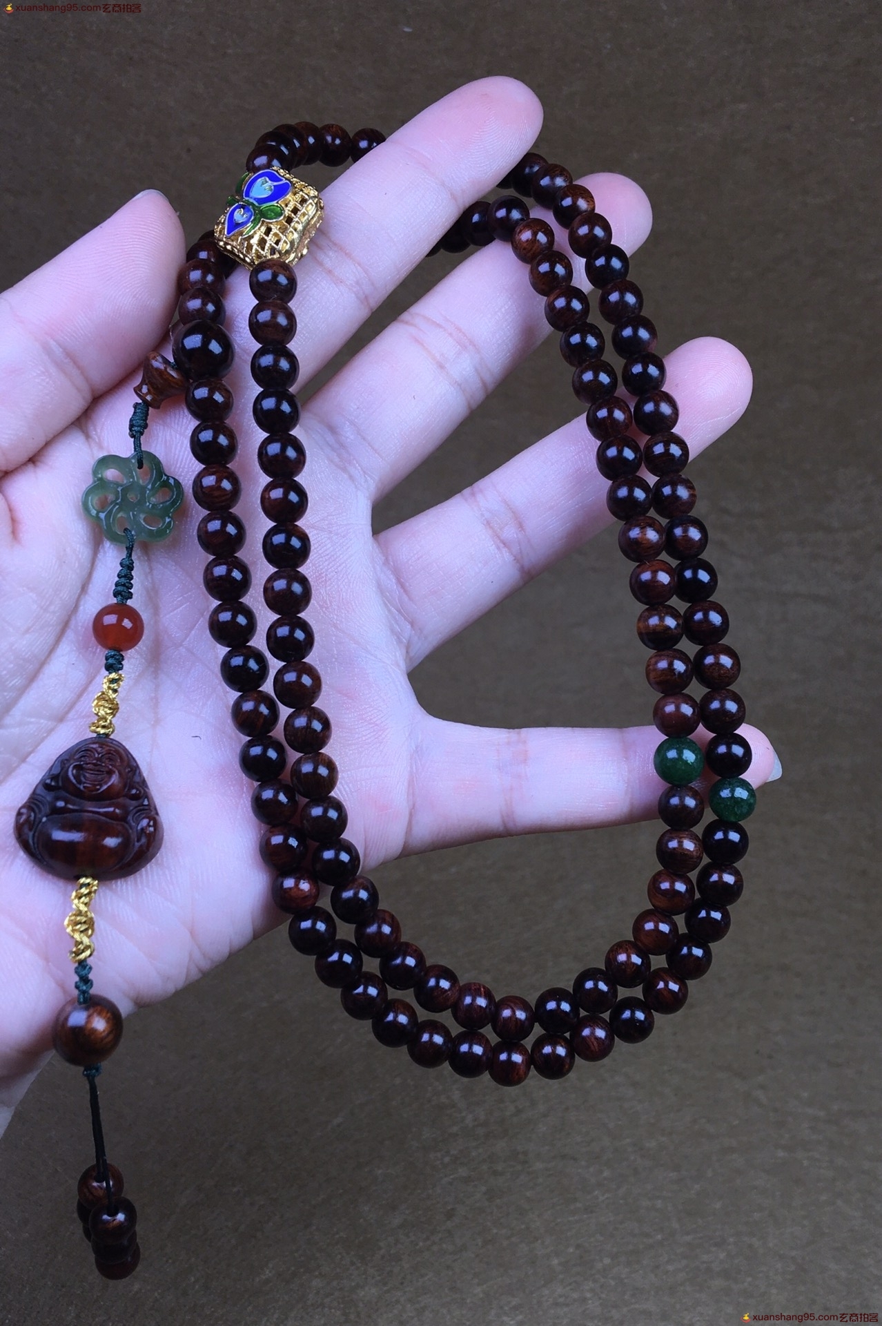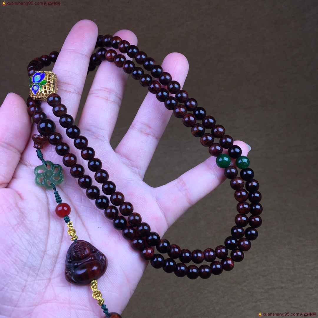 精品 海南黄花梨 108颗 佛珠,颗颗精选紫油梨,高油密,搭配弥勒佛吊坠,和田玉,景泰蓝配件,精致美观,完美无瑕,*值性价比。 尺寸:0.6厘米