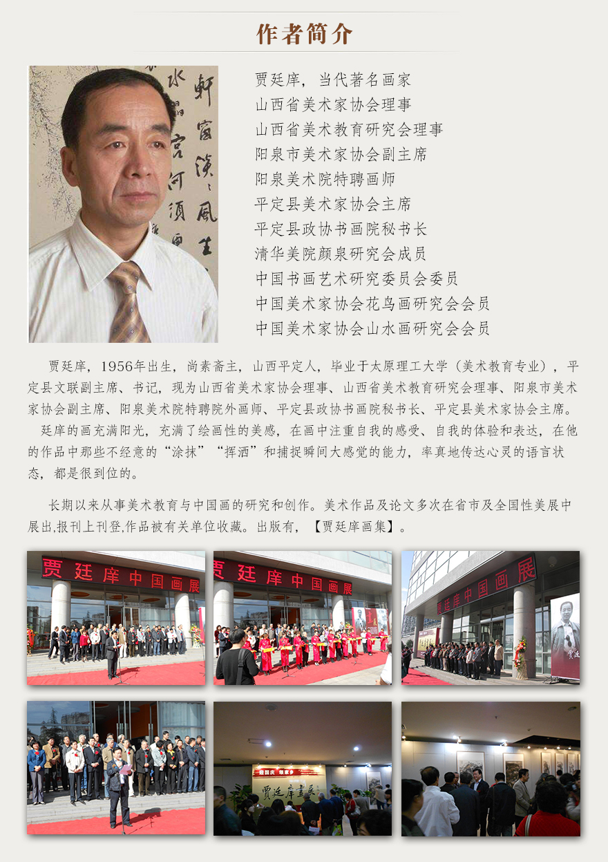 贾廷庠,1956年出生,山西省美术家协会理事、山西省美术教育研究会理事、阳泉市美术家协会副主席、平定县美术家协会主席、平定县文联副主席、书记。 贾老师的画充满阳光,充满了绘画性的美感,在画中注重自我的感受、自我的体验和表达。具有高水准的书画艺术家。作品以笔法精湛、画功深厚、严谨细腻、清新富丽、巧妙灵动、内涵丰富著称。