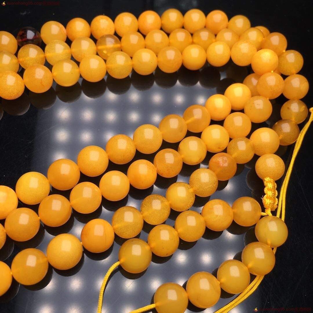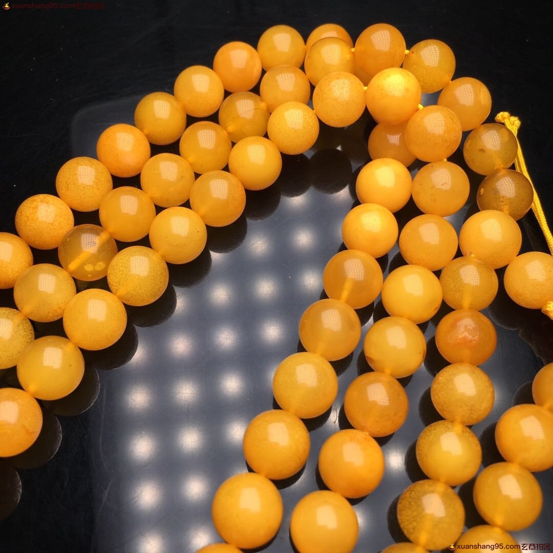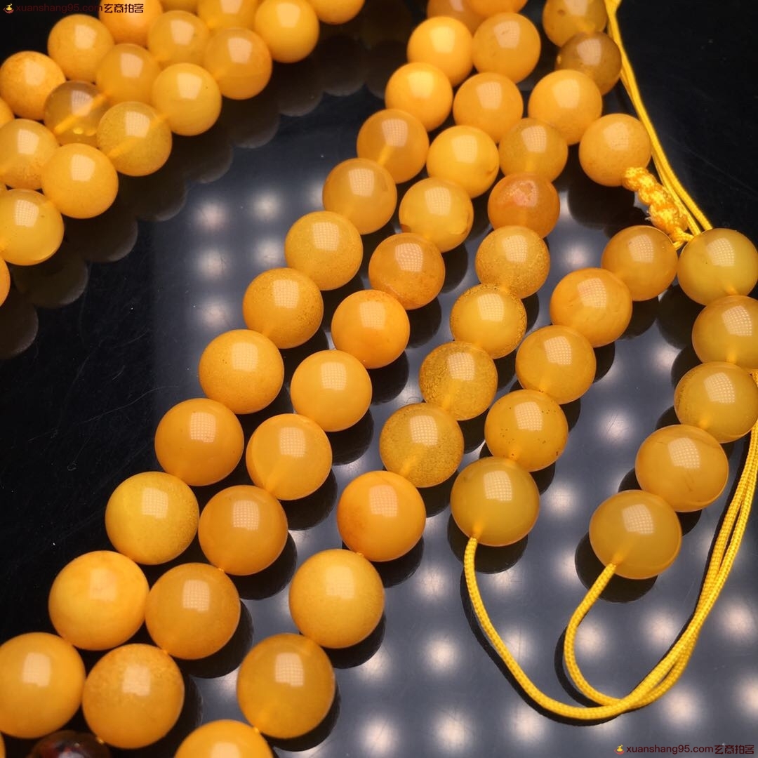 精品 鸡油黄老密 108颗佛珠,颜色亮丽,天然原矿,略带瑕疵,尺寸:8.9毫米,重量:46.89克。静待有缘人,