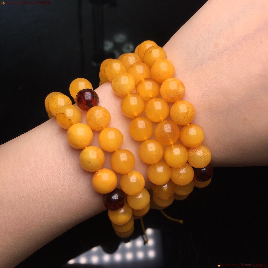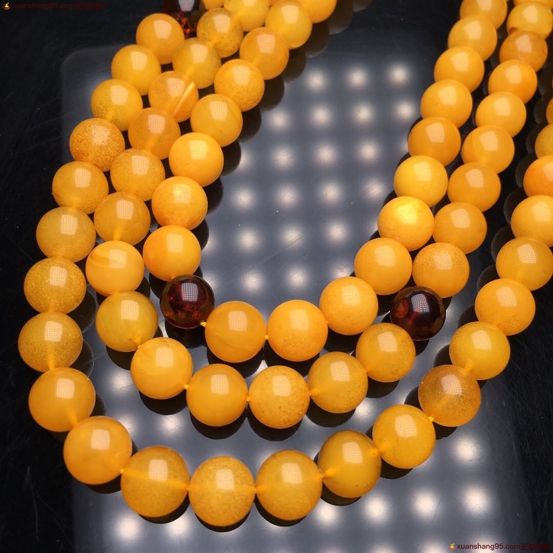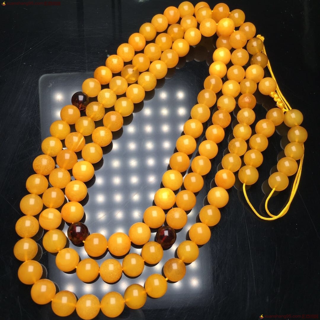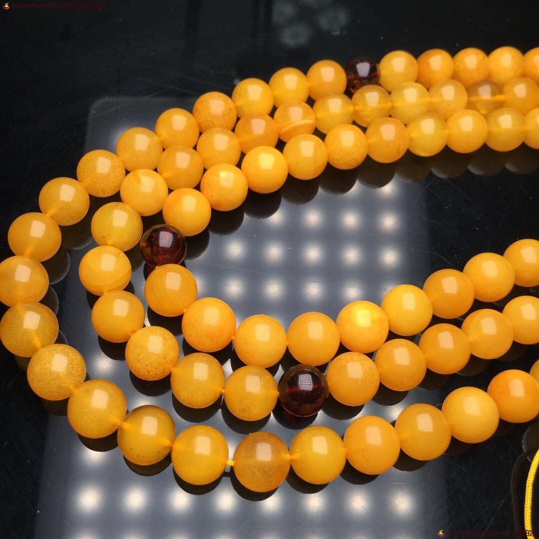 精品 鸡油黄老密 108颗佛珠,颜色亮丽,天然原矿,略带瑕疵,尺寸:8.9毫米,重量:46.89克。静待有缘人,