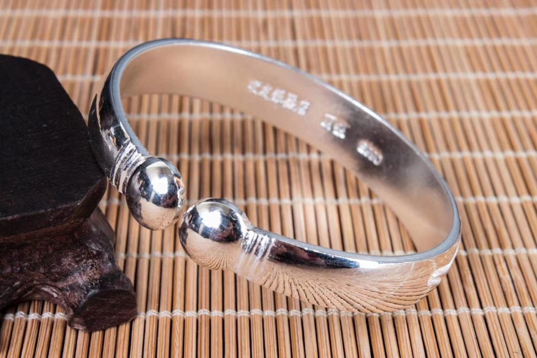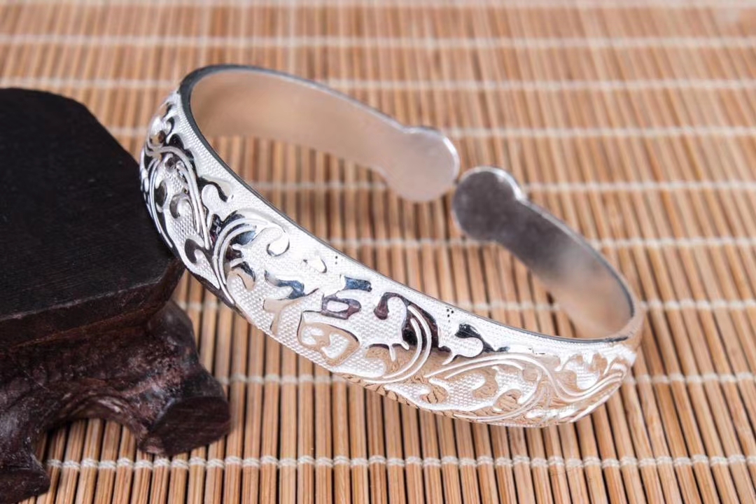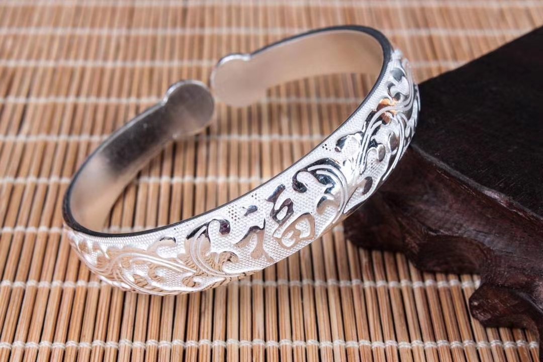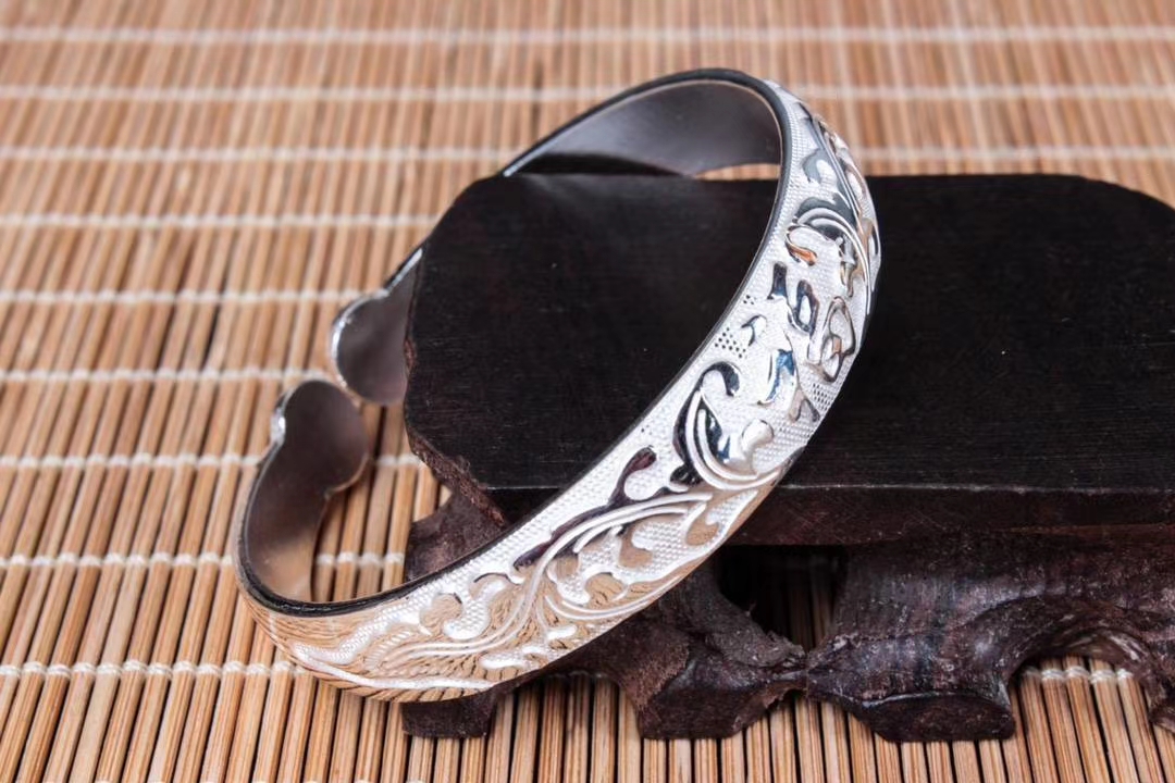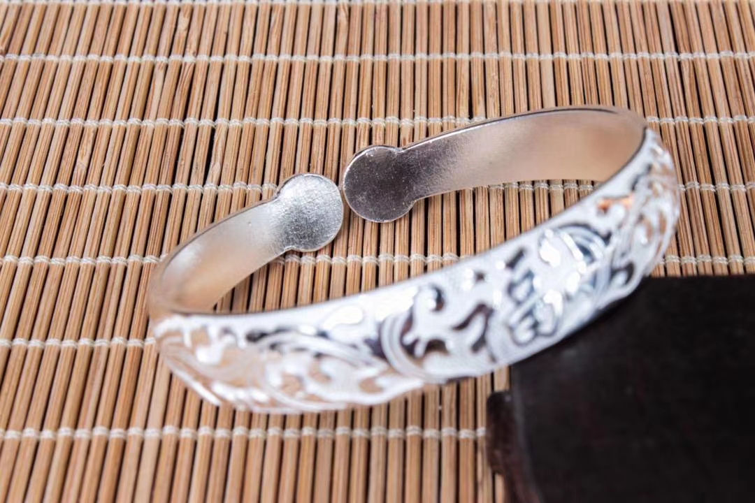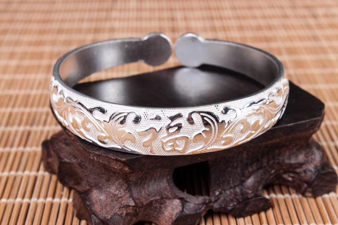 复古福字纯银活口手镯,圈口可调节。丽江雪花银意,国际足银s990~s999,可食用银,纯手工打造。宽度:1.22CM,内径:5.6CM 左右,克重约:52g左右。
