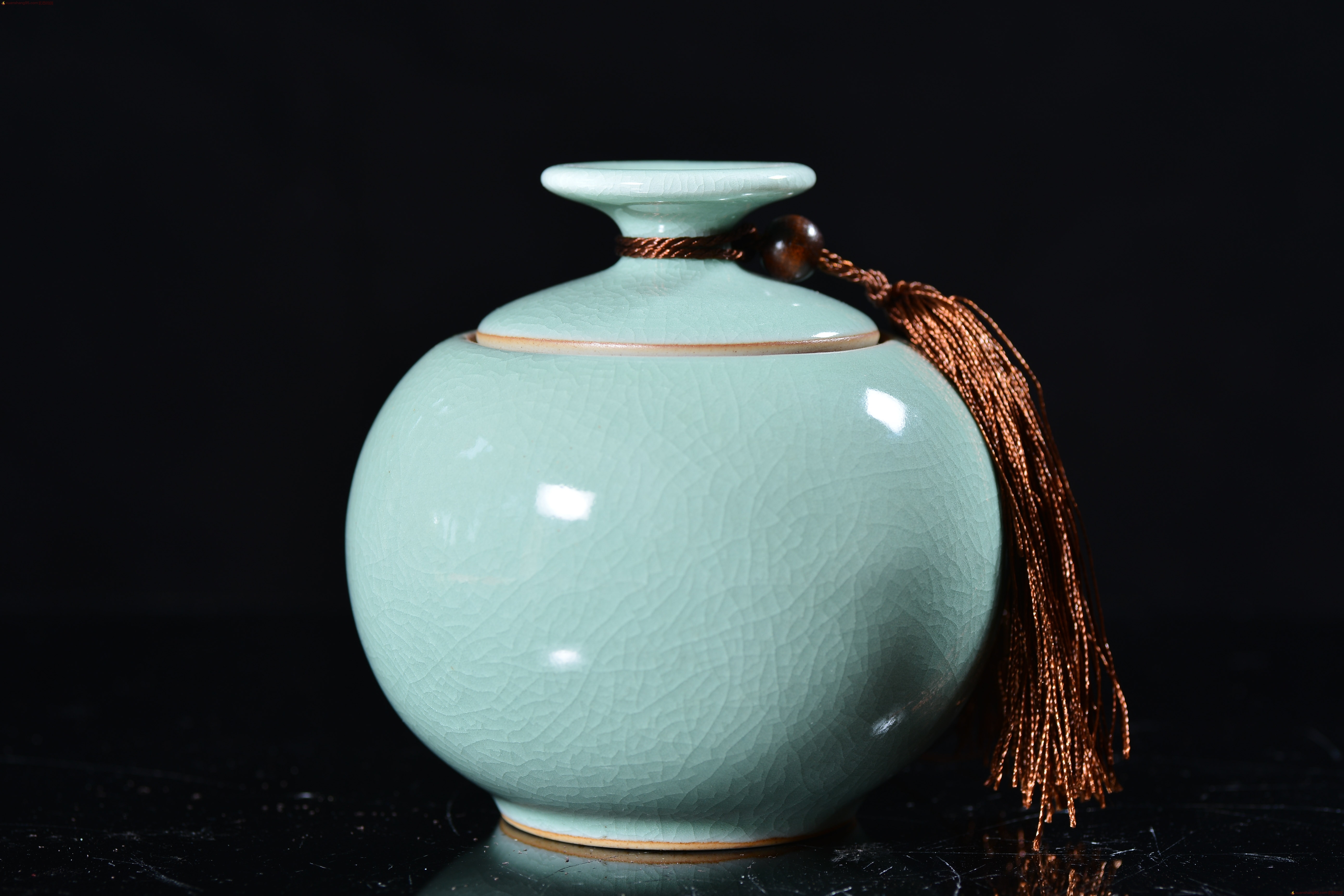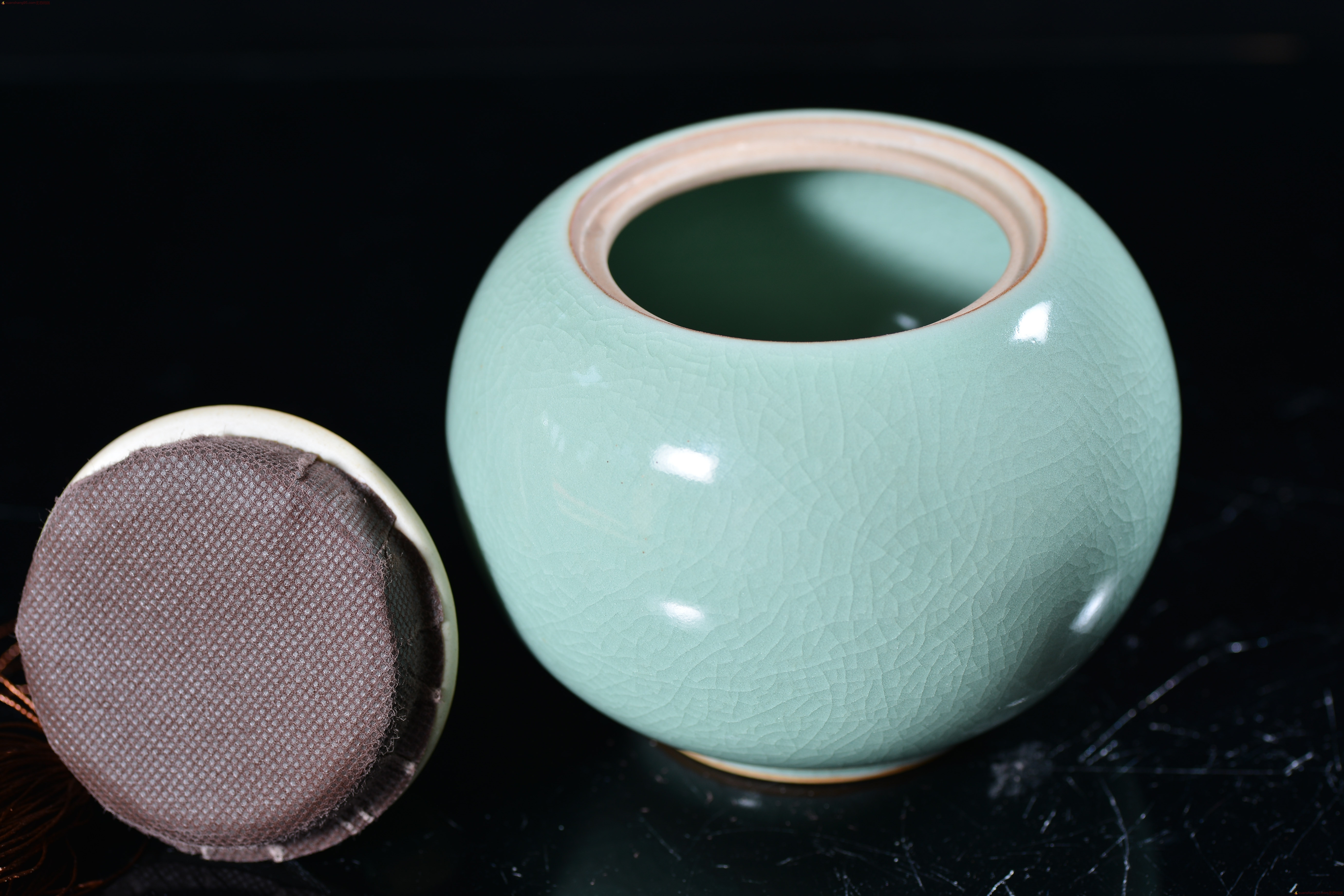 汝瓷 豆绿釉 茶叶罐 采用汝州本地天然原矿石,研磨精工制作而成,做工一流,设计巧妙,杯内上满釉,开片精美,收藏使用佳品。 汝瓷—中国五大名瓷之一,创烧于北宋晚期,为宫廷御用瓷器。金灭北宋后,汝瓷也随之消亡。其开窑时间前后只有二十年,由于烧造时间短暂,传世亦不多,在南宋时,汝瓷已经非常稀有。现今存世的汝瓷,一般认为有65件,其中台北故宫博物院23件,北京故宫博物院17件,上海博物馆8件,英国戴维基金会7件,其他散藏于美、日等博物馆和私人收藏约10件。所以才有“家财万贯,不如汝瓷一片”。 作者杨聚斌出生于1