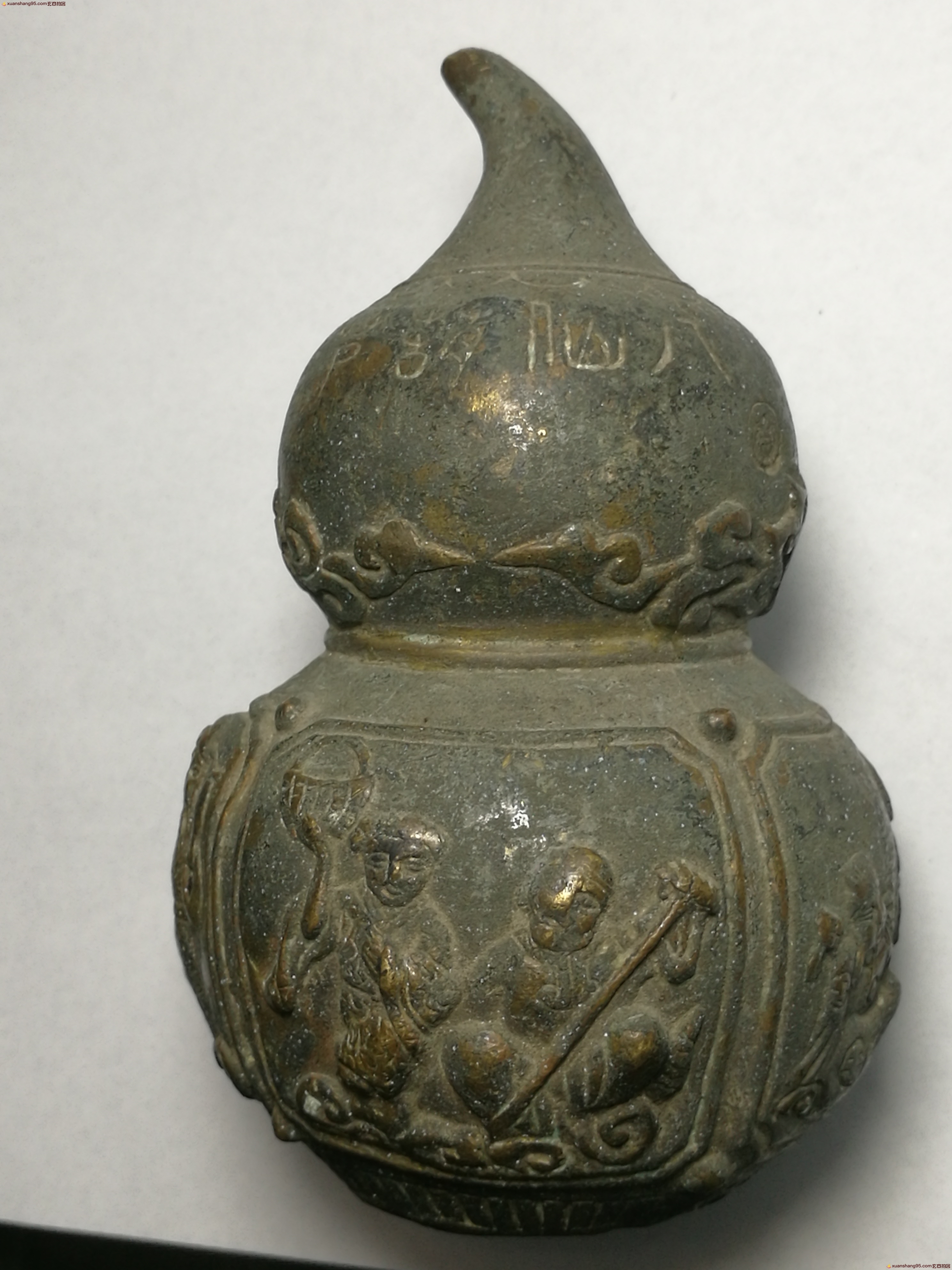 八仙葫芦为纯铜制做,品相老旧有一定的年份,葫身四面有精美的八仙人物图案,是少见稀有工艺品、葫芦规格Ф73*高125mm,重量362克;在神话和故事里,葫芦始终与神仙和英雄为伴,如八仙中的铁拐李,寿星南*翁,济公和尚等都身背葫芦或腰悬葫芦,被认为是给人类带来福禄、驱魔辟邪的灵物。所以葫芦自古以来就是"福禄吉祥"、"健康长寿"的象征,也是保宅护家的良品。 葫芦用作除病之用,只须挂在病者的睡床尾或摆放在病者的睡侧。就可以吸取病人身上的病气,使其快速的好起来.如果是健康人,可以吸走人身上的晦气,提升运势。 葫芦挂