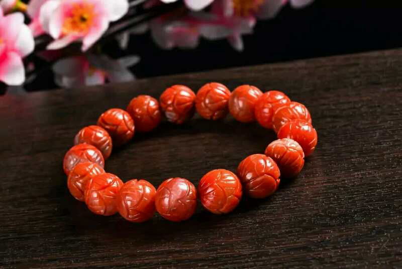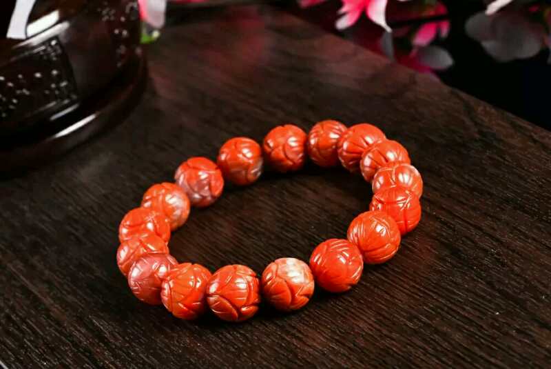 此南红手链为原矿川料柿子红雕刻莲花,雕刻精细,柿子红,很有保留价值,佩戴效果大方得体!