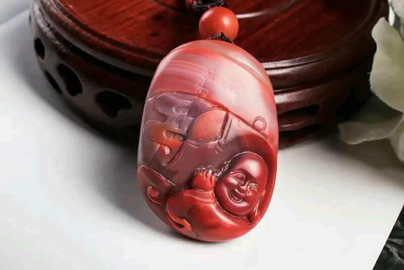 此笑佛挂件为九口产出的原矿南红玛瑙老料,颜色也很丰富,雕刻笑佛位置是玫瑰红,整块南红不论质感还是润泽性都非常好,玉质细腻,佩戴高雅大气。 精雕刻一笑佛,大耳双垂,弯眉笑眼,开口大笑完整度和品质越好,其市场价格和收藏价值也就越高。
