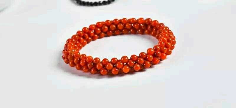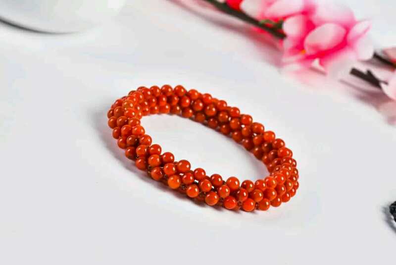 此款南红为原矿川料柿子红,由4mm的珠珠编织成手链,色泽漂亮,润度高,水头足,质地均匀,给人时尚的感觉。