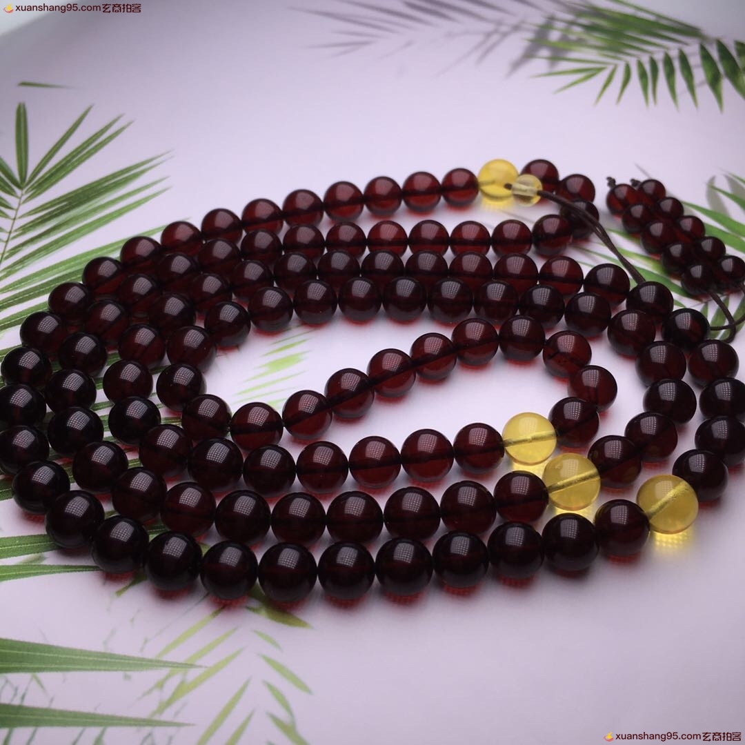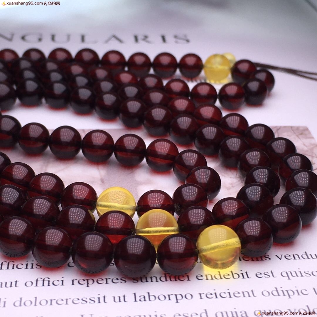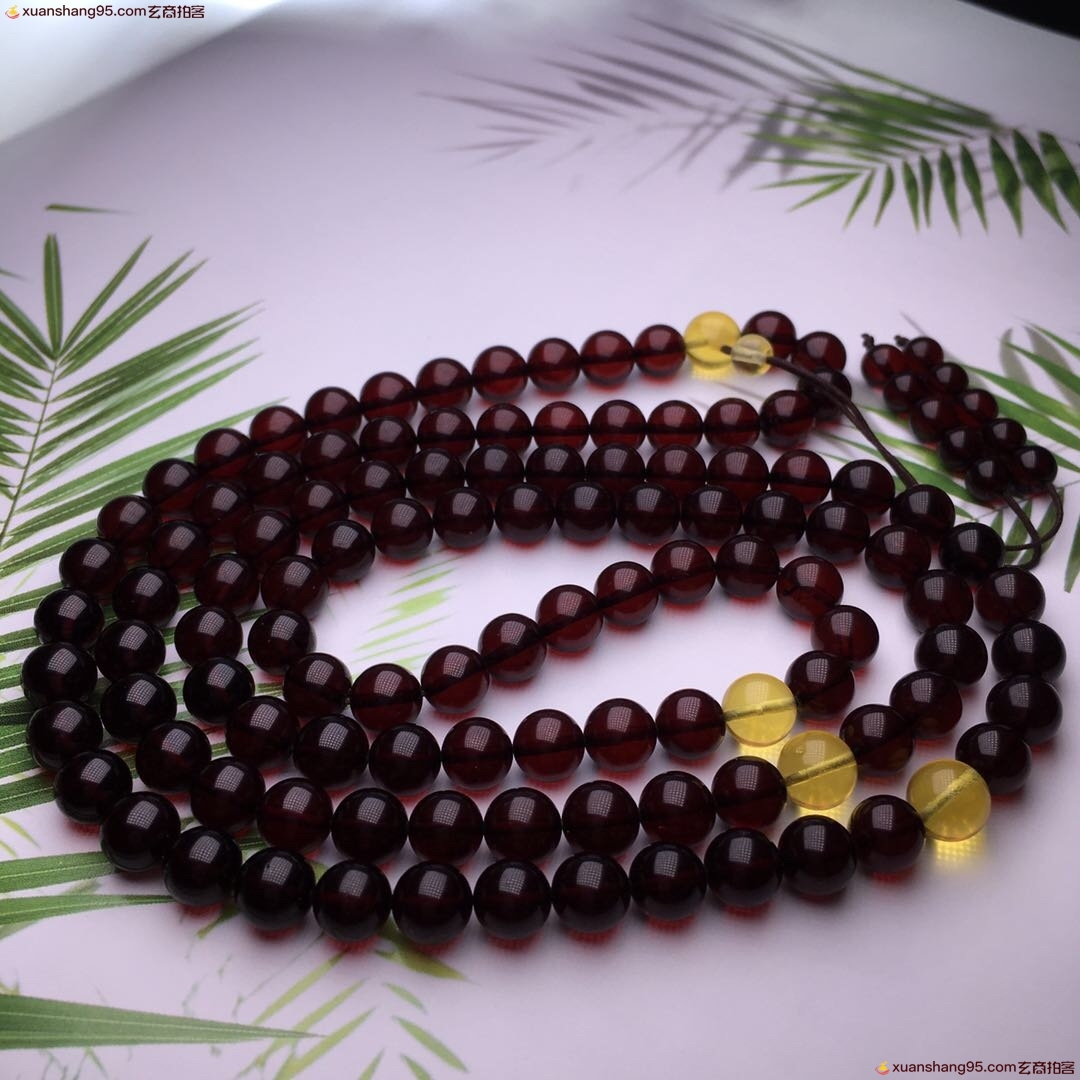精选 净水血珀 108颗 挂链,纯天然原矿无优化,最美酒红色,7毫米 酒红色血珀,净水通透,静待有缘人,重量:24.6克