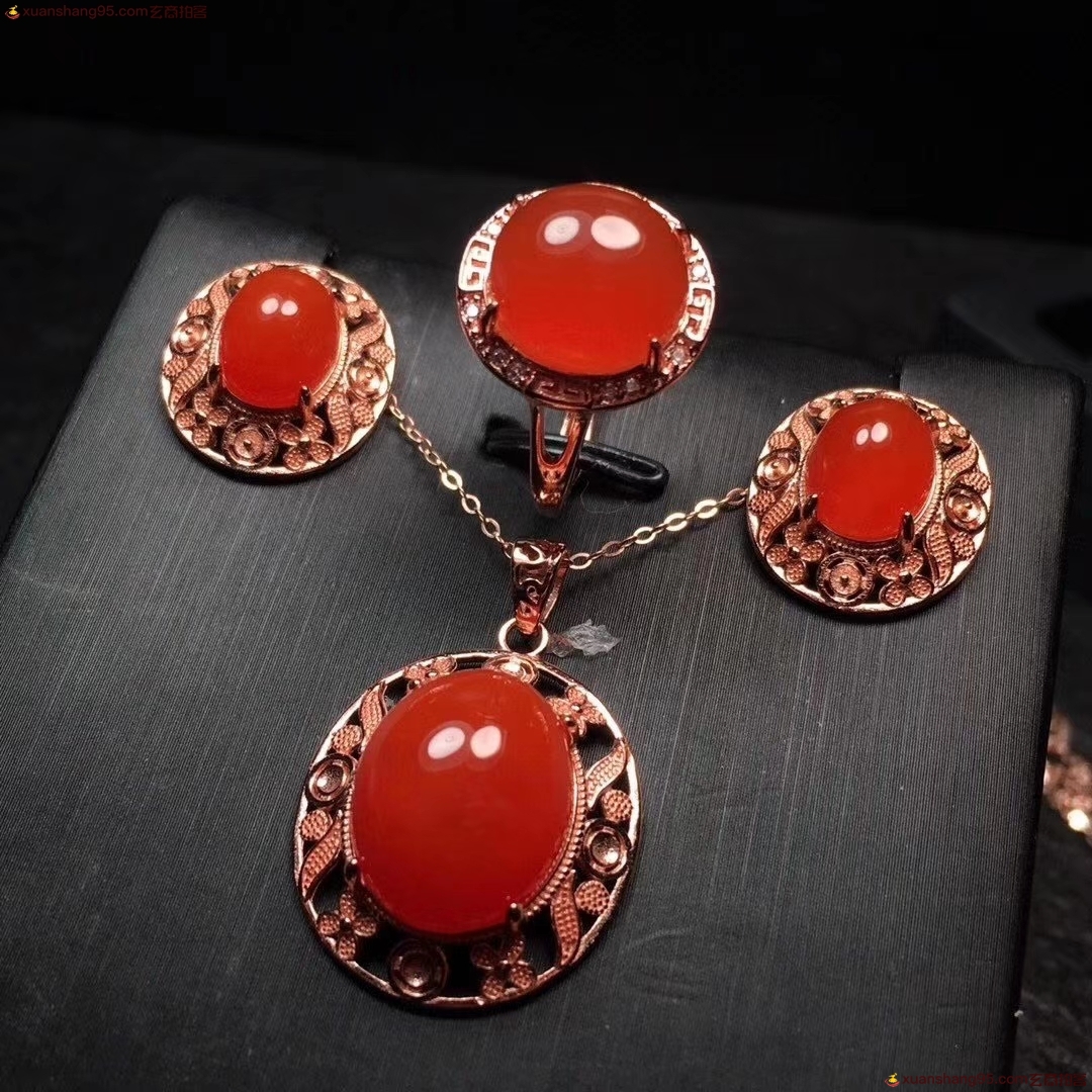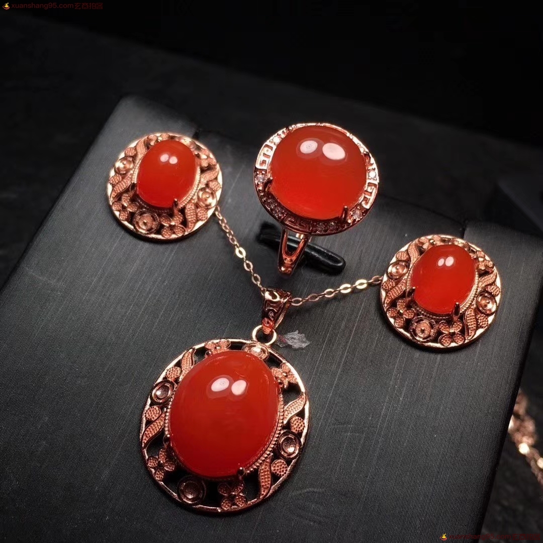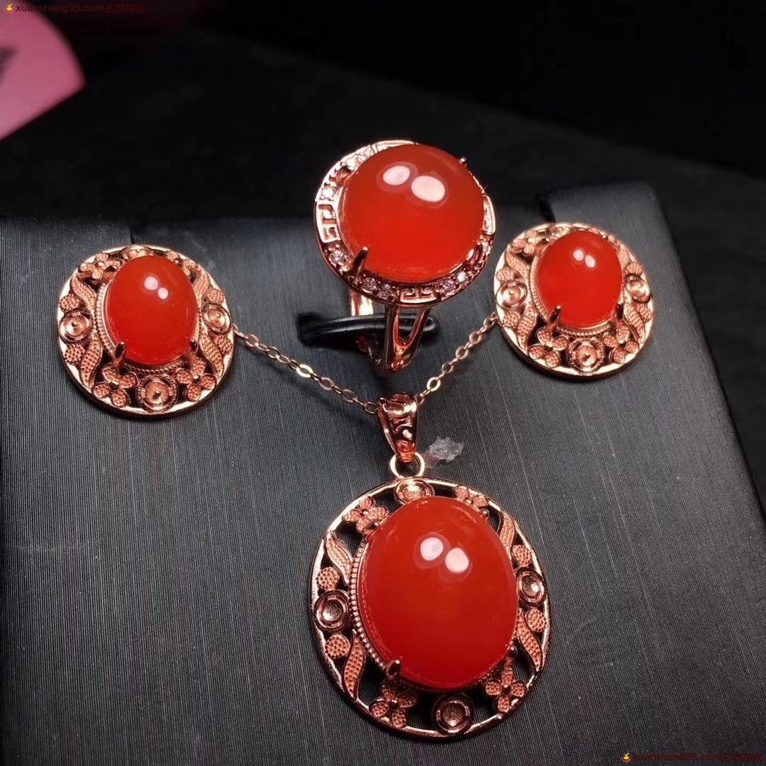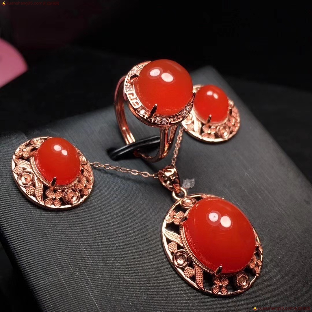 *品 保山原矿冰红 套装,品质见图,高冰起荧光无杂裂,S925银镀玫瑰金精工镶嵌,规格:戒指直径10.4*11.4毫米 耳坠8.8*10毫米 吊坠12*15毫米 总重;13.9克