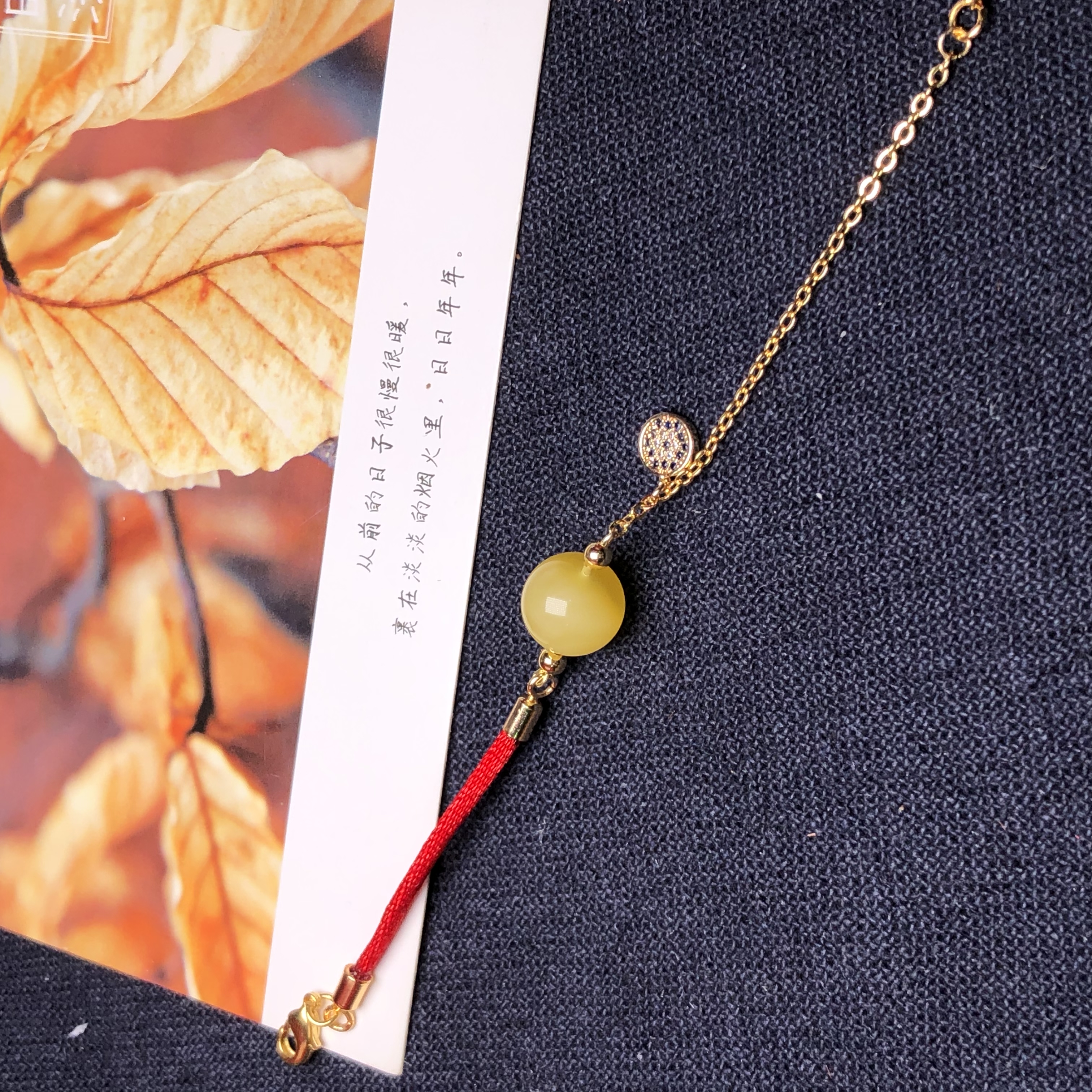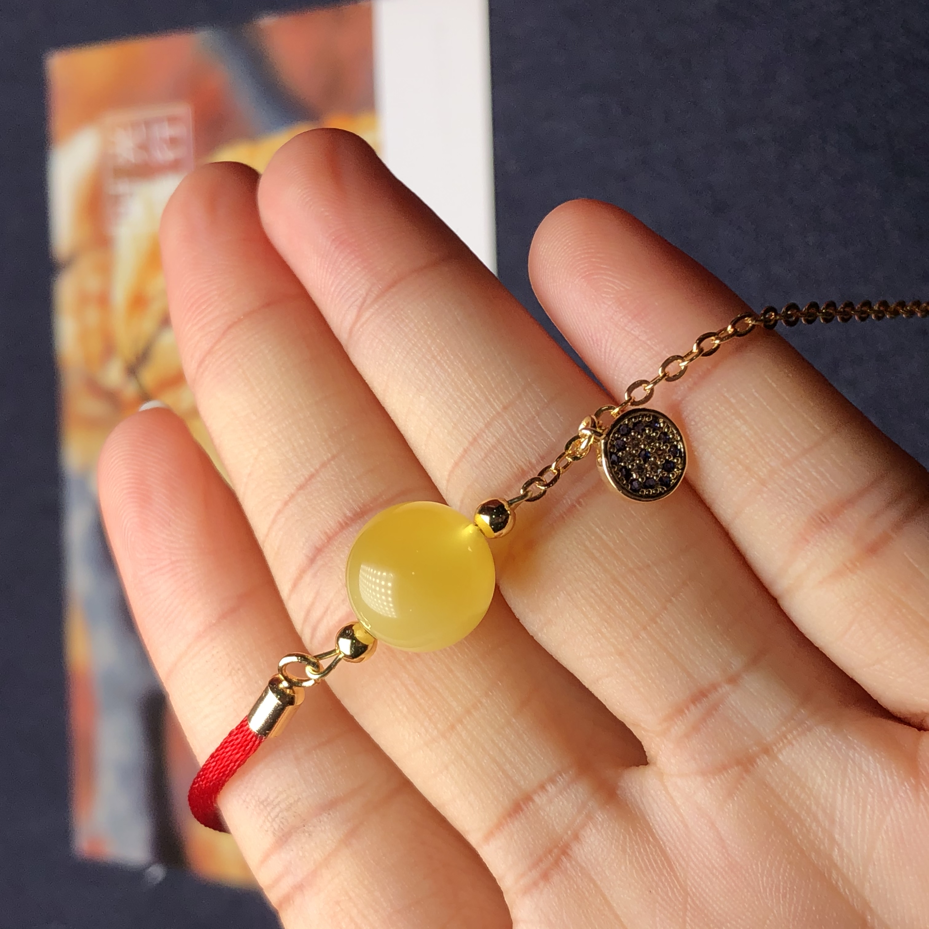 新款红绳手链,珠子规格约9-10mm,天然蜜蜡 进口14k包金配链 默认长度约16cm