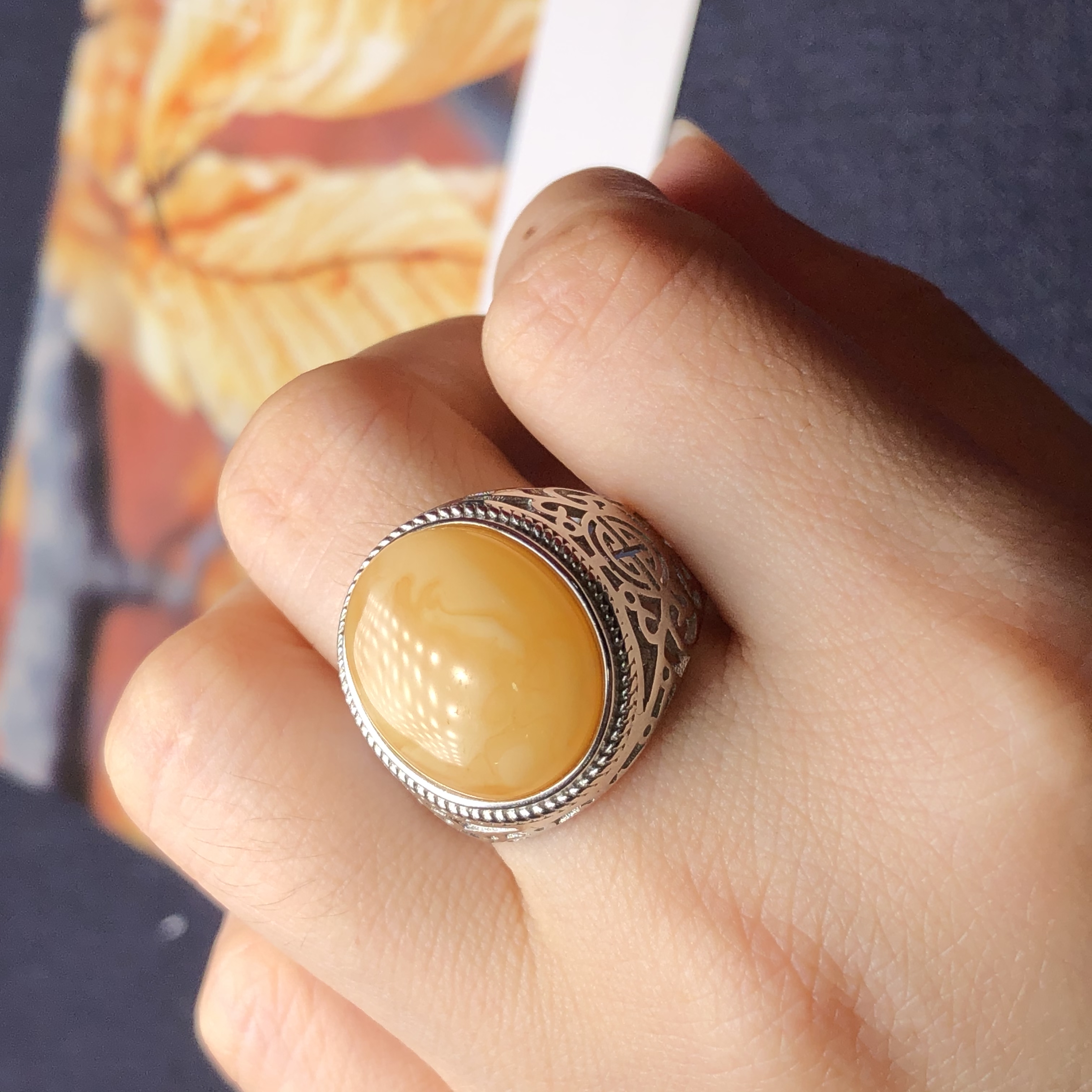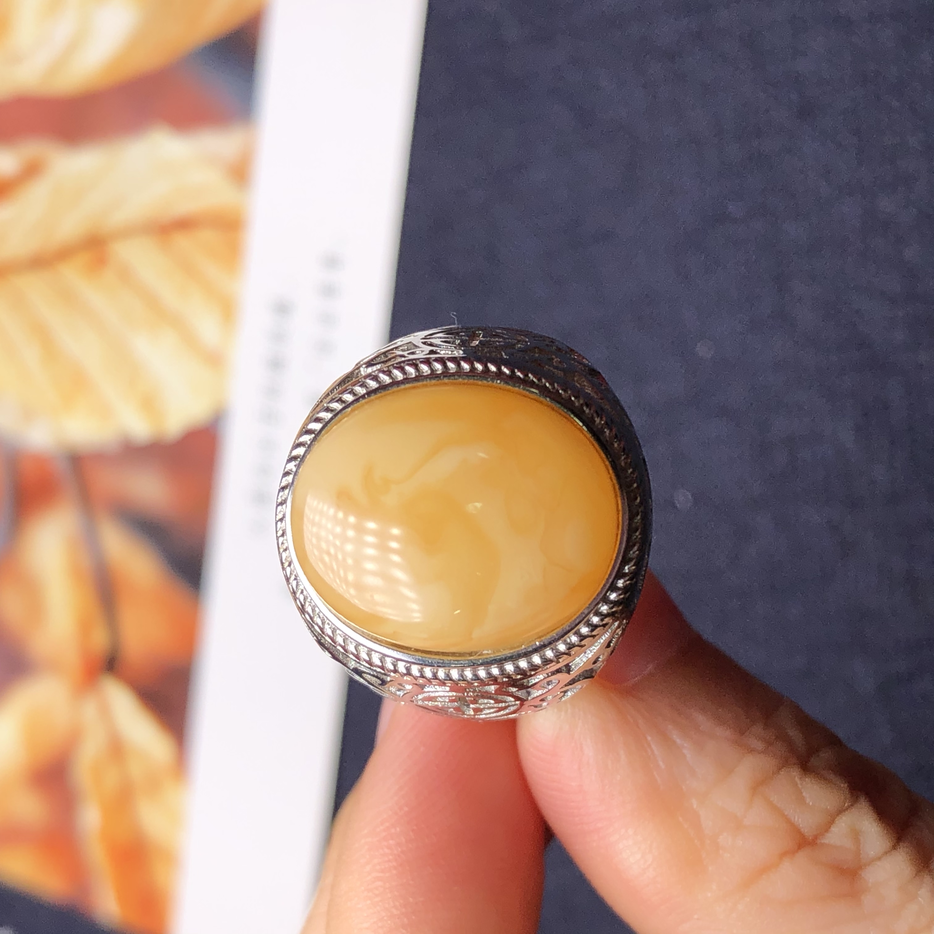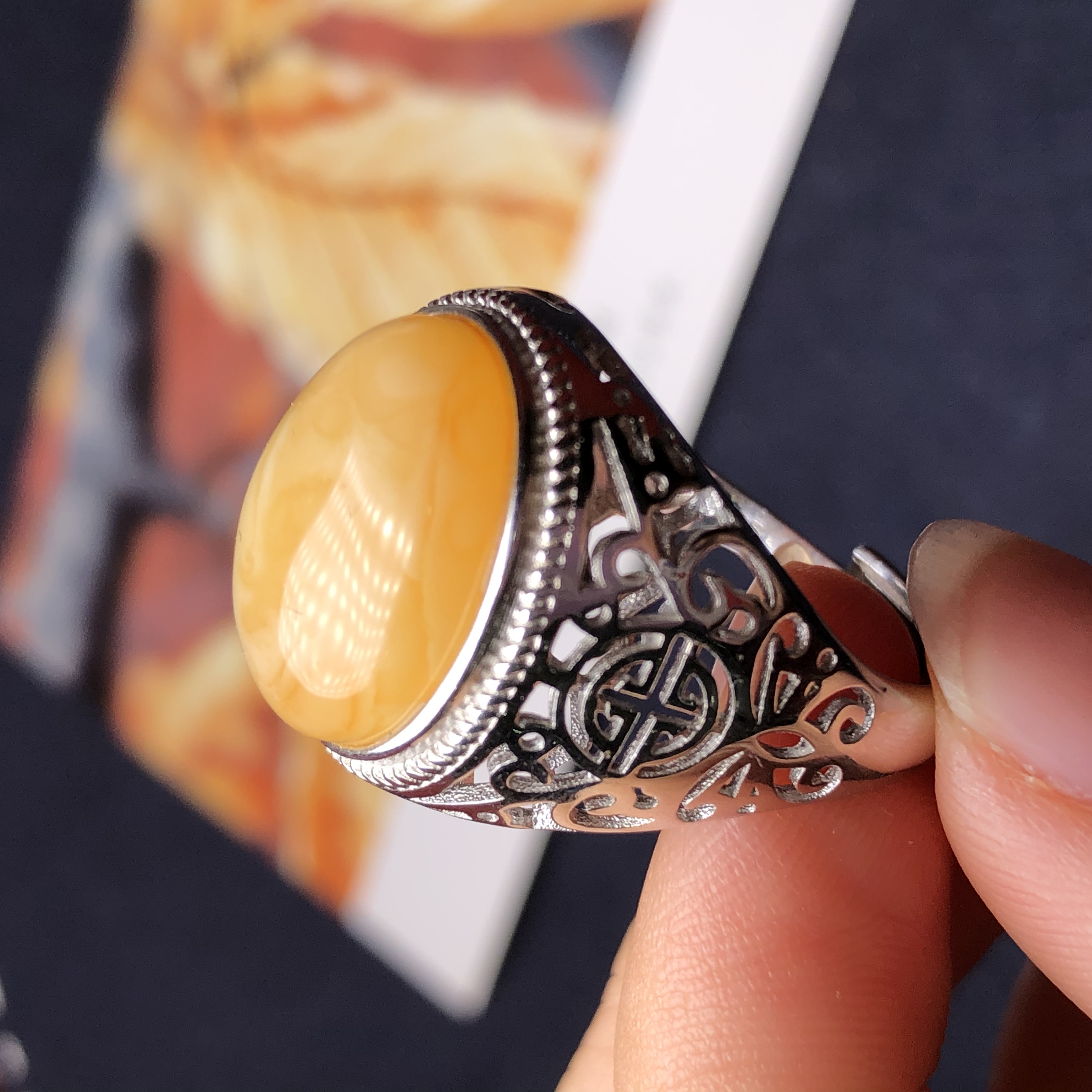 本拍品为俄料鸡油黄满蜜霸气男戒,配戴大气。天然无烤色无优化。材质:925银镶嵌,尺寸约16.6×13.6×9.1mm