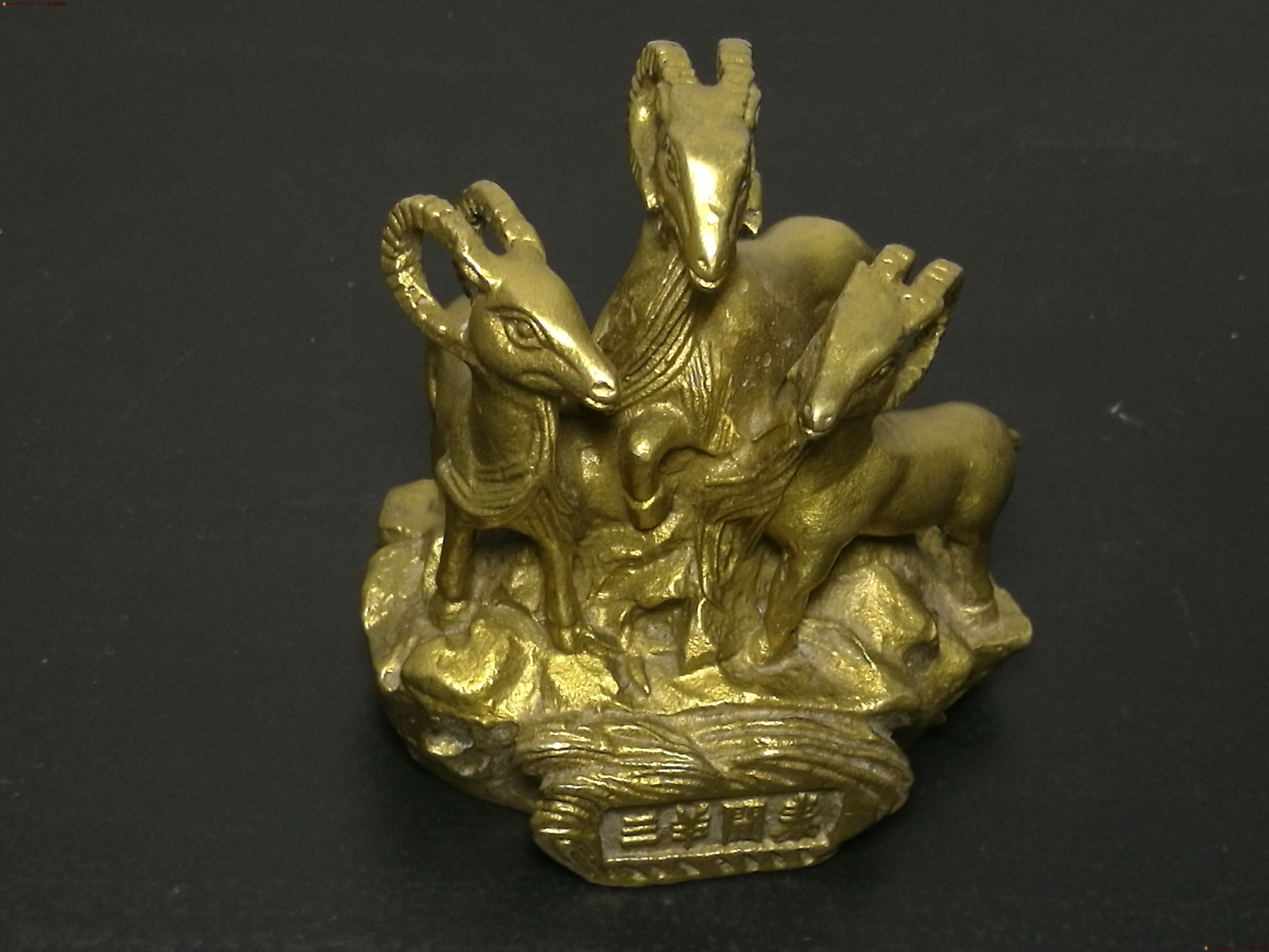 材质为铜鎏金,做工精美,长宽高规格76*65*80mm、重量412克;中国古代阳与羊同音,羊即为阳。“三阳”依照字面来析,解释为三个太阳比较直观,即早阳、正阳、晚阳。亦含勃勃生机、也是兴旺发达,诸事顺遂的称颂。民间传说曾把青阳、红阳、白阳,分别代表过去、现在和将来。民间喜用的“三阳开泰”是一种吉祥语,它表示大地回春,万象更新的意义。