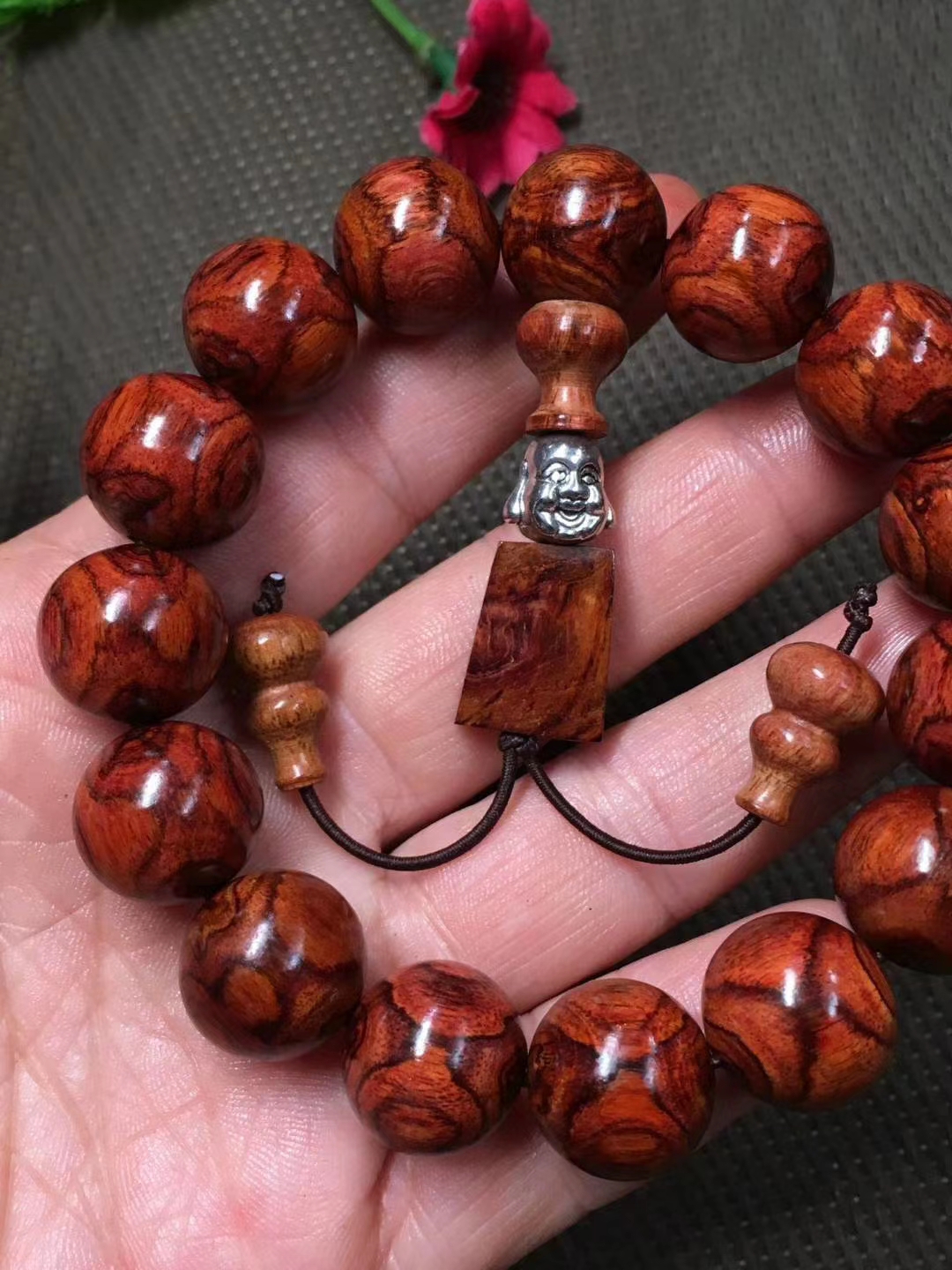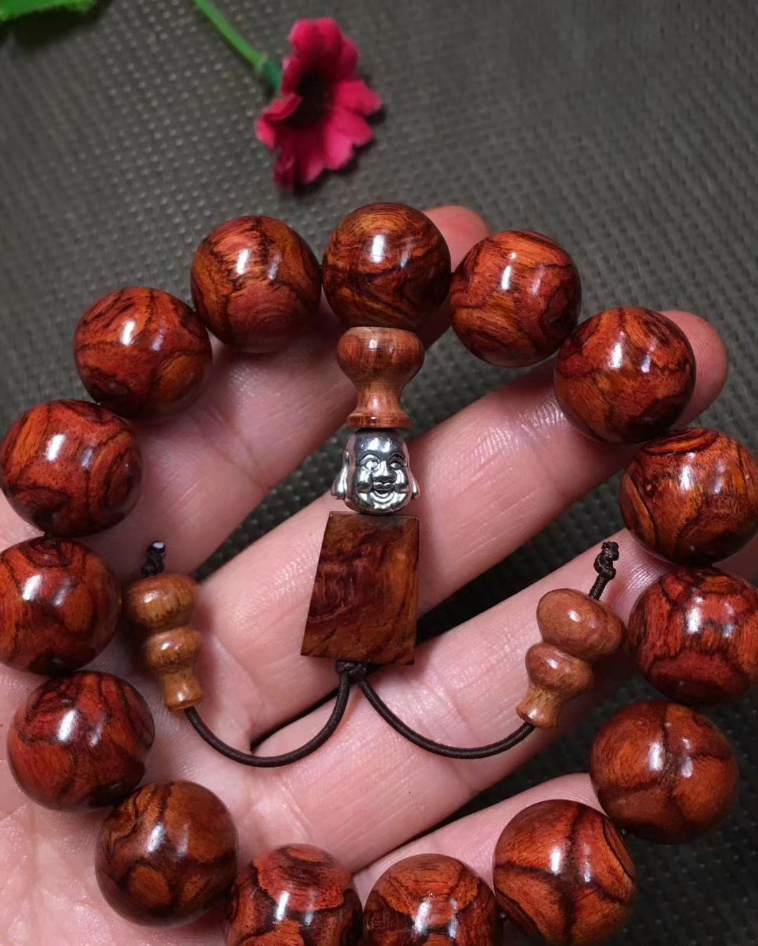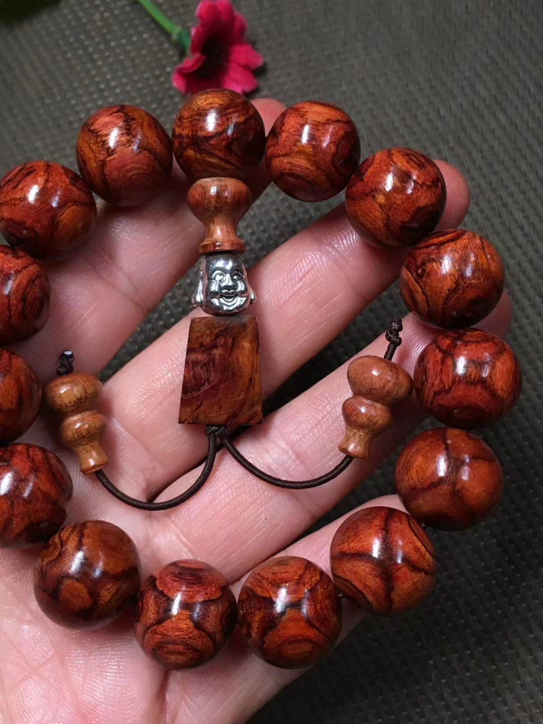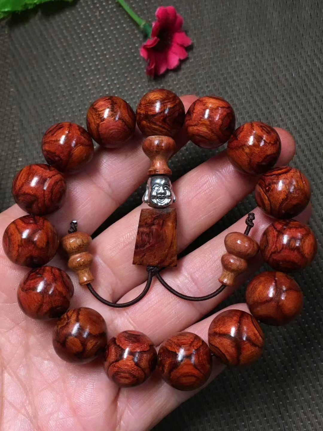 海南黄花梨 1.5手串 底色好,纹理对称,油性好,收藏佩戴佳品。尺寸1.5厘米,重量25克。