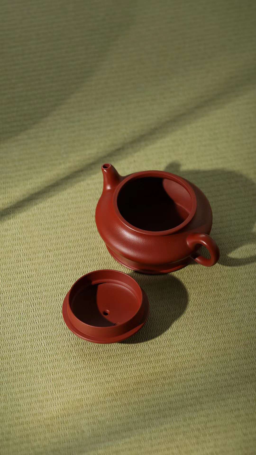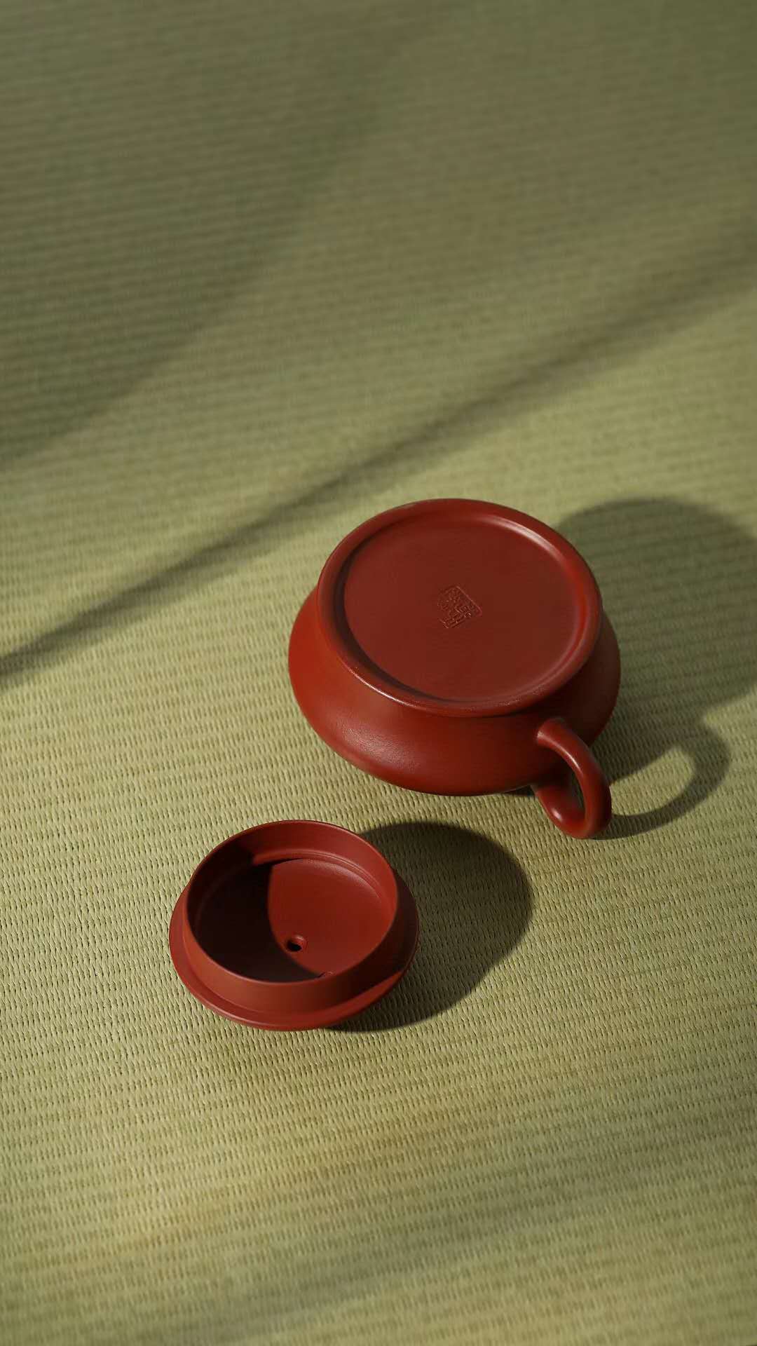 全手工虚扁· 原矿家藏朱泥·230cc·9孔 以简练的线条构成淳朴凝重的形体,空间明快,虚实和谐,线条柔和,整体雄浑肃穆,实属雅玩佳品。(尹诗绮制)