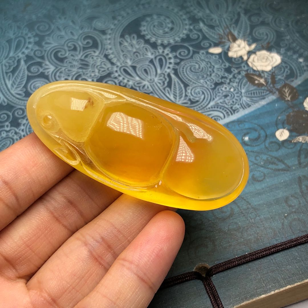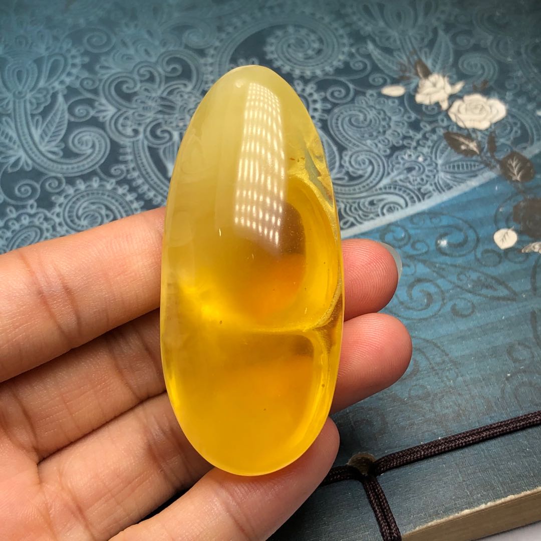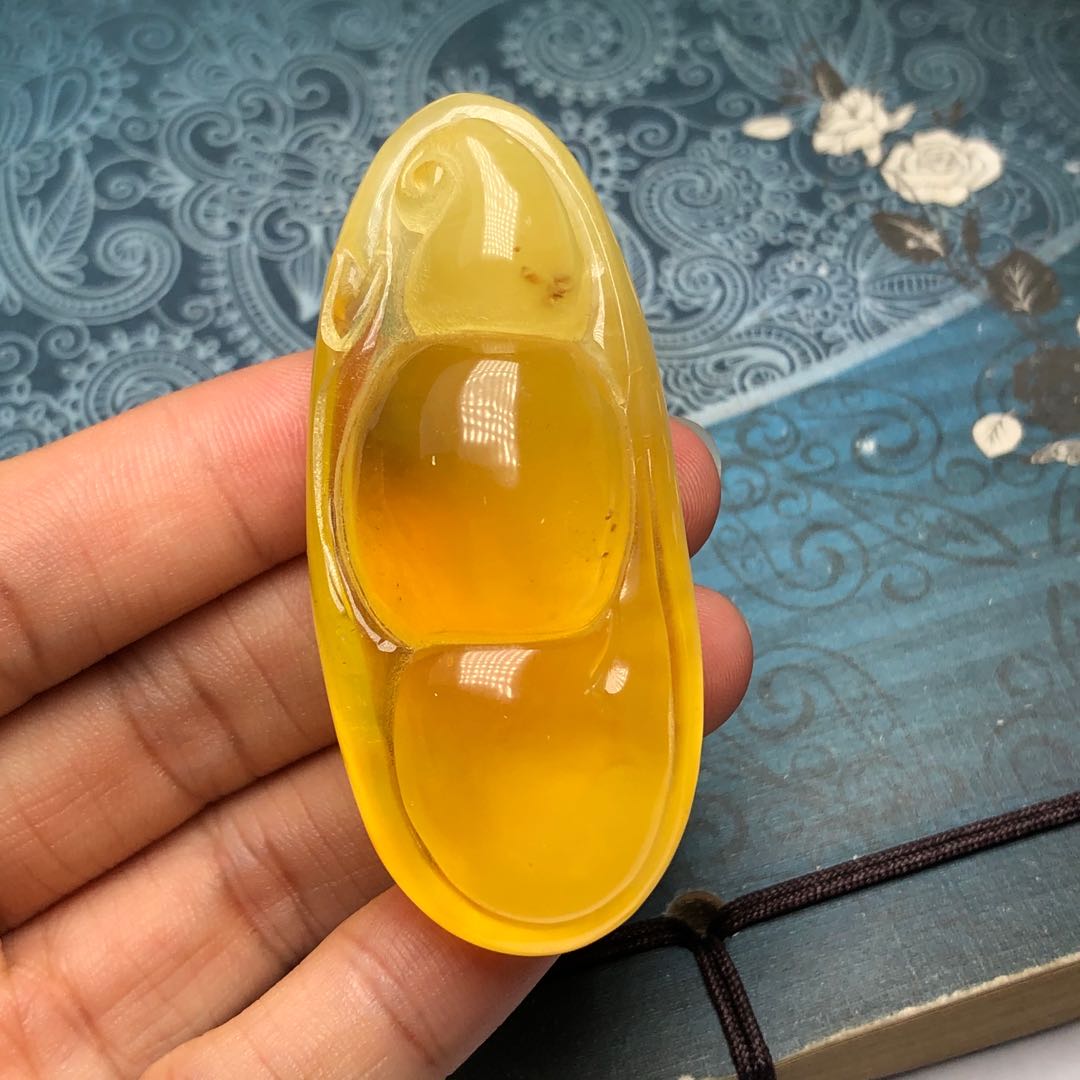此拍品为*品天然蜜蜡三元福豆雕刻件,寓意四季平安,有收获福气满满,很特别带有一点千万年的植物体。吊坠重约15.3克,尺寸约59.7×26.6×19mm。