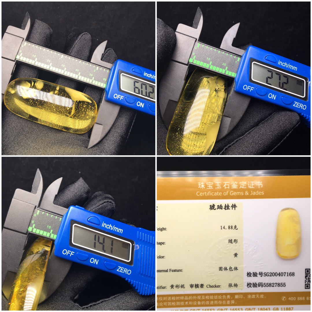 *品 琥珀挂件 经典教科书版,金沙小猛牌,*致美,全品无杂裂,尺寸如图所示,重量14.88克。附带鉴定证书和精美礼盒。