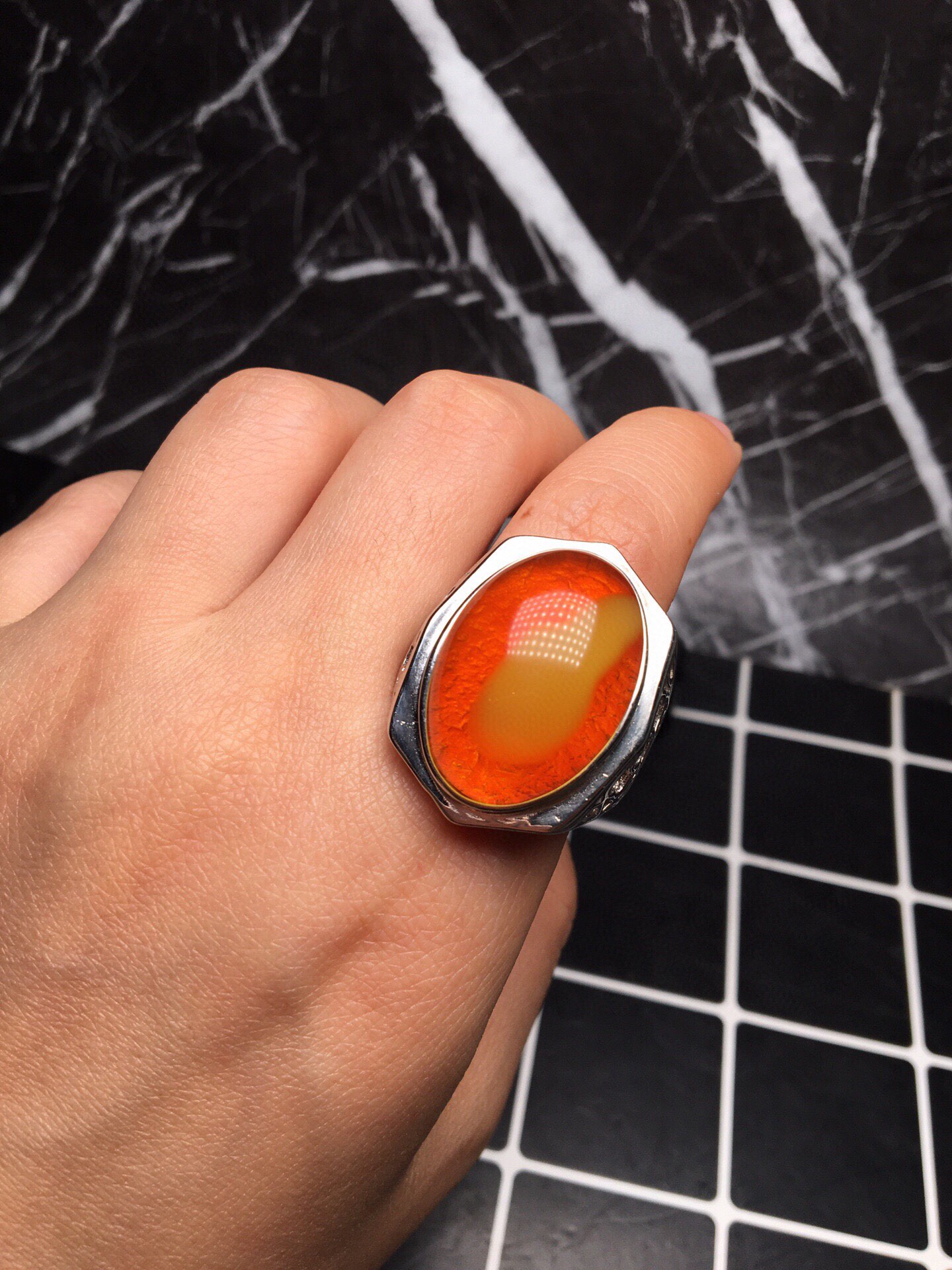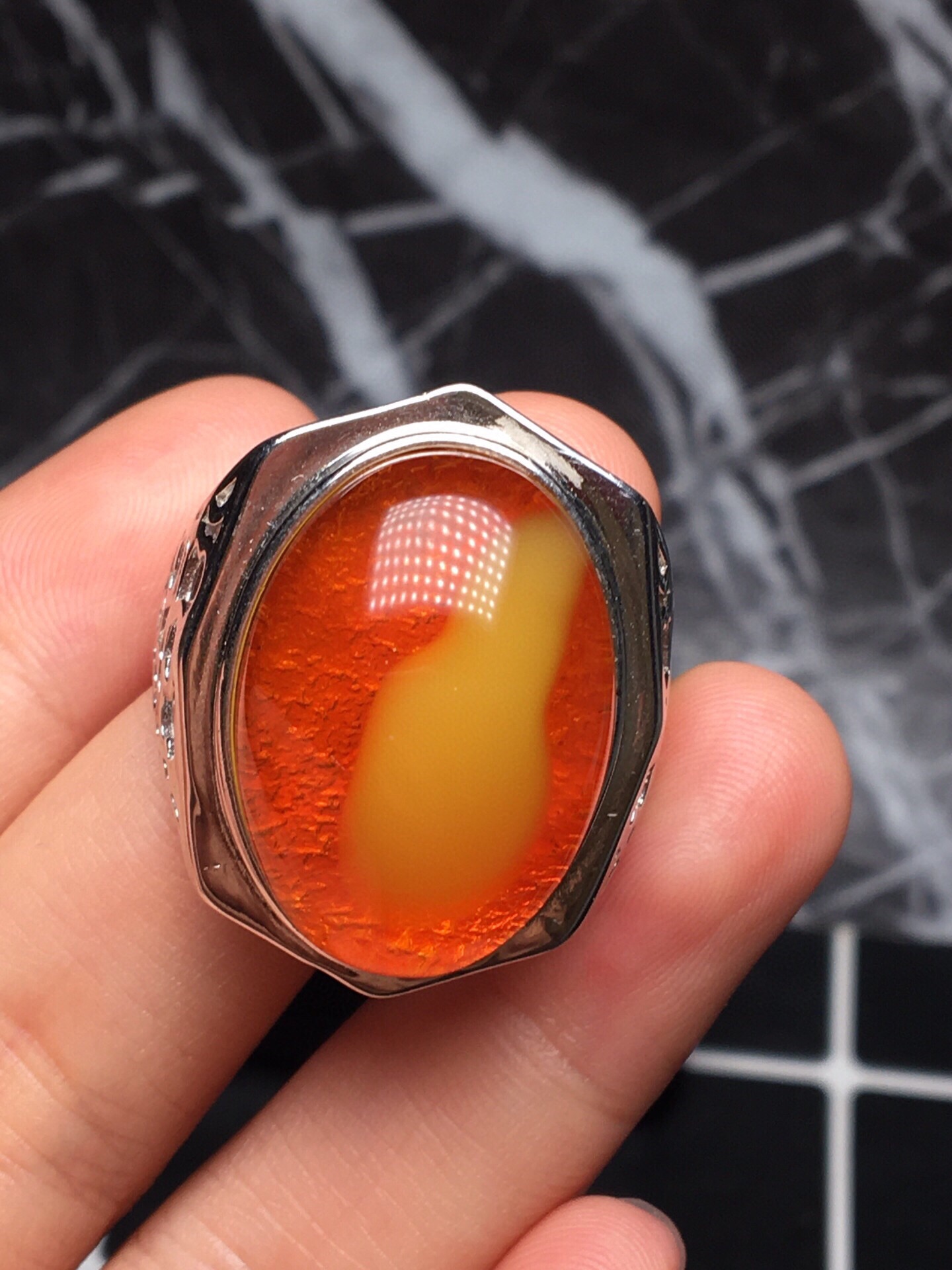 *品 鸡油红 蜜蜡戒指 大自然的鬼斧神工,特色鸡油红金飘蜜,个性十足,独一无二,s925银镶嵌活口,尺寸和重量如图所示,附带鉴定证书和精美礼盒。