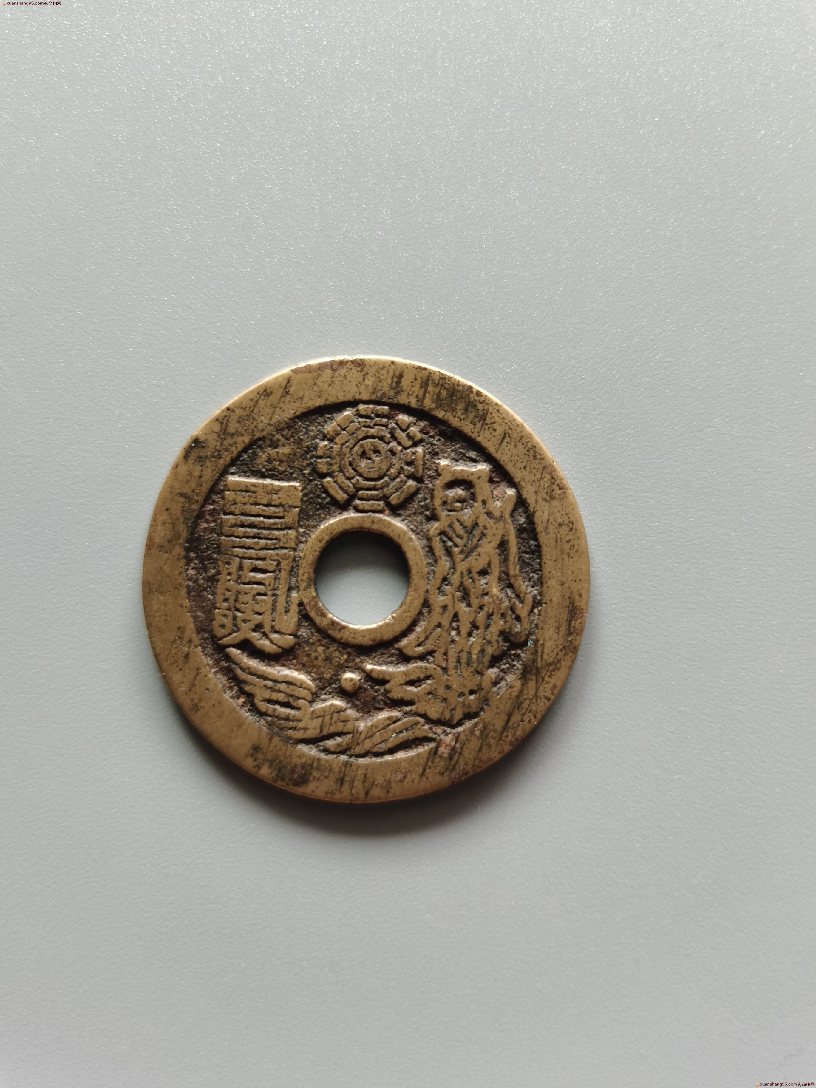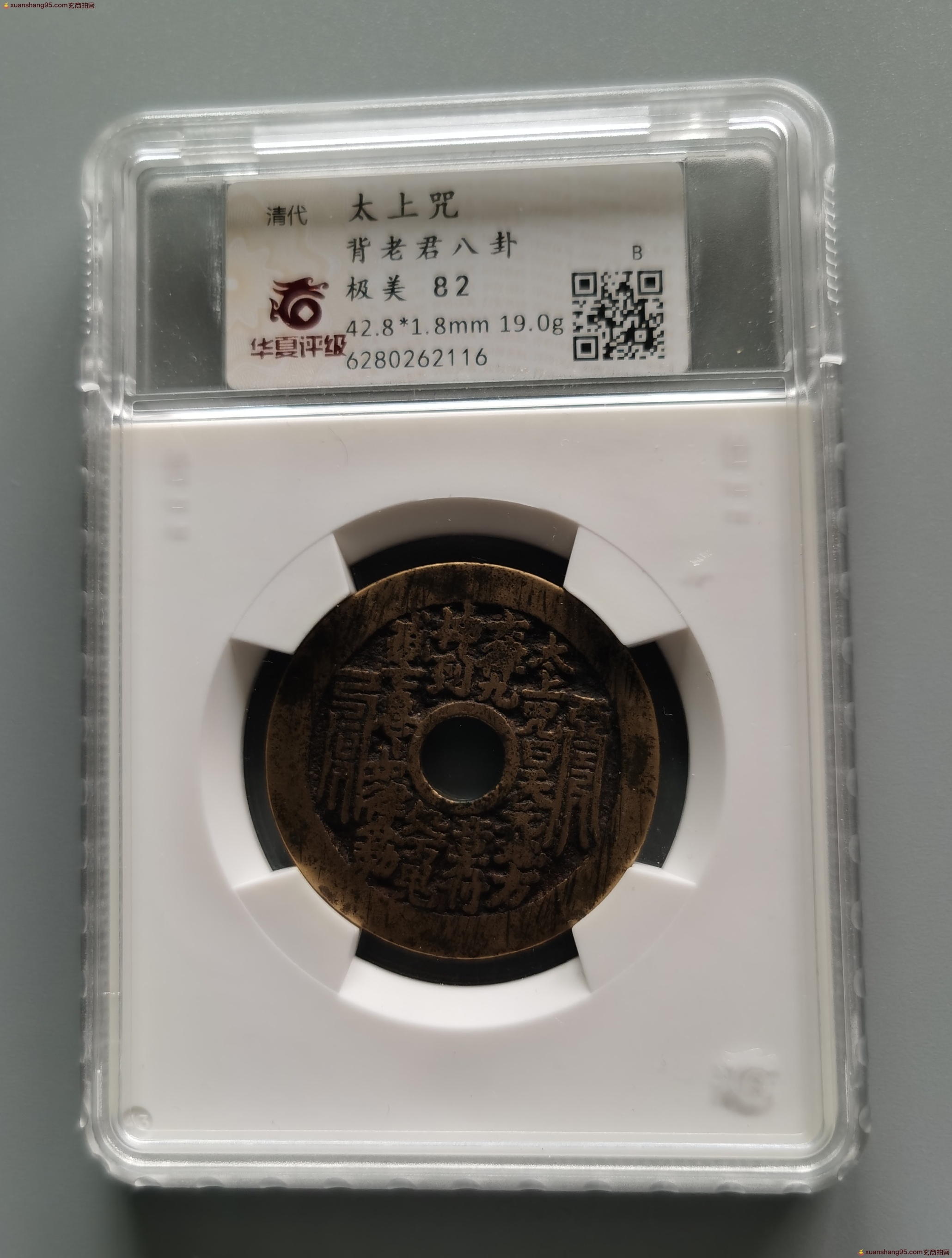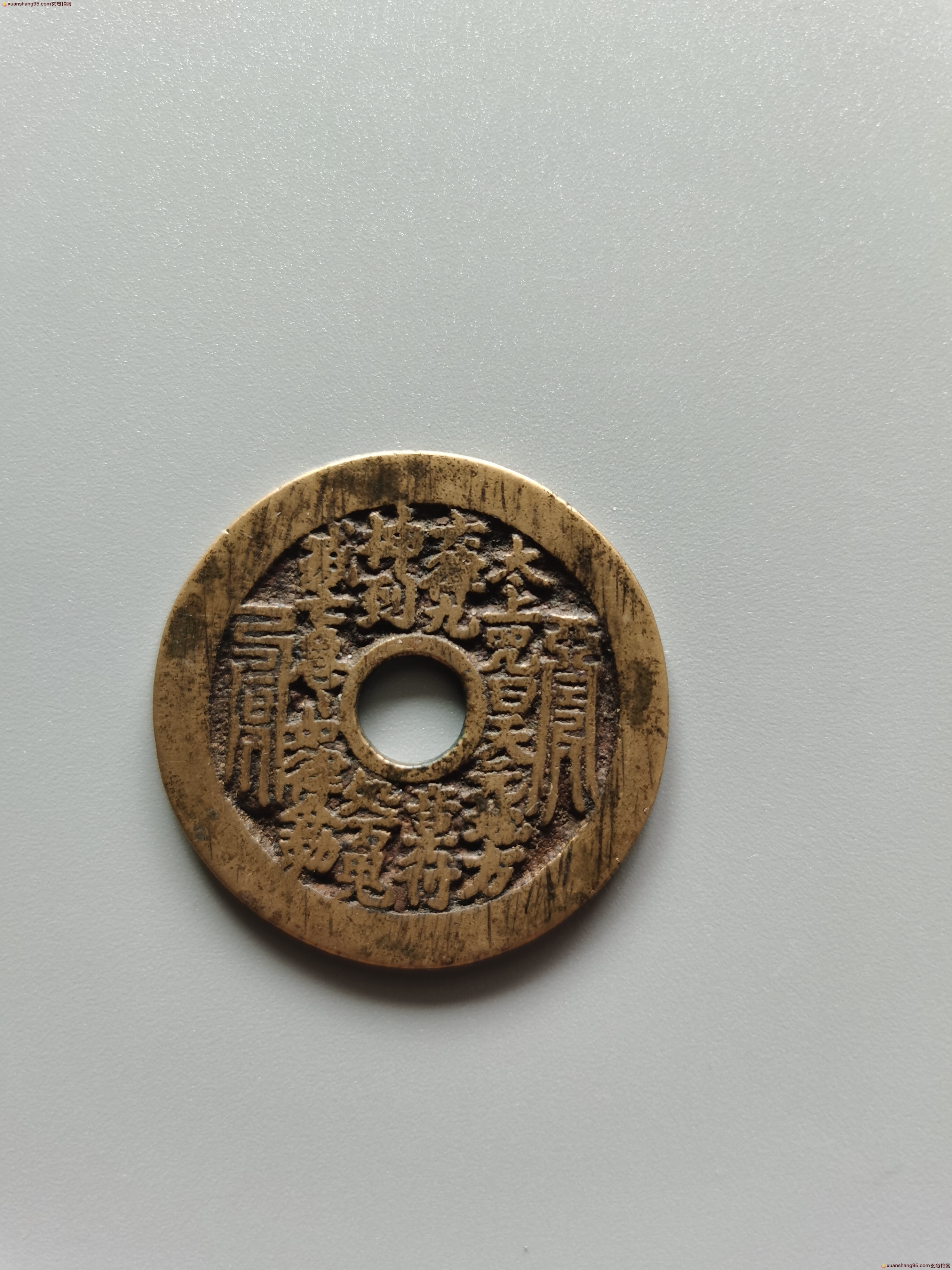 此枚太上咒花钱呈圆形,钱币正面从右到左镌有神鬼符及太上咒语,字迹清晰有力,背面左边镌有神符咒,右边镌有太上老君,上镌有八卦图。此枚钱币制作精美,文字清晰可辨,造型独特,品相状态完美。