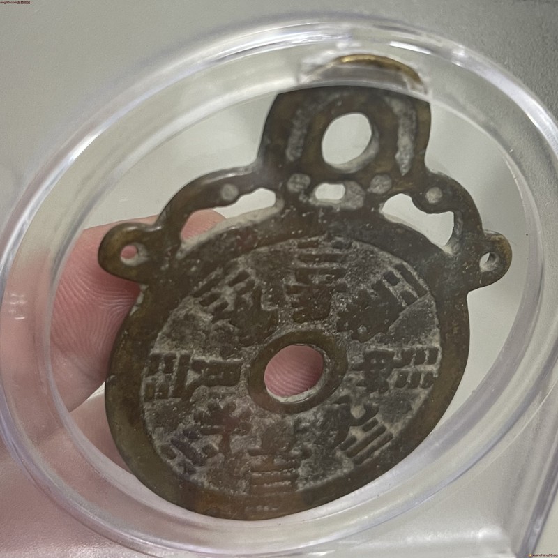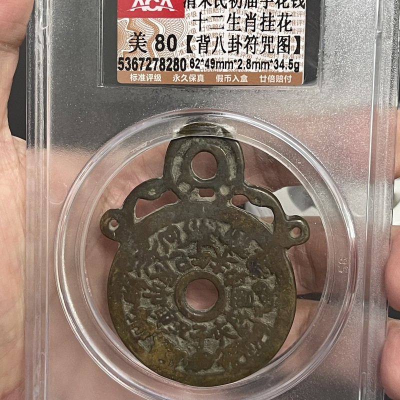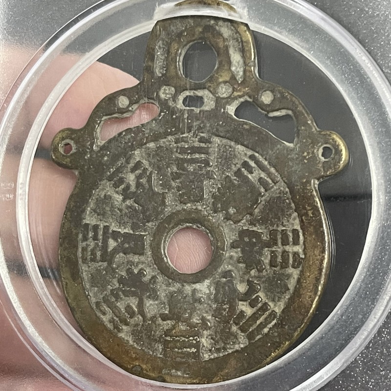 包浆温润,状态佳, 正反两面清晰可见。十二生肖是我国的古代民俗生肖文化精粹,生肖属相是每个人与生俱来的标记和烙印,十二生肖可谓家喻户晓。花钱一面为十二生肖图,“子丑寅卯辰巳午未甲酉戍亥子”十二字环绕在十二只栩栩如生的生肖上,代表十二时辰,又代表一年十二个月和人的十二属相。另一面为圆形八卦图,“乾、震、坎、艮、坤、巽、离、兑”八个卦象和符号,代表世间万物、阴阳五行,以八卦衍生至无限,包罗万象。