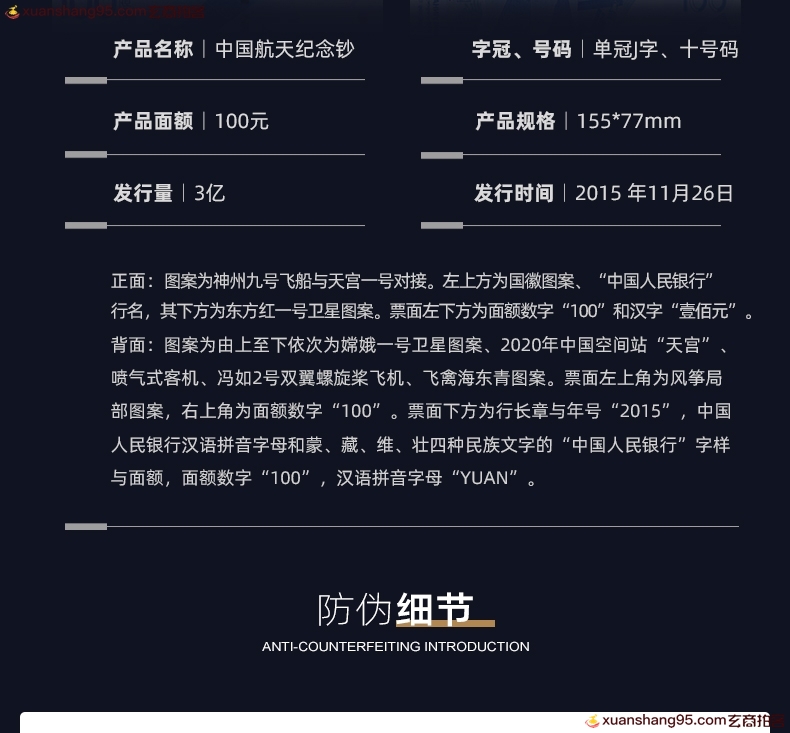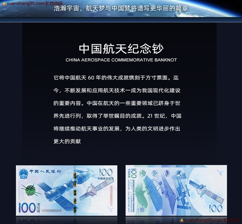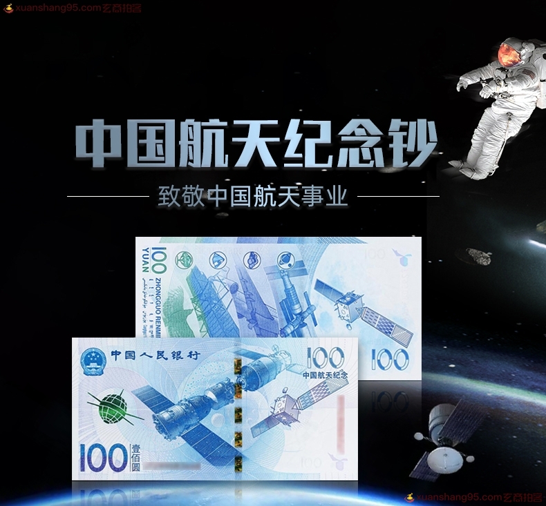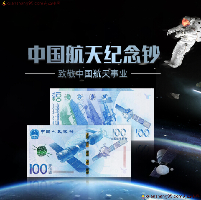 中国人民银行定于2015年11月26日发行中国航天纪念钞一张,中国航天普通纪念币一枚。中国航天纪念钞面额为100元,票面长为155毫米,票面宽为77毫米,发行数量为3亿张。与现行流通人民币职能相同,与同面额人民币等值流通。与现行流通人民币职能相同,与同面额人民币等值流通。