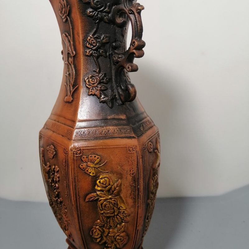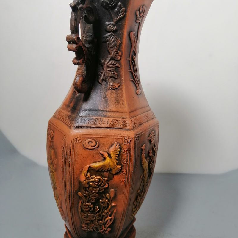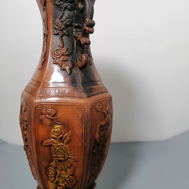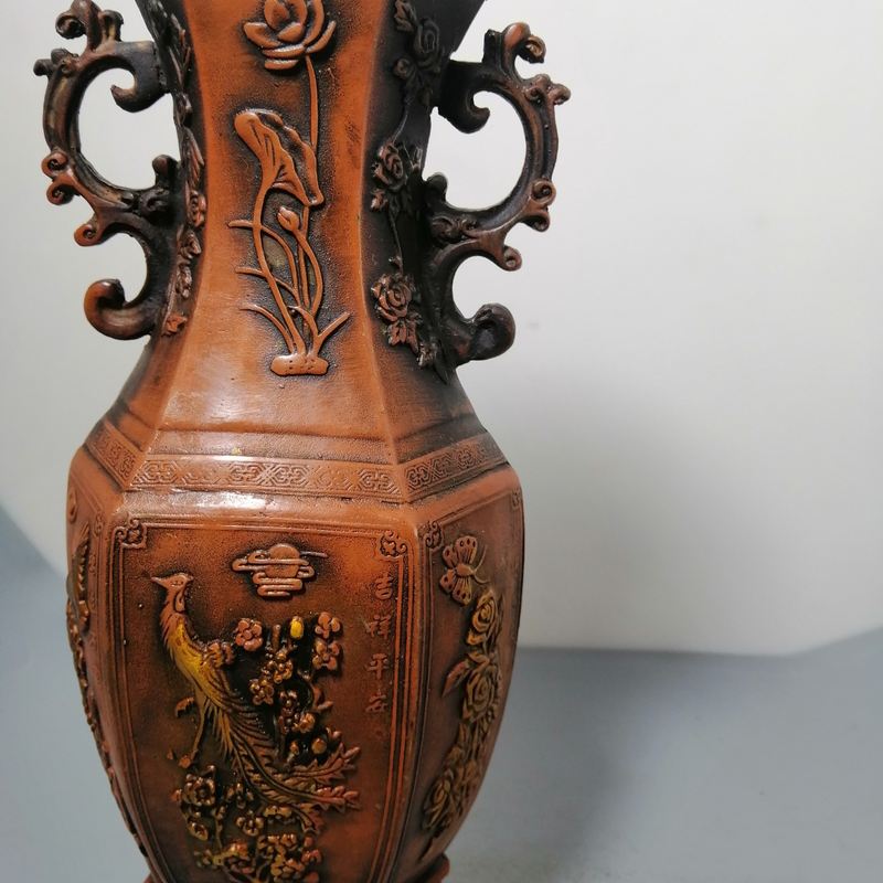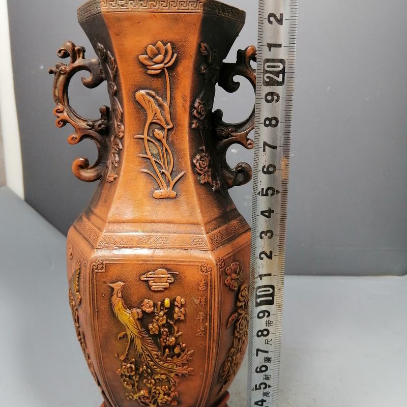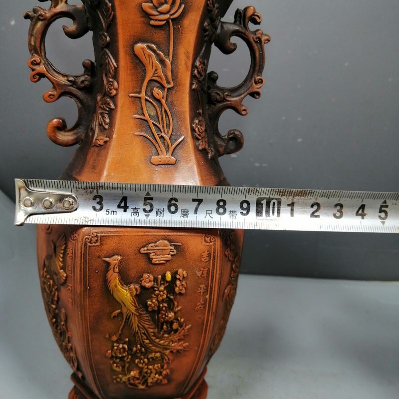 铜 双龙立耳 瓶 品相如图 做工精细 尺寸如图所示。“文玩”一词,两个字组成,一个为文,一个为玩。按字面意思,可以理解问,“有文化”“可把玩”。但是按现在人对文玩的认知,“只要是天然的材质” 都可以称之为文玩。同时也有人觉得书法丹青文房四宝才是文玩。文玩的工艺价值,这个是最重要的,也是促进“文玩”发展至今最重要的一个元素,工艺价值。如果文玩没有工艺,那么也绝不会有人去精心研究更细腻高级的工艺。实用性,一个东西,一定是要具有实用性,才会长久。不然买一个东西,拿来根本不知道做什么用,那么久而久之,也就遗弃了。而不能长久的东西,是发挥不出“文玩”的魅力的。,赏玩性,人对美好的东西永远是向往的,一件东西在经济条件允许的情况下,一定是精益求精的。也正是人对玩物的精益求精,也造就了当今玩物的精品林立。