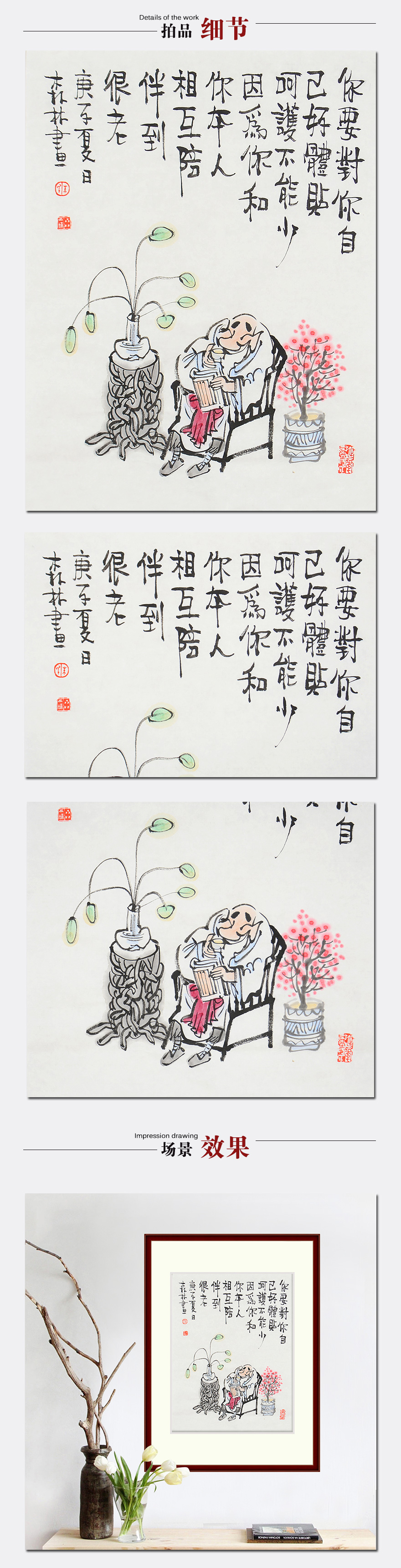 释 文:你要对你自己好 体贴呵护不能少 因为你和你本人 相互陪伴到很老 朱森林 中美协会员 天津美协理事 *漫画家 朱老师的画配上绝妙的诗文恰到好处,趣味无穷 值得细细品味。