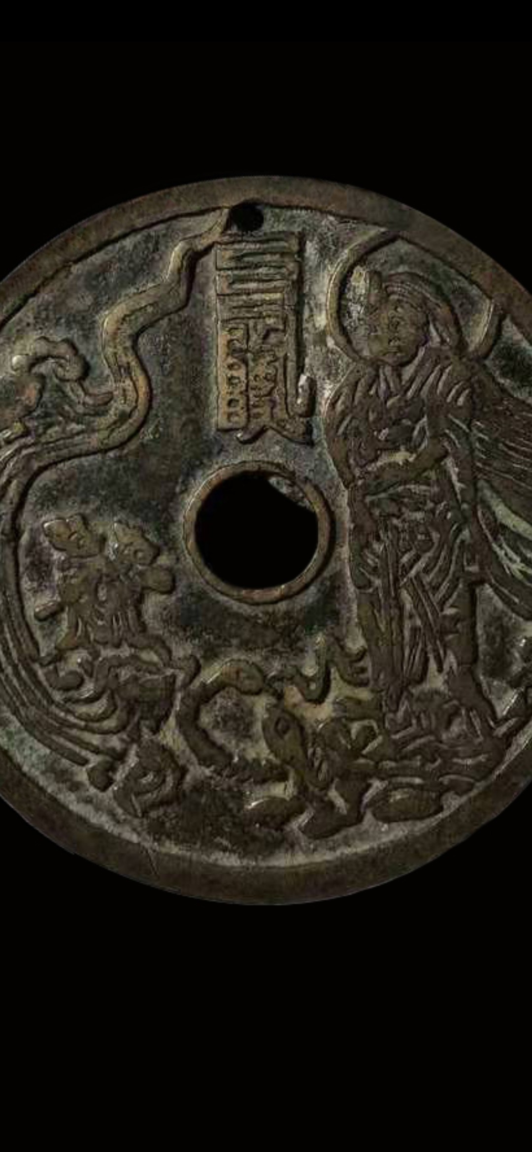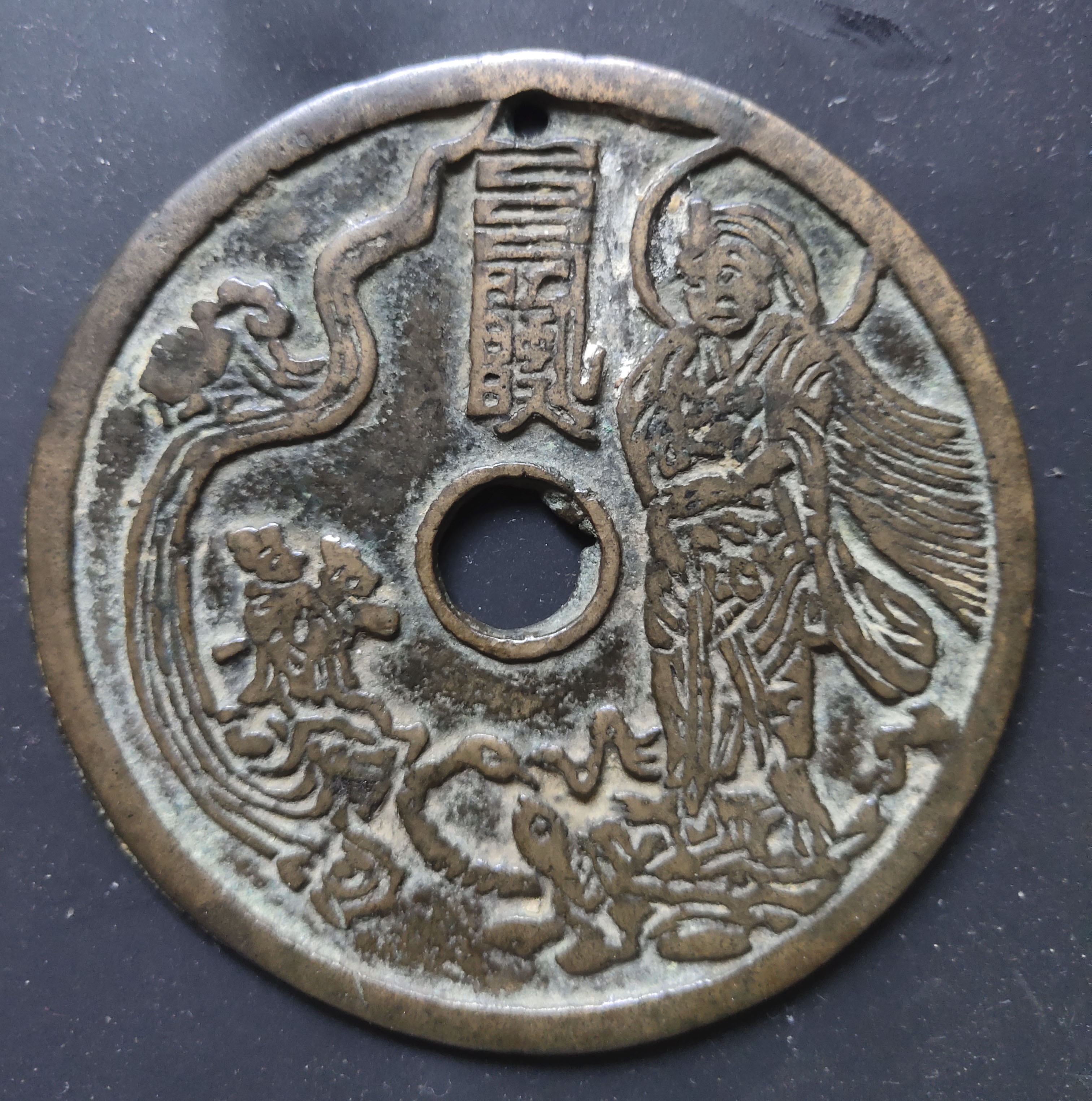 品相说明:十二点位置有一个老打孔,人物面外缘7点左右有一细小划痕,文字面穿口有小铸磕,文字面3点钟方向有划痕,铸造轻微不圆;