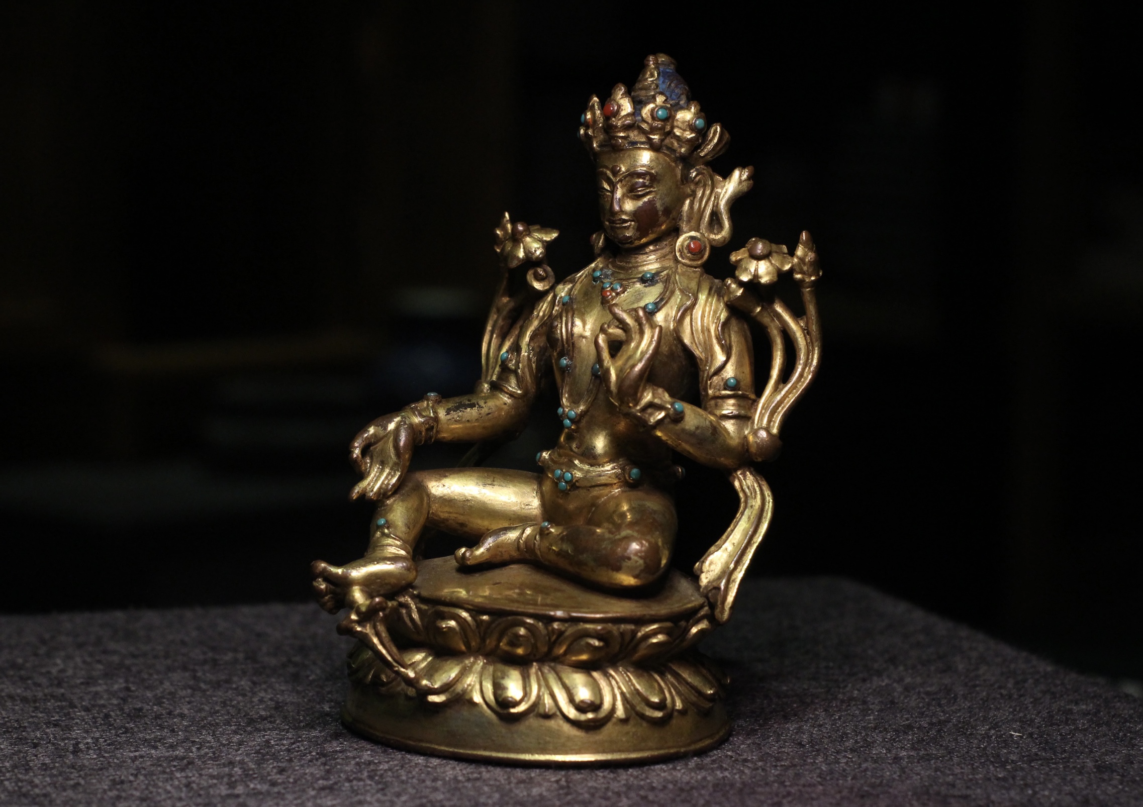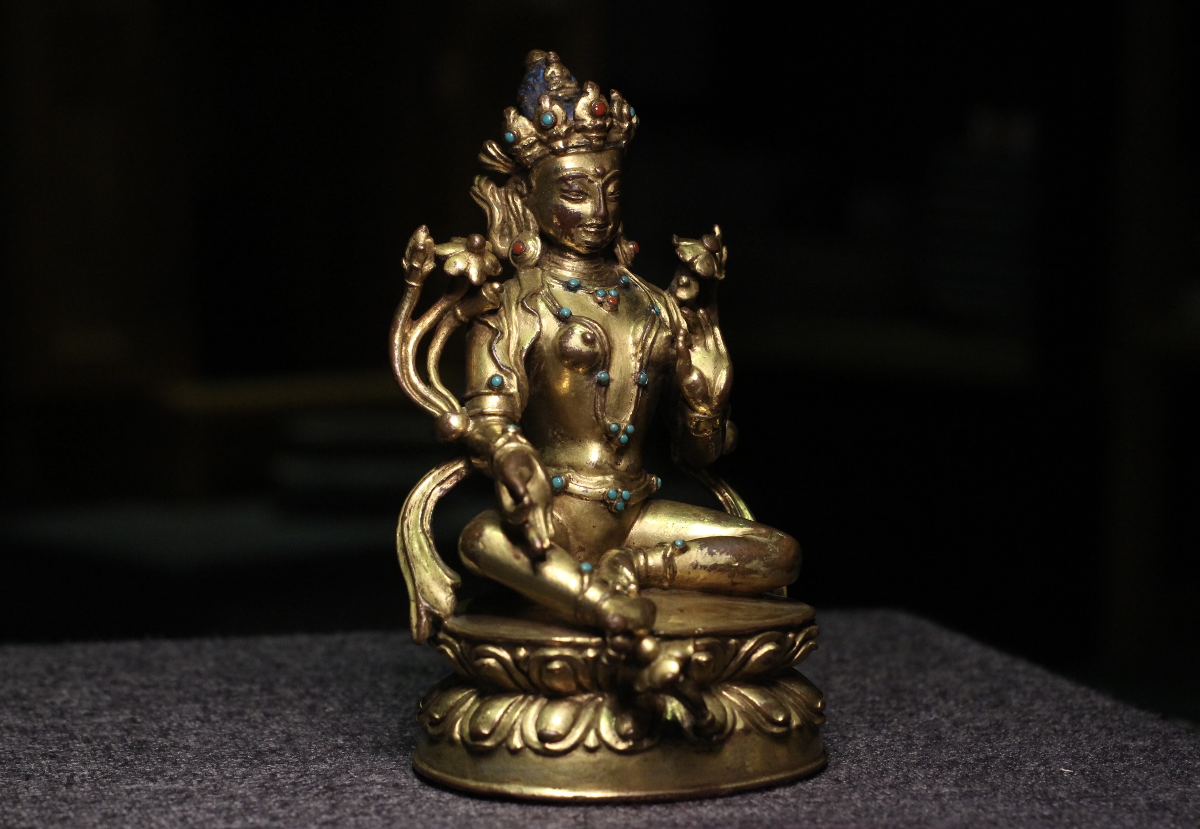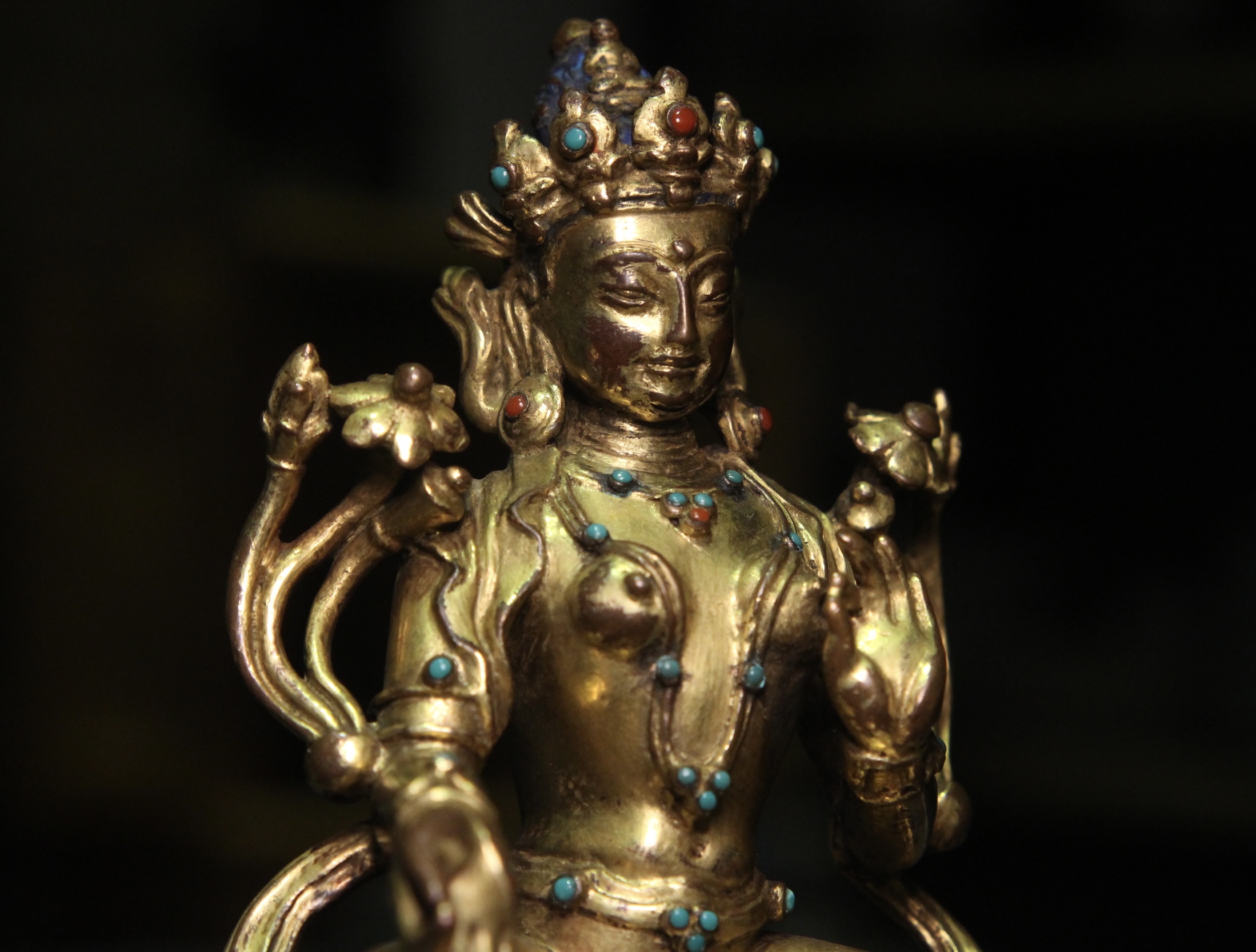 绿度母为二十一救度佛母之一,以其身色得名,被尊崇为能奇迹般拯救苦难众生的救助者,也是示现的度母中最为常见和活跃的。经典称二十一度母皆为观音菩萨的眼泪所化现,以助菩萨解救众生之各种苦难,《度母本源记》中即称绿度母可救狮难、象难、蛇难、水难、火难、牢难及非人类等八种苦难,故也称救八难度母。绿度母的信仰在藏传佛教中十分盛行,这一题材的造像更是藏传佛教造像中造型最为优美的一类,而绿度母则因其或舒坐或站立的灵活姿态,最易将女性形象中的婀娜多姿体现得淋漓尽致,此尊即为一典型范例。
