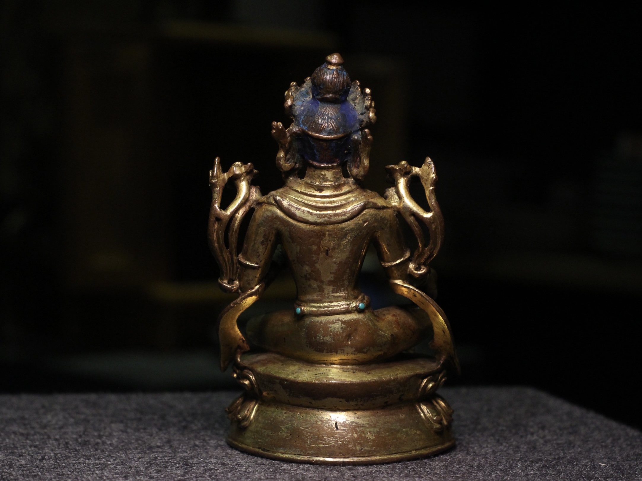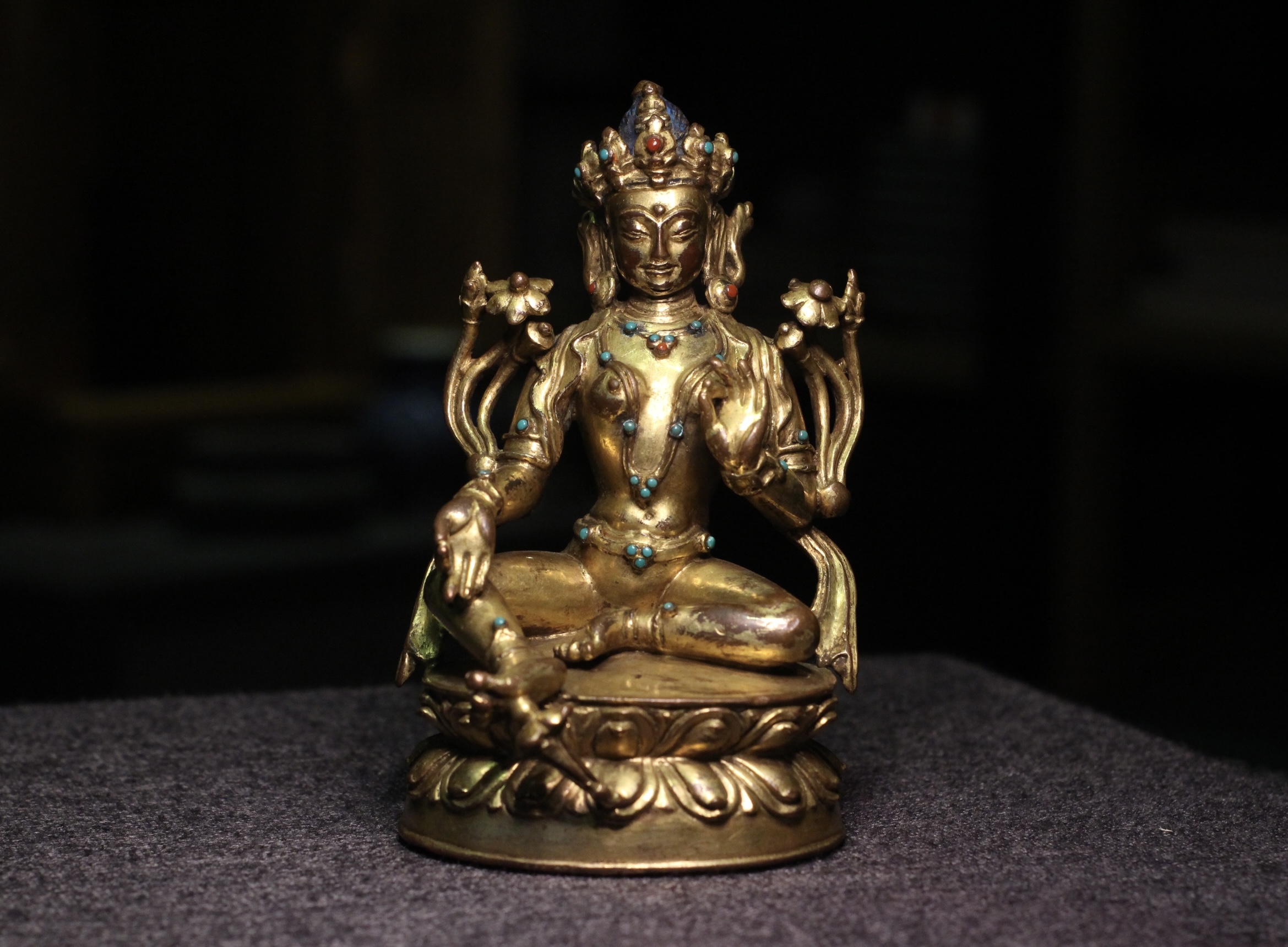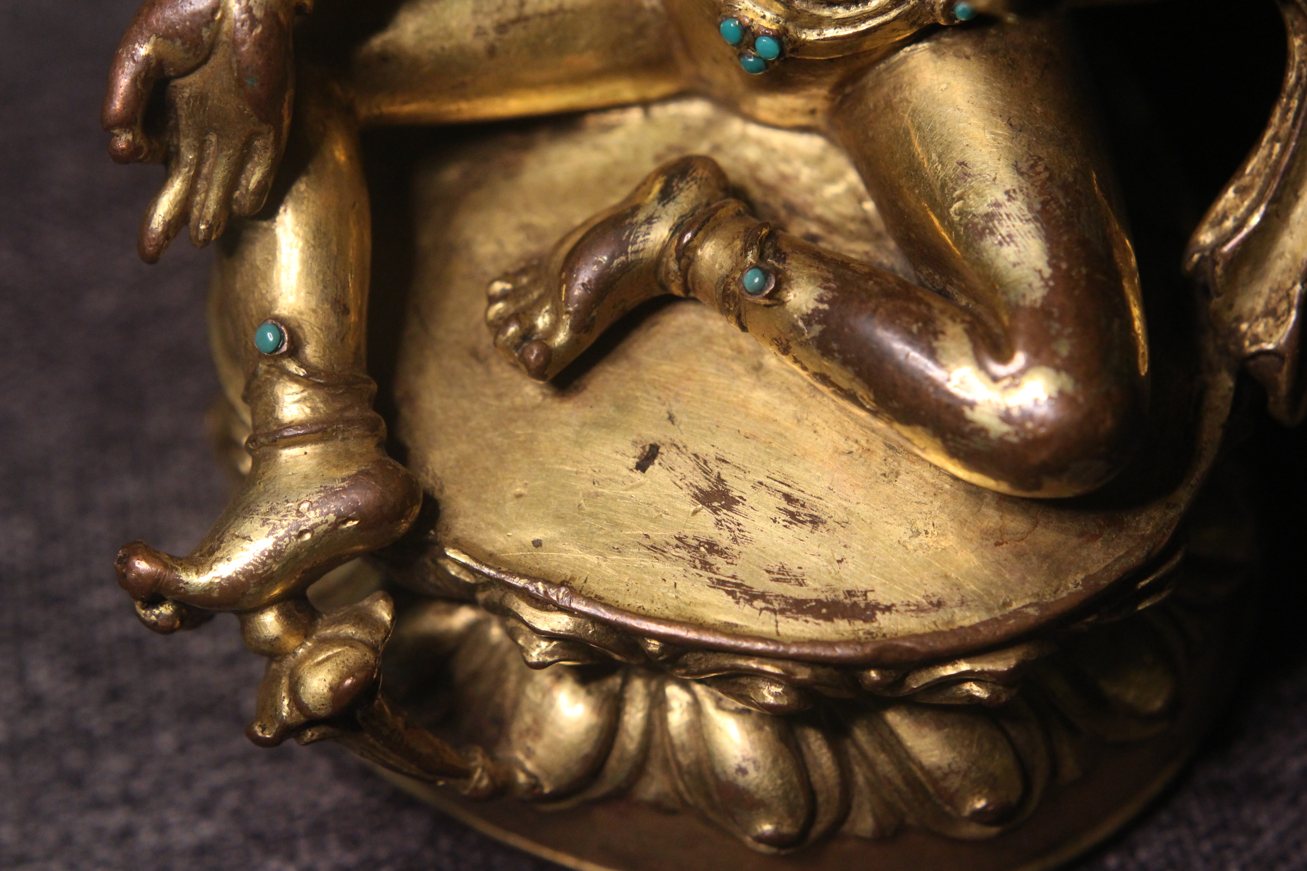 绿度母为二十一救度佛母之一,以其身色得名,被尊崇为能奇迹般拯救苦难众生的救助者,也是示现的度母中最为常见和活跃的。经典称二十一度母皆为观音菩萨的眼泪所化现,以助菩萨解救众生之各种苦难,《度母本源记》中即称绿度母可救狮难、象难、蛇难、水难、火难、牢难及非人类等八种苦难,故也称救八难度母。绿度母的信仰在藏传佛教中十分盛行,这一题材的造像更是藏传佛教造像中造型最为优美的一类,而绿度母则因其或舒坐或站立的灵活姿态,最易将女性形象中的婀娜多姿体现得淋漓尽致,此尊即为一典型范例。