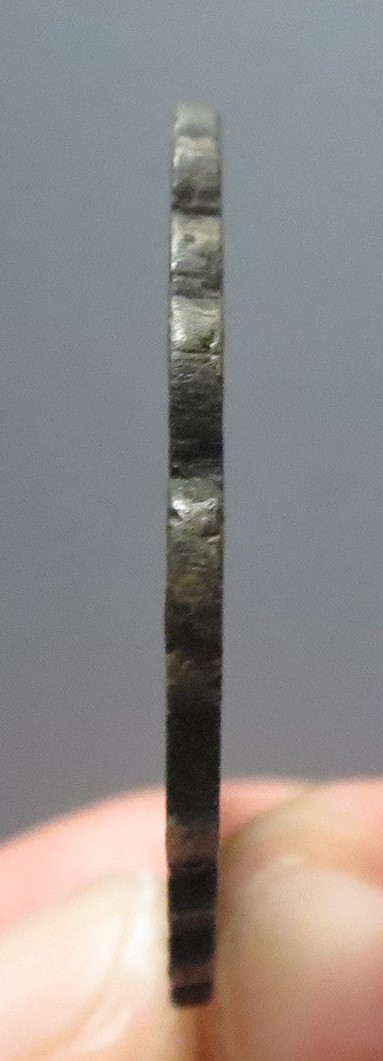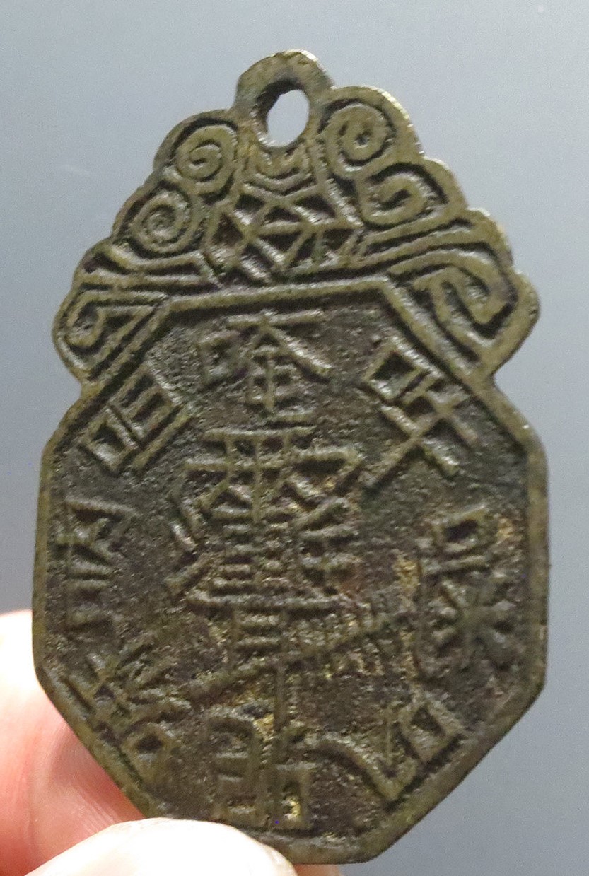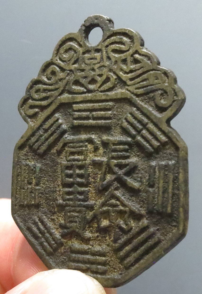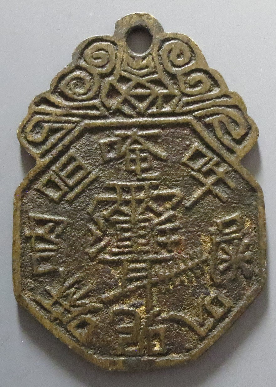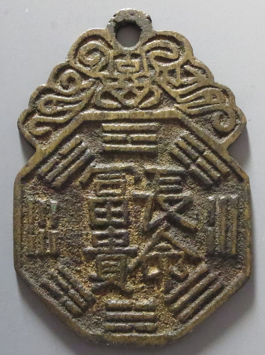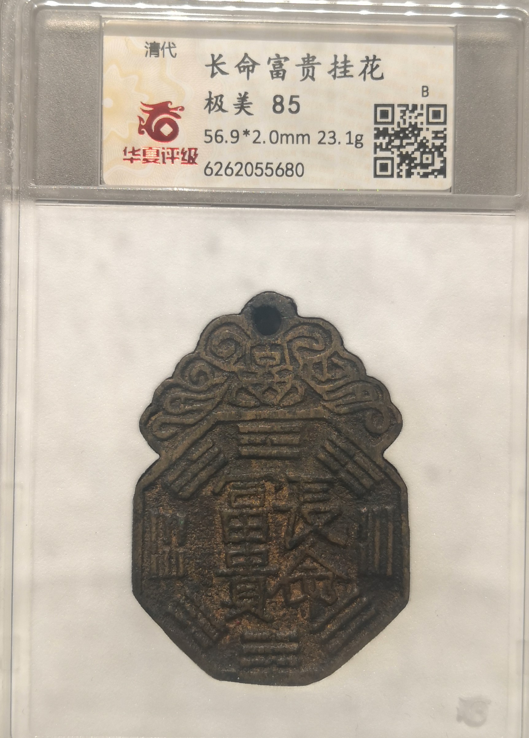 长命富贵八卦背佛咒“雨渐耳”,品相完好无缺陷,华夏评级85分。“雨渐耳”据《五音集韵》的解释为: “聻(jian)”,人死后变成了鬼,人们都比较害怕;鬼死后变成了聻,鬼见了都很害怕。上面的雨,代表五雷天心正法。中间的渐字,三点水旁其实是三字,寓意三斩。整体意思就是运用五雷天心正法对鬼进行三次斩杀,因此在符中可以达到祛邪治煞的目的。该枚挂花体现佛道互相包容,彼此融合,和谐共存。