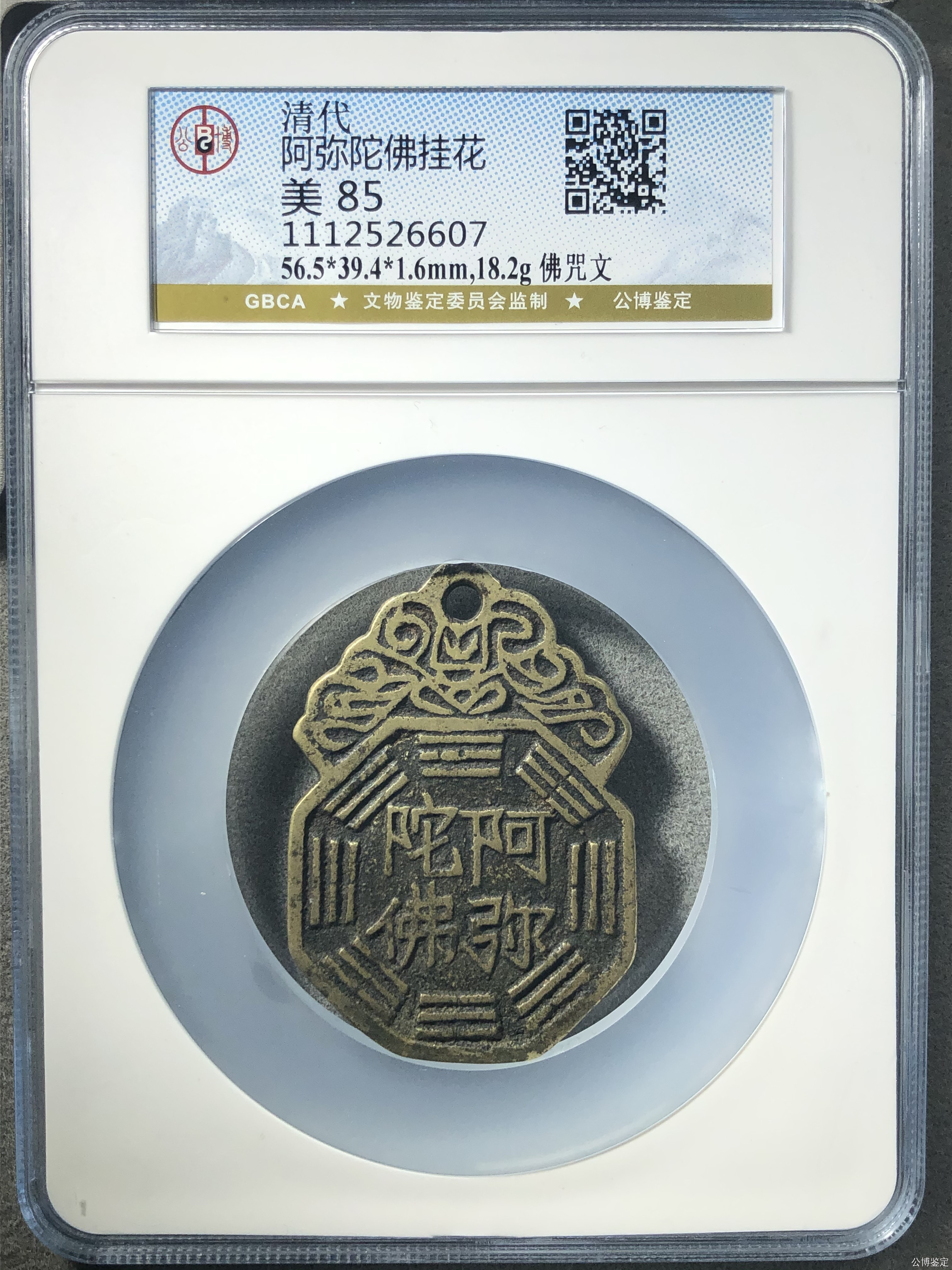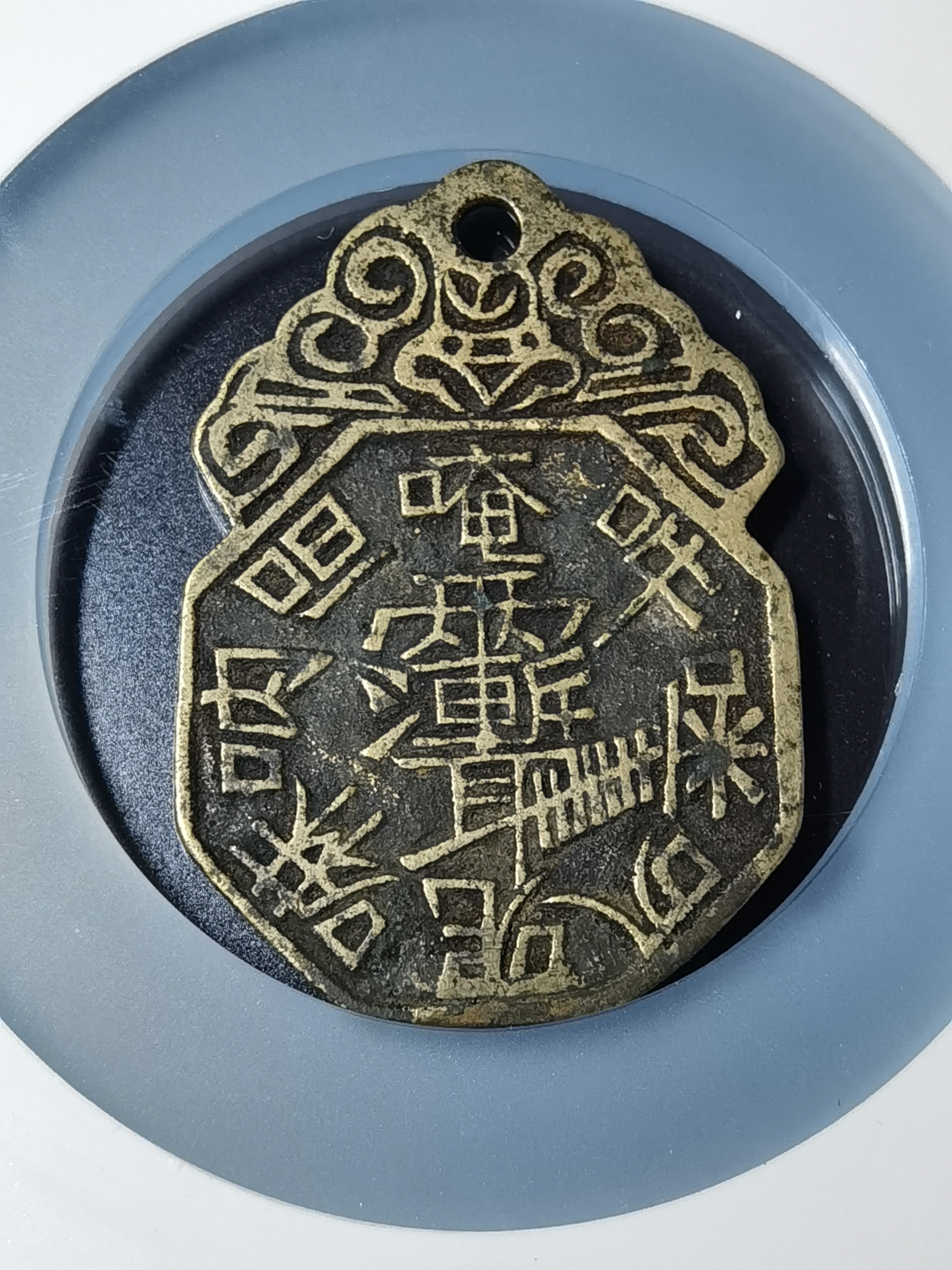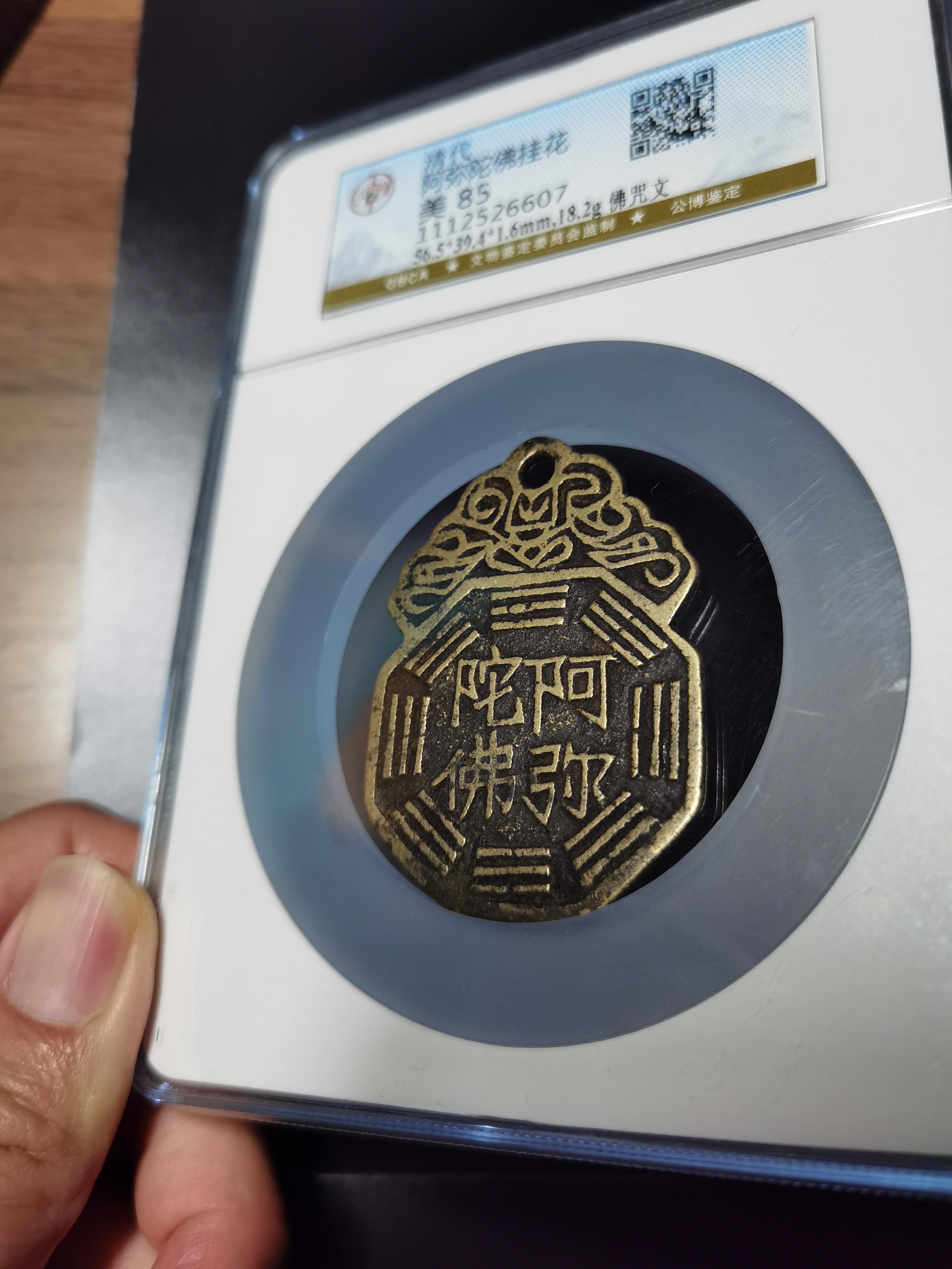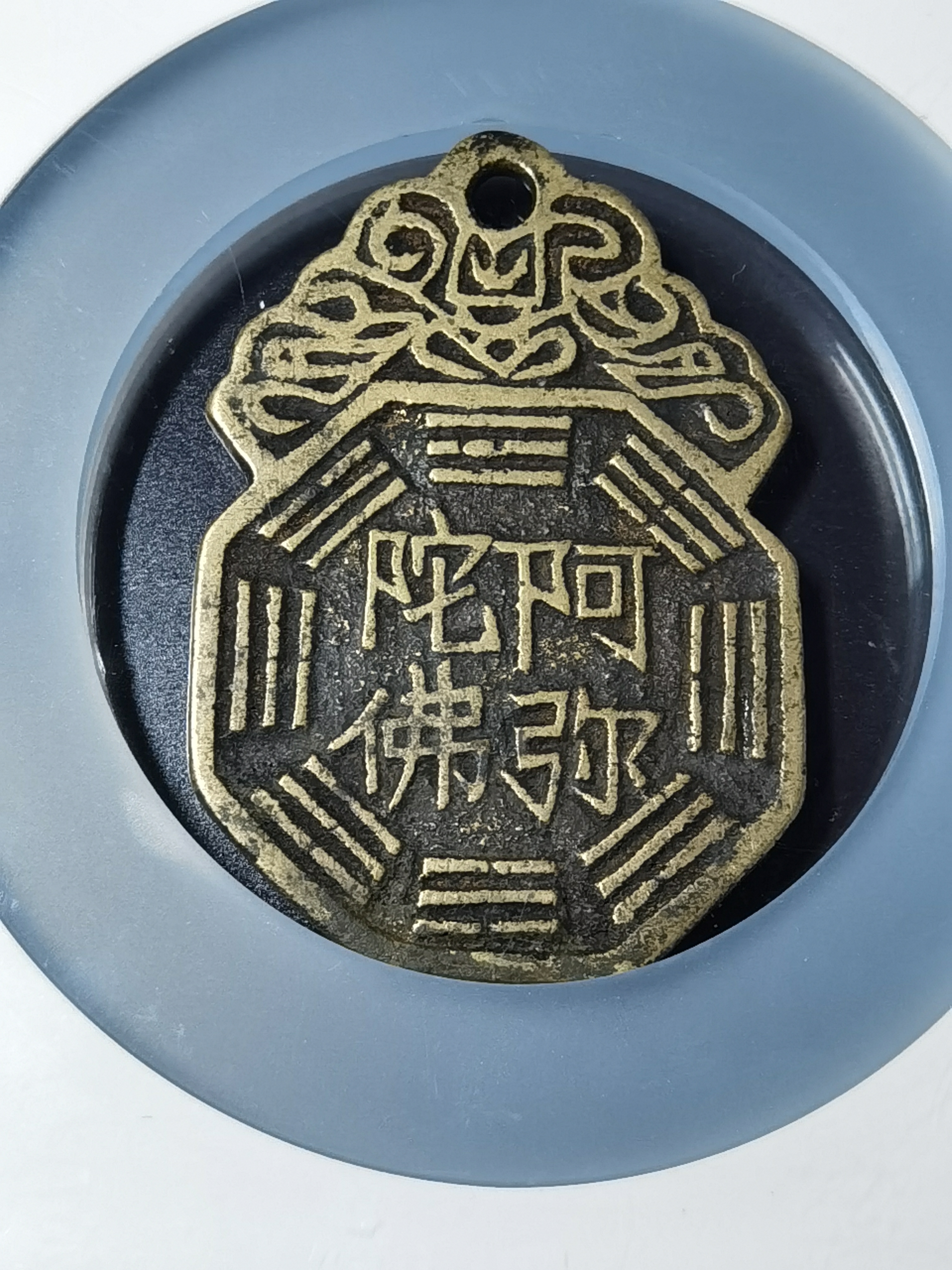 阿弥陀佛八卦背佛咒“雨渐耳”,品相完好无缺陷,公博评级85分。“雨渐耳”据《五音集韵》的解释为: “聻(jian)”,人死后变成了鬼,人们都比较害怕;鬼死后变成了聻,鬼见了都很害怕。上面的雨,代表五雷天心正法。中间的渐字,三点水旁其实是三字,寓意三斩。整体意思就是运用五雷天心正法对鬼进行三次斩杀,因此在符中可以达到祛邪治煞的目的。此枚花钱体现佛道互相包容,彼此融合,和谐共存,佛道真言集此枚花钱一身,吉祥平安加持,值得有缘人珍藏!