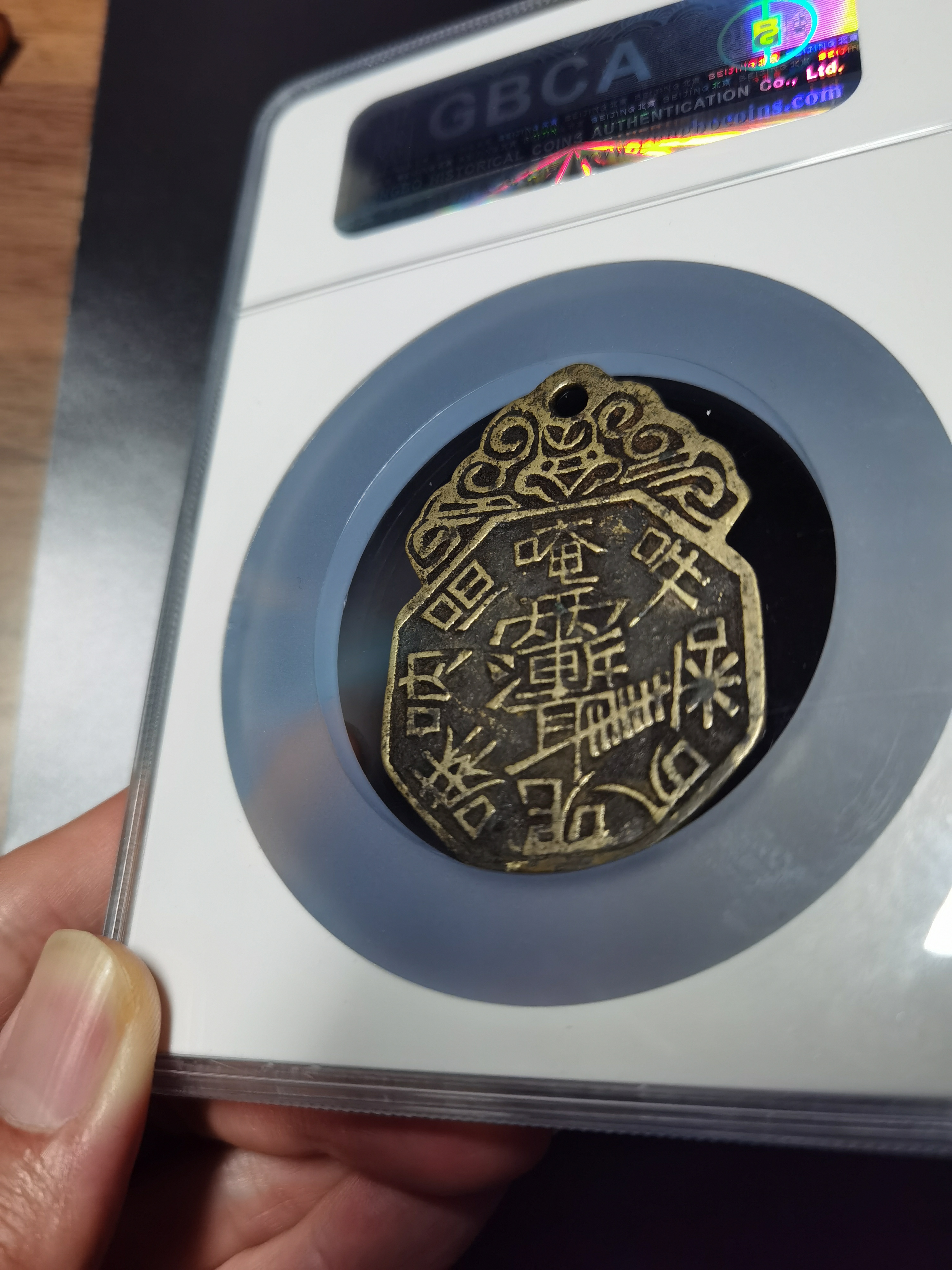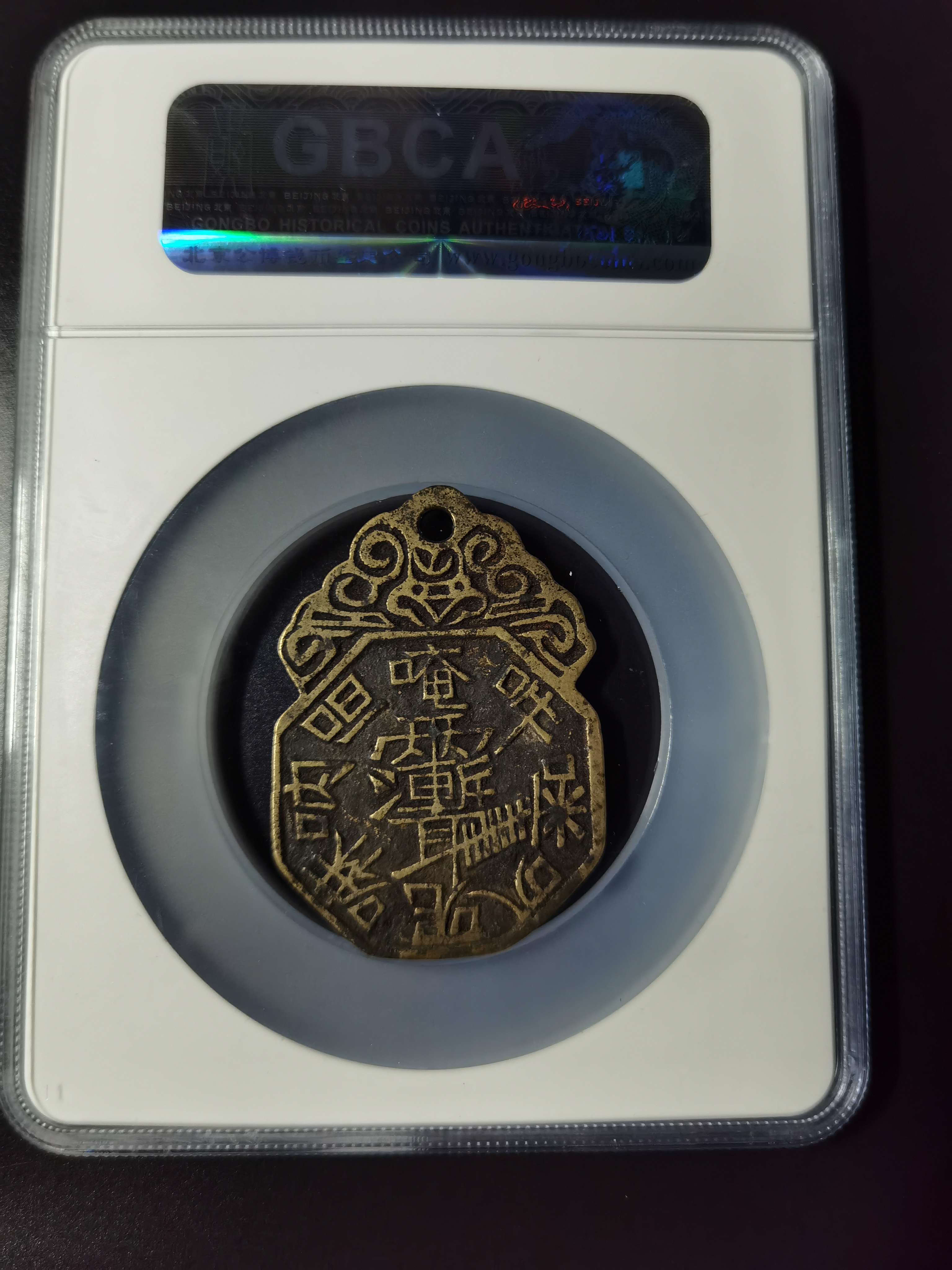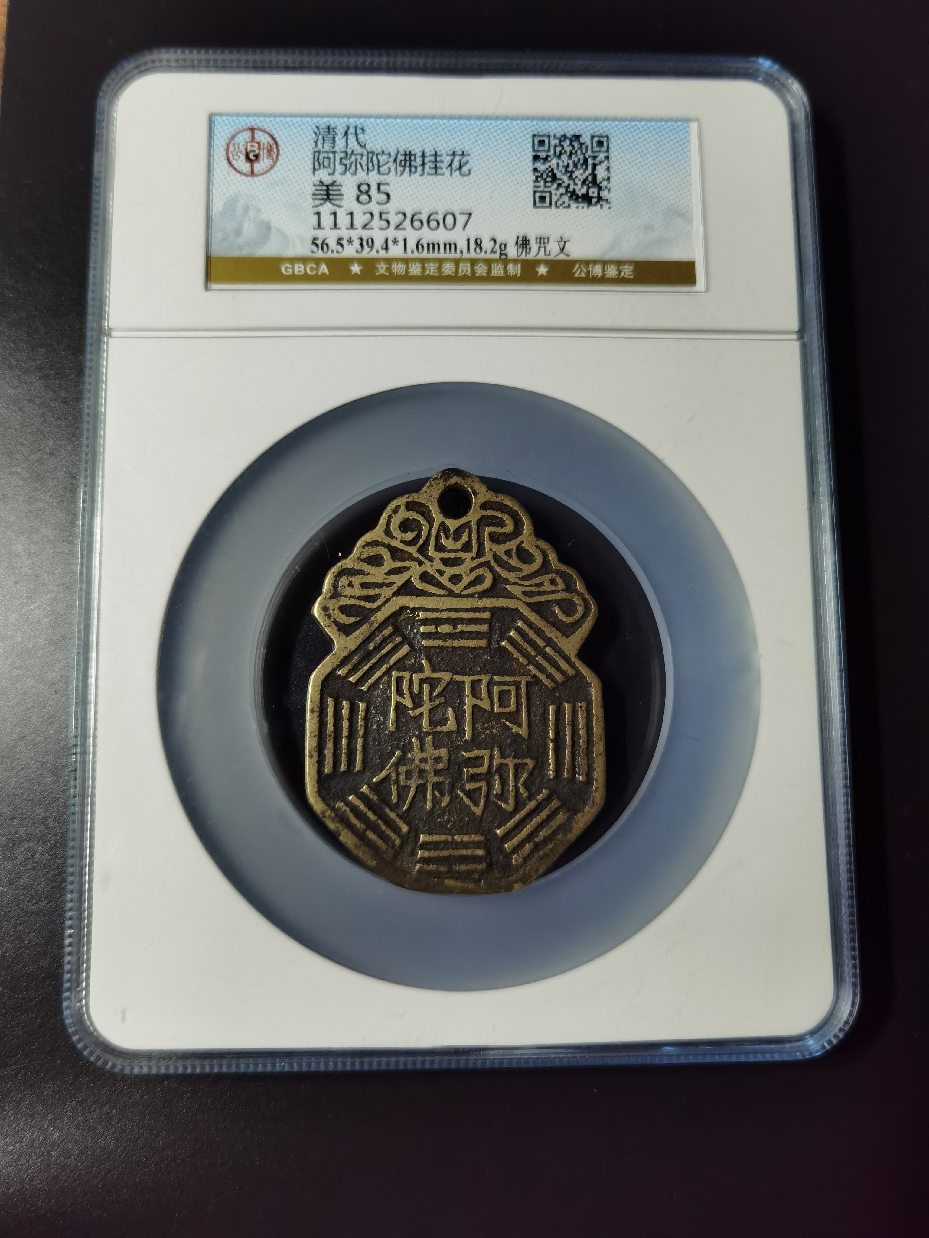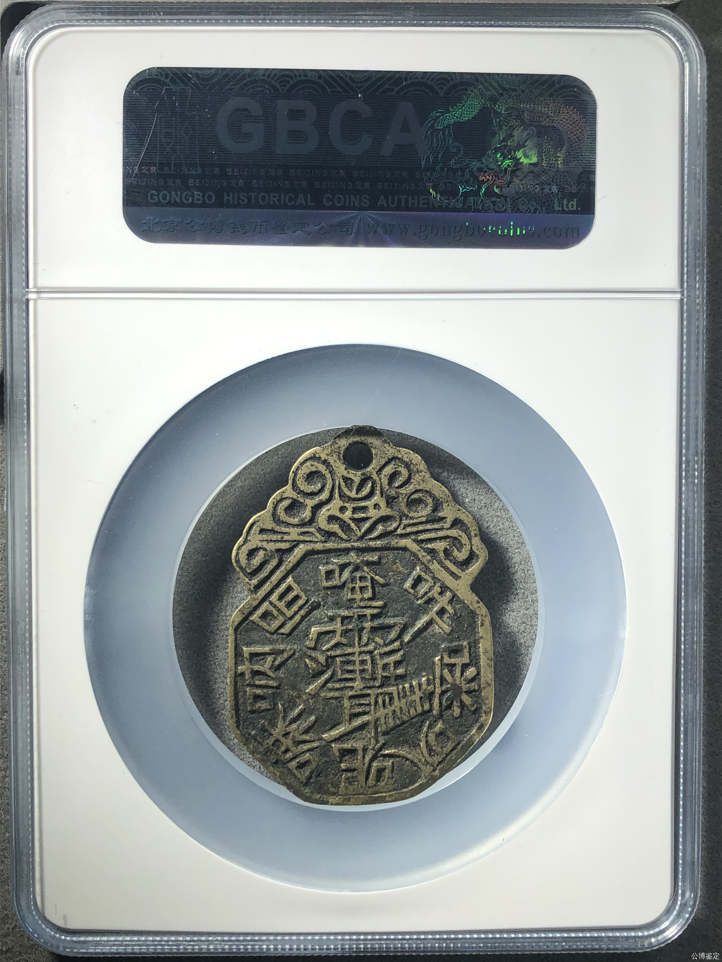 阿弥陀佛八卦背佛咒“雨渐耳”,品相完好无缺陷,公博评级85分。“雨渐耳”据《五音集韵》的解释为: “聻(jian)”,人死后变成了鬼,人们都比较害怕;鬼死后变成了聻,鬼见了都很害怕。上面的雨,代表五雷天心正法。中间的渐字,三点水旁其实是三字,寓意三斩。整体意思就是运用五雷天心正法对鬼进行三次斩杀,因此在符中可以达到祛邪治煞的目的。此枚花钱体现佛道互相包容,彼此融合,和谐共存,佛道真言集此枚花钱一身,吉祥平安加持,值得有缘人珍藏!