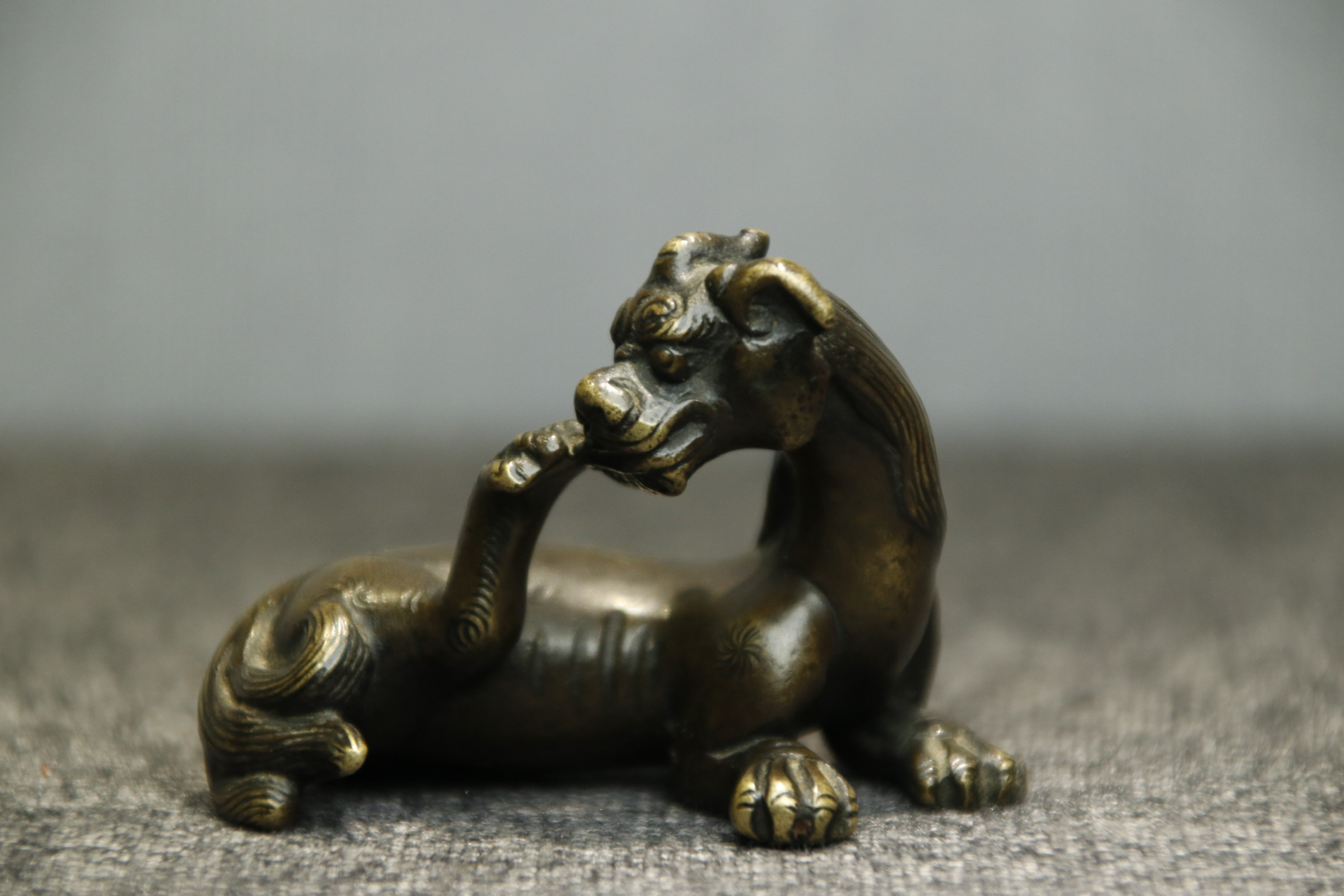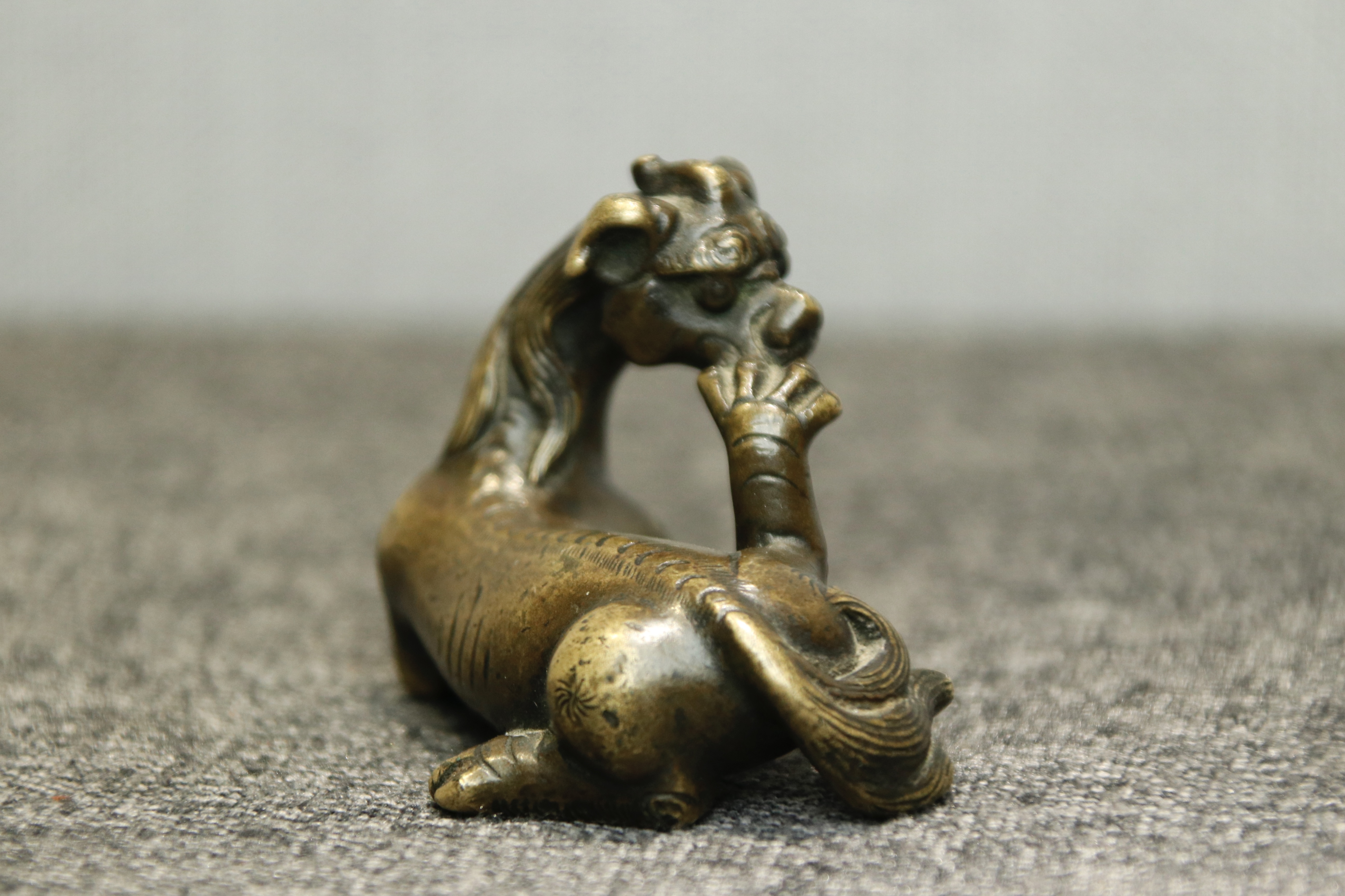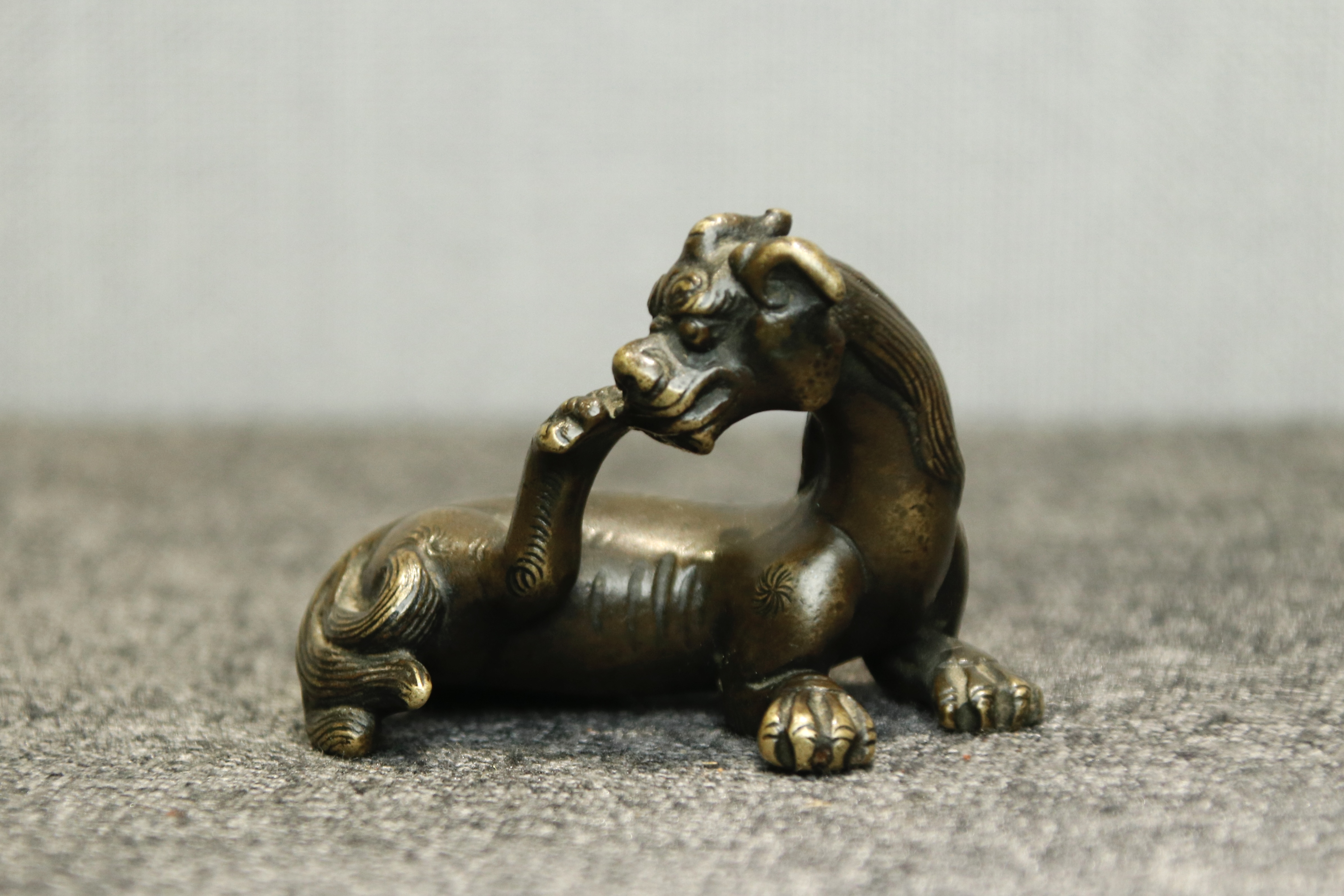 铜镇质地精良,入手沉重。瑞兽呈回首状,双目圆瞪,开口露齿,四肢健硕,骨骼肌肉隐现,尾部及腿际鬃毛飘展,线条优美,潇洒精神,运刀细腻,丝丝必现。整器包浆自然熟亮,是难得一见的文房镇。瑞兽在古代历史中有三富文化意义,象征神秘和力量,寓意避邪纳福,代表吉祥和力量,置干文房案头,又可作镇宅辟邪之用。