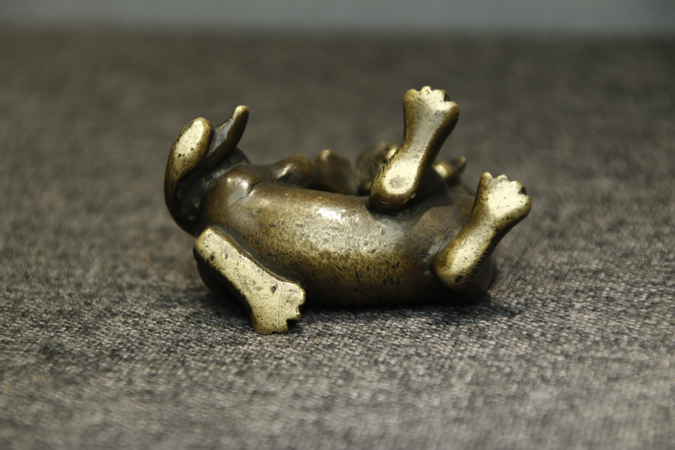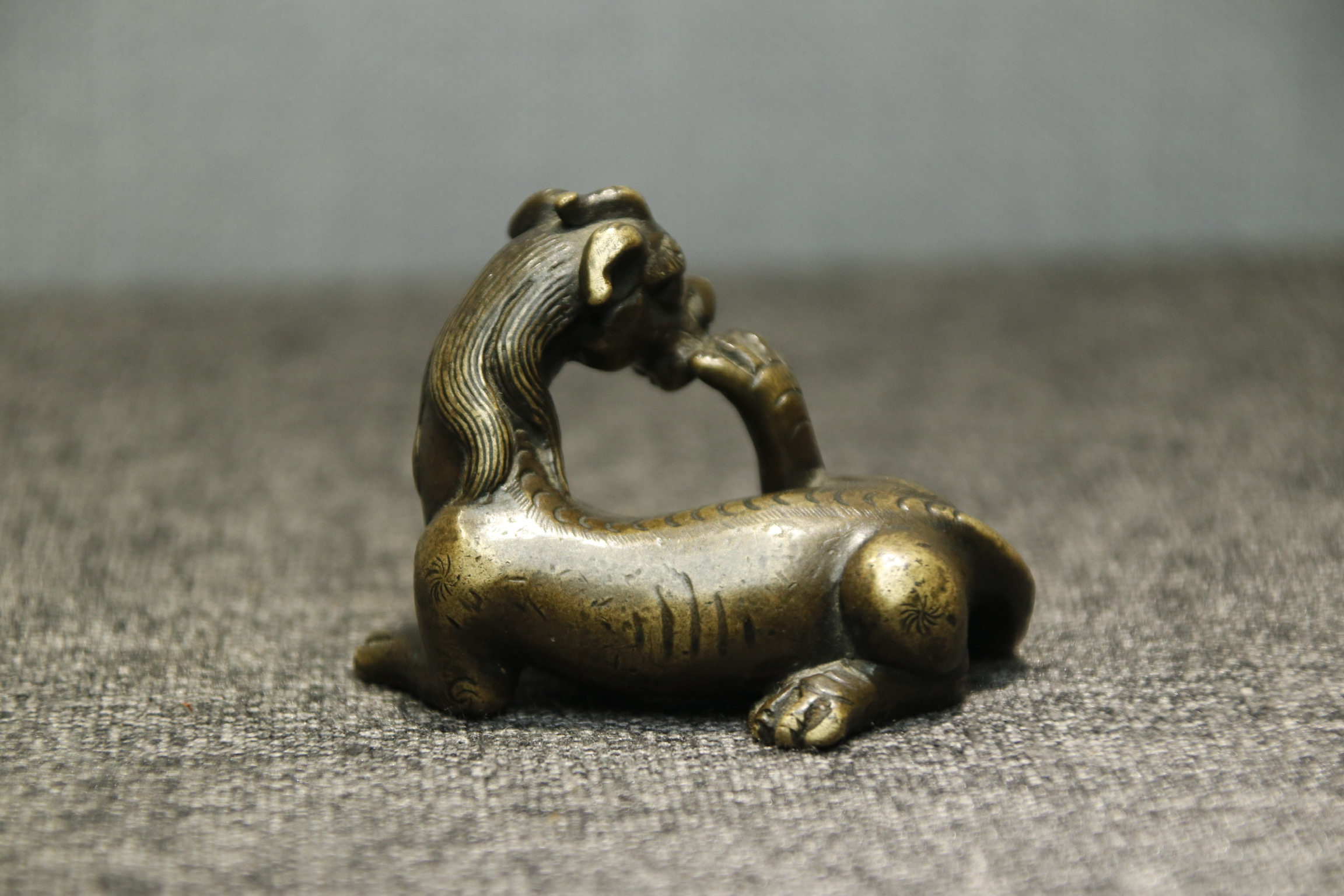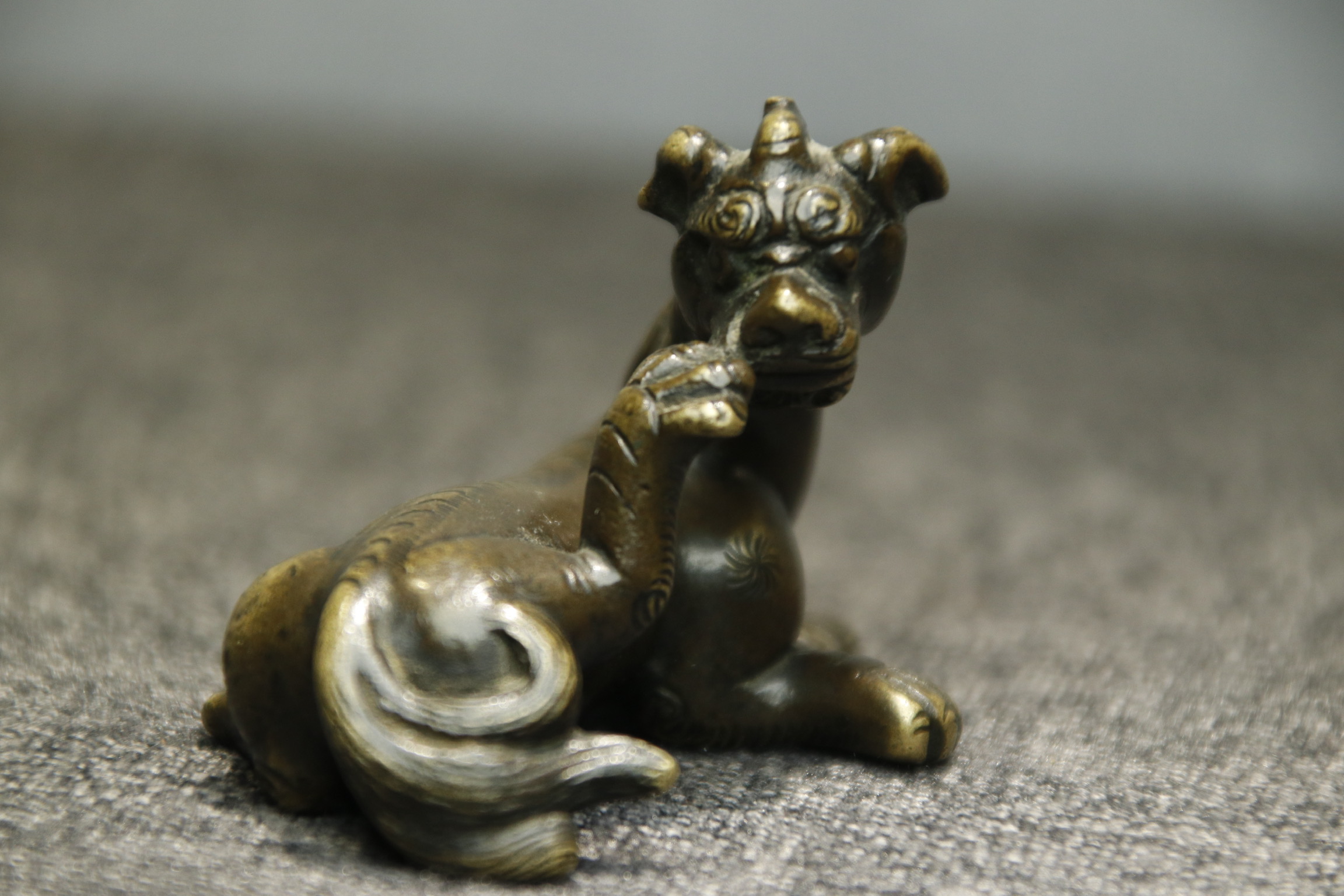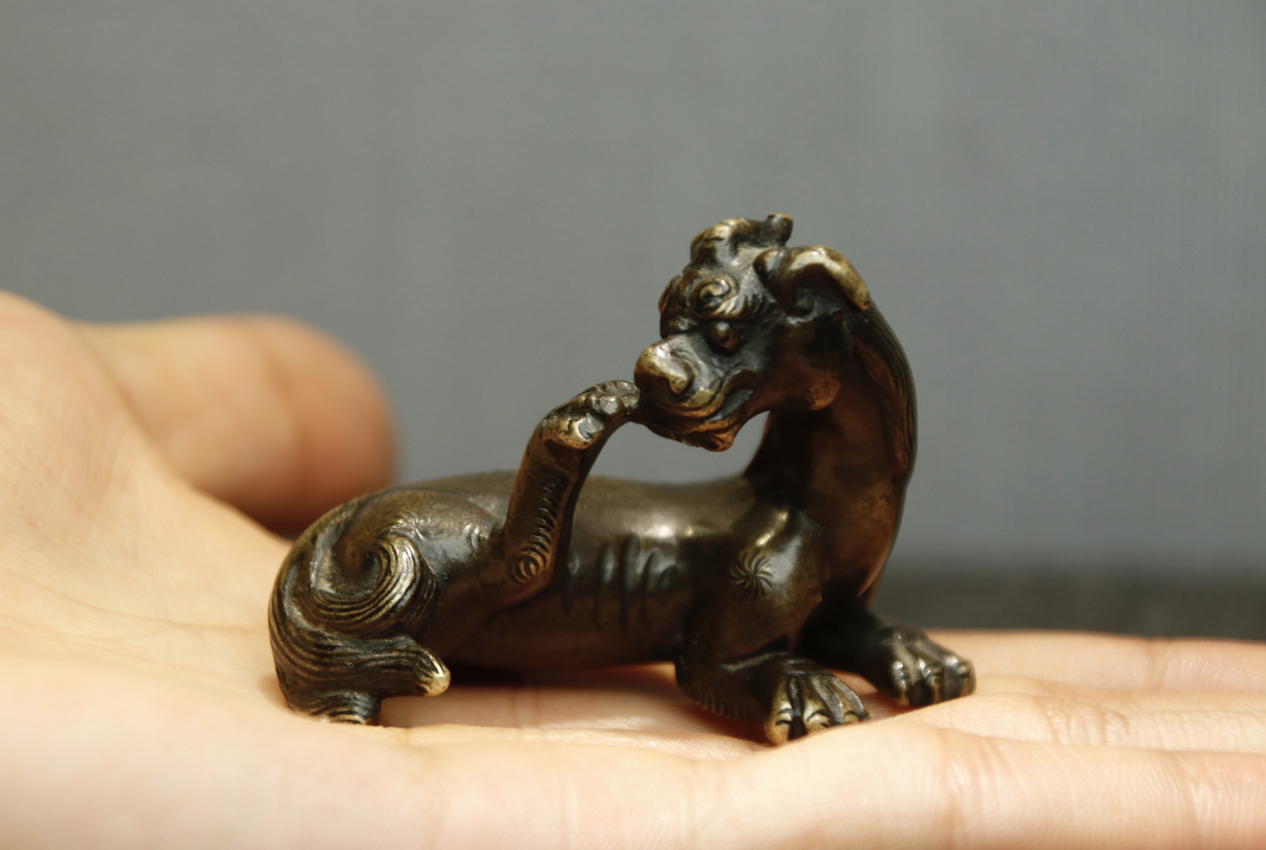铜镇质地精良,入手沉重。瑞兽呈回首状,双目圆瞪,开口露齿,四肢健硕,骨骼肌肉隐现,尾部及腿际鬃毛飘展,线条优美,潇洒精神,运刀细腻,丝丝必现。整器包浆自然熟亮,是难得一见的文房镇。瑞兽在古代历史中有三富文化意义,象征神秘和力量,寓意避邪纳福,代表吉祥和力量,置干文房案头,又可作镇宅辟邪之用。