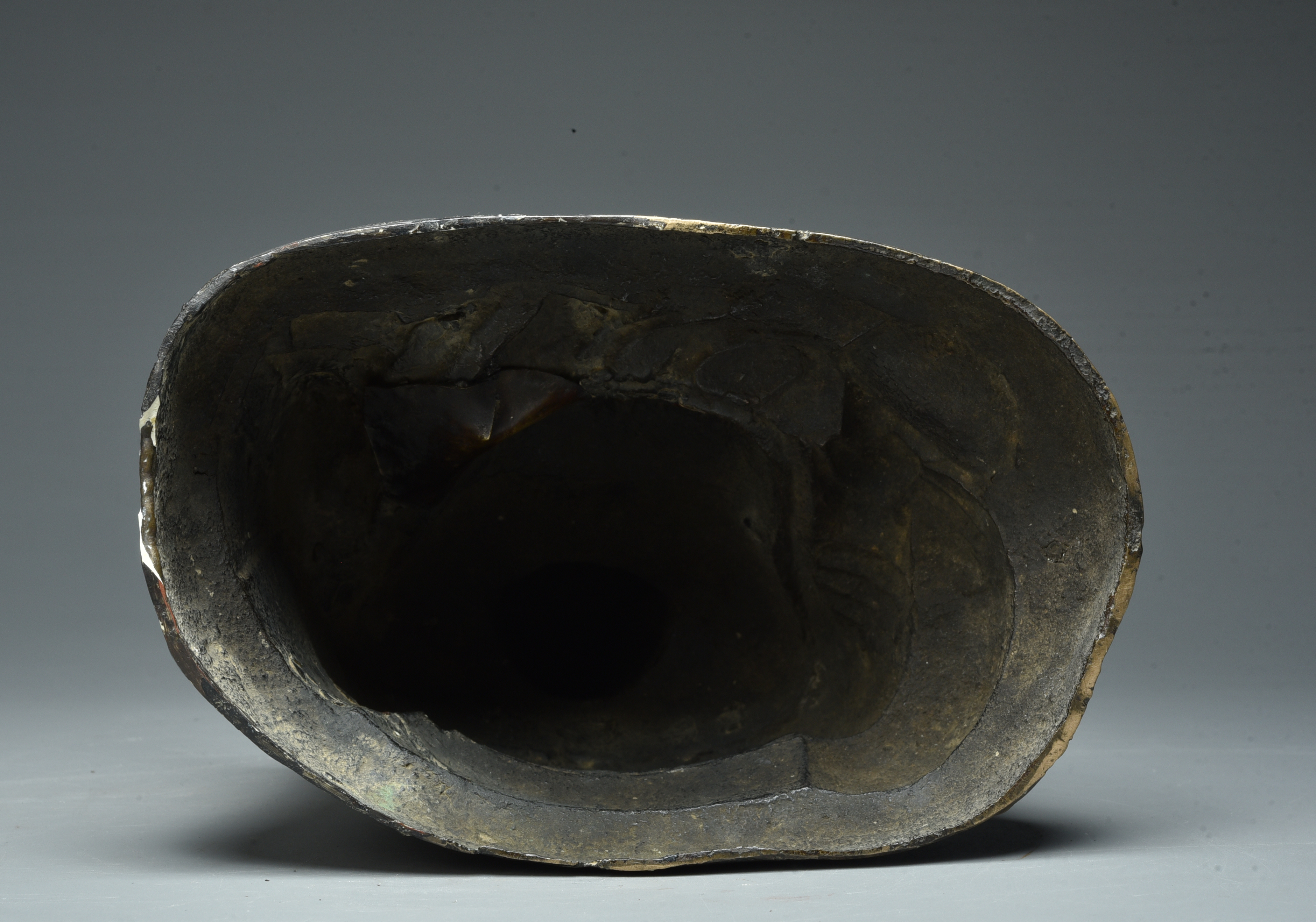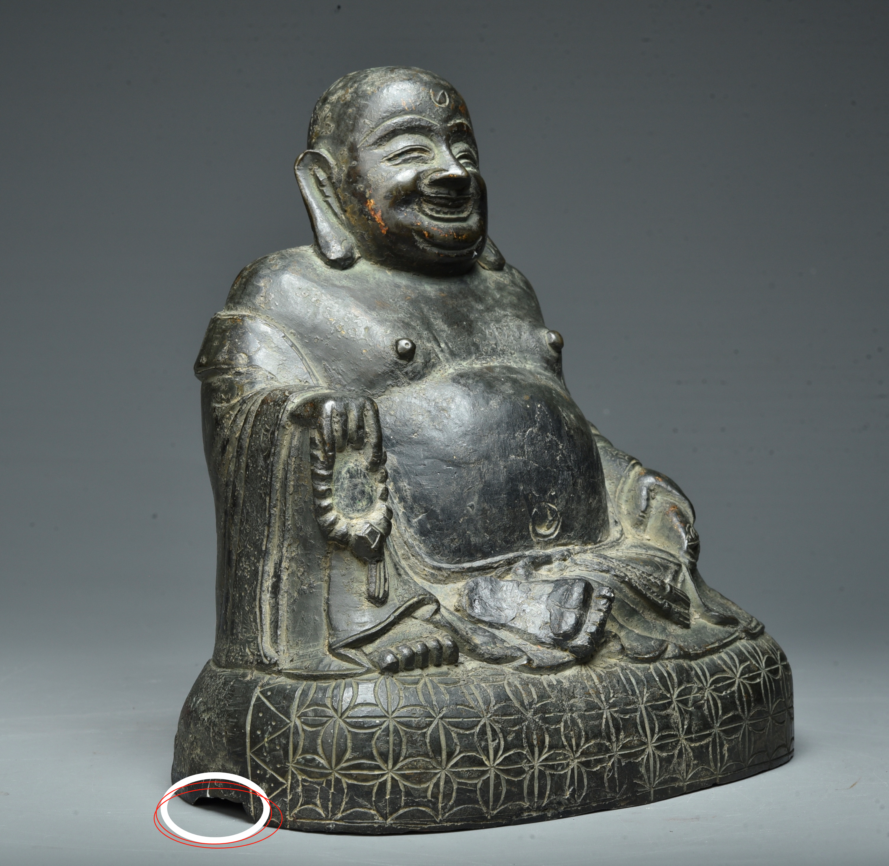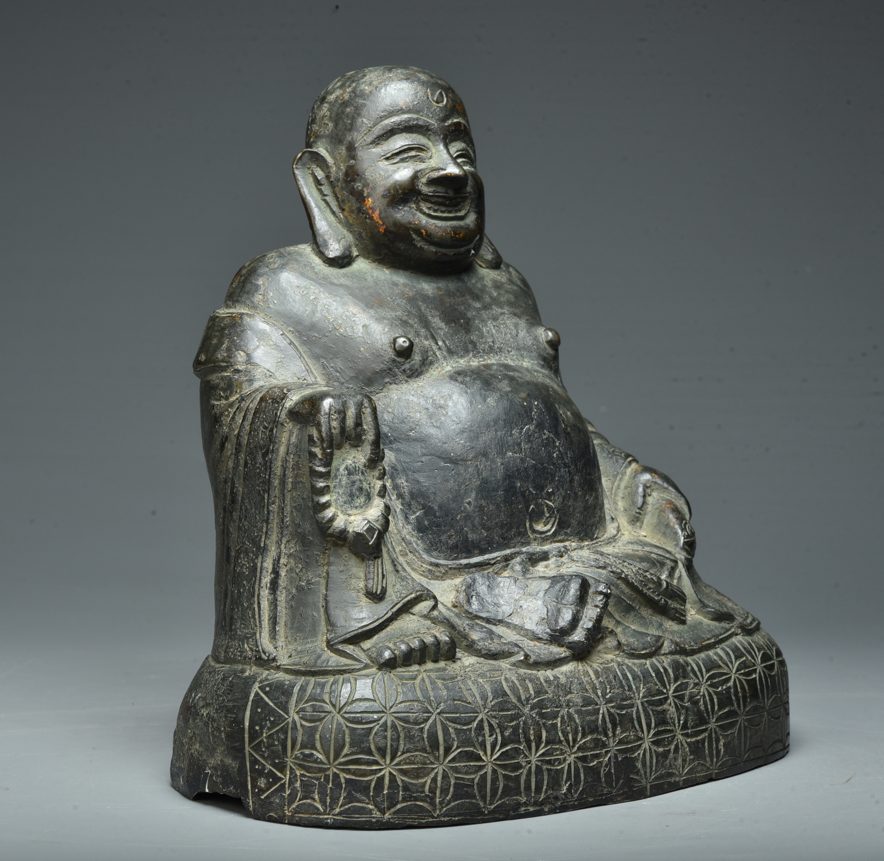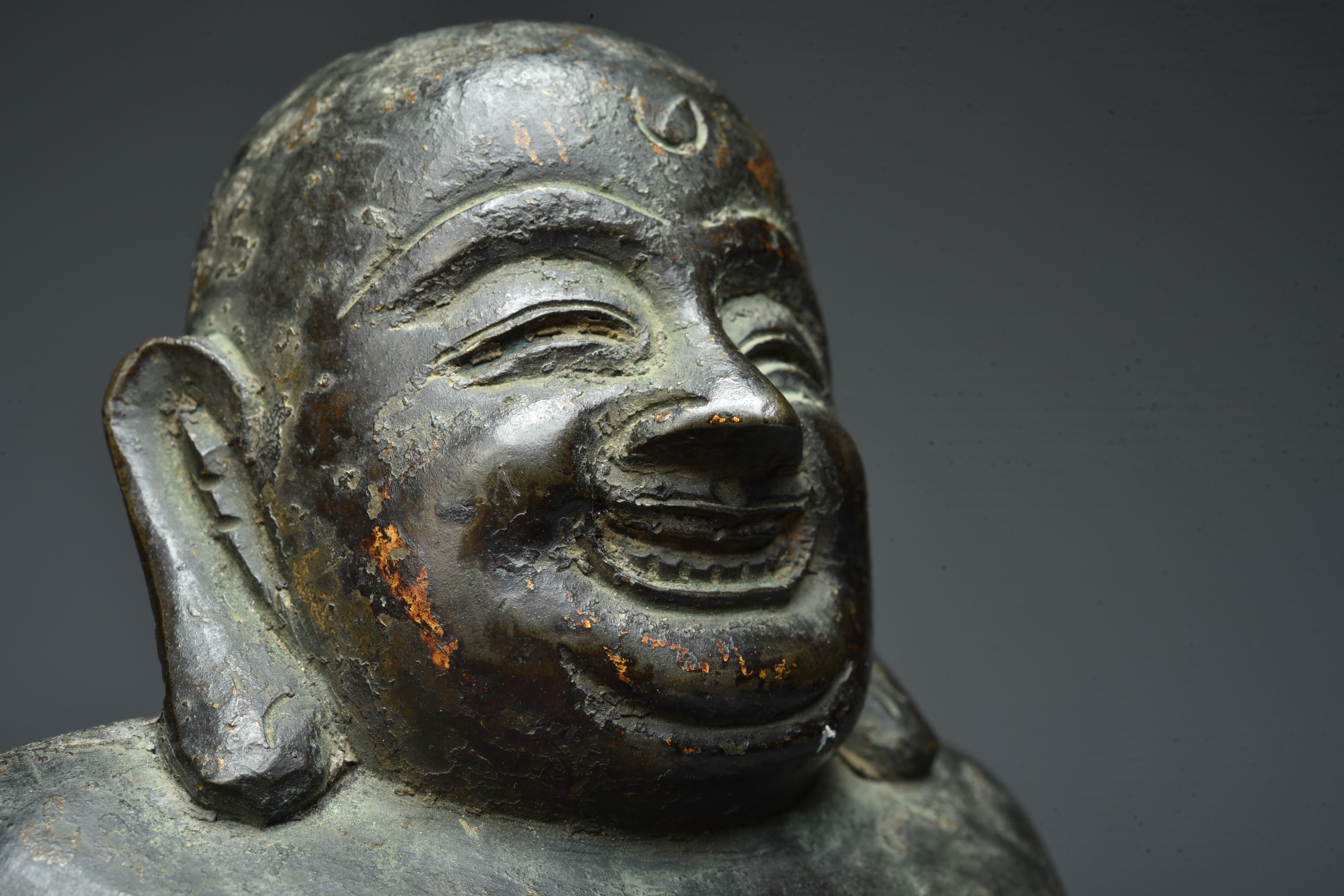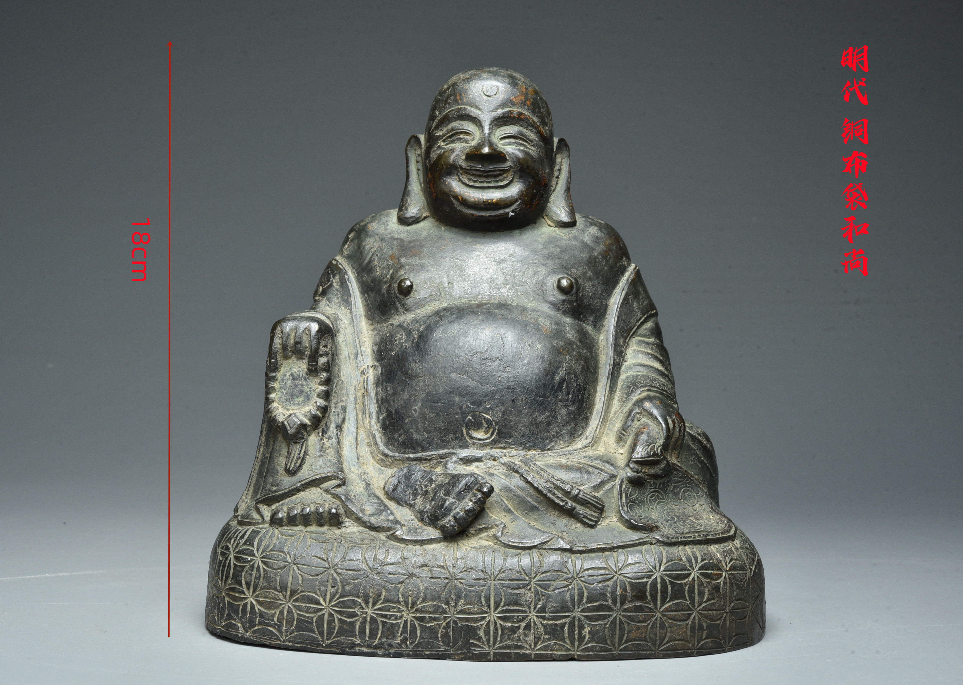 弥勒佛为经典造像,因大肚常笑被民间百姓供奉,在国内部分地区,弥勒也是财神的象征代表,供养弥勒相当于供养财神,从本造像底座刻画的金钱图案中亦可表明。佛教从贵族阶层到融入民间社会的典型代表是大肚弥勒佛,代表着佛之光辉,光照至每一片角落。铜胎铸造。勒佛舒坐相,光头圆顶,浓眉大眼,开怀大笑,两腮之肌肉突起,笑口半开,大耳垂肩,右手放于右膝之上,左手持布袋,袒胸露腹。有名联曰:「大肚能容,容天下难容之事;开口便笑,笑世间可笑之人。」整尊雕塑技巧精湛,包浆油亮,细部处理得当,由此铜弥勒佛像,亦可一窥其尘心妄动、慧性真空的慈悲大度,当为明铸铜人物之经典作品。