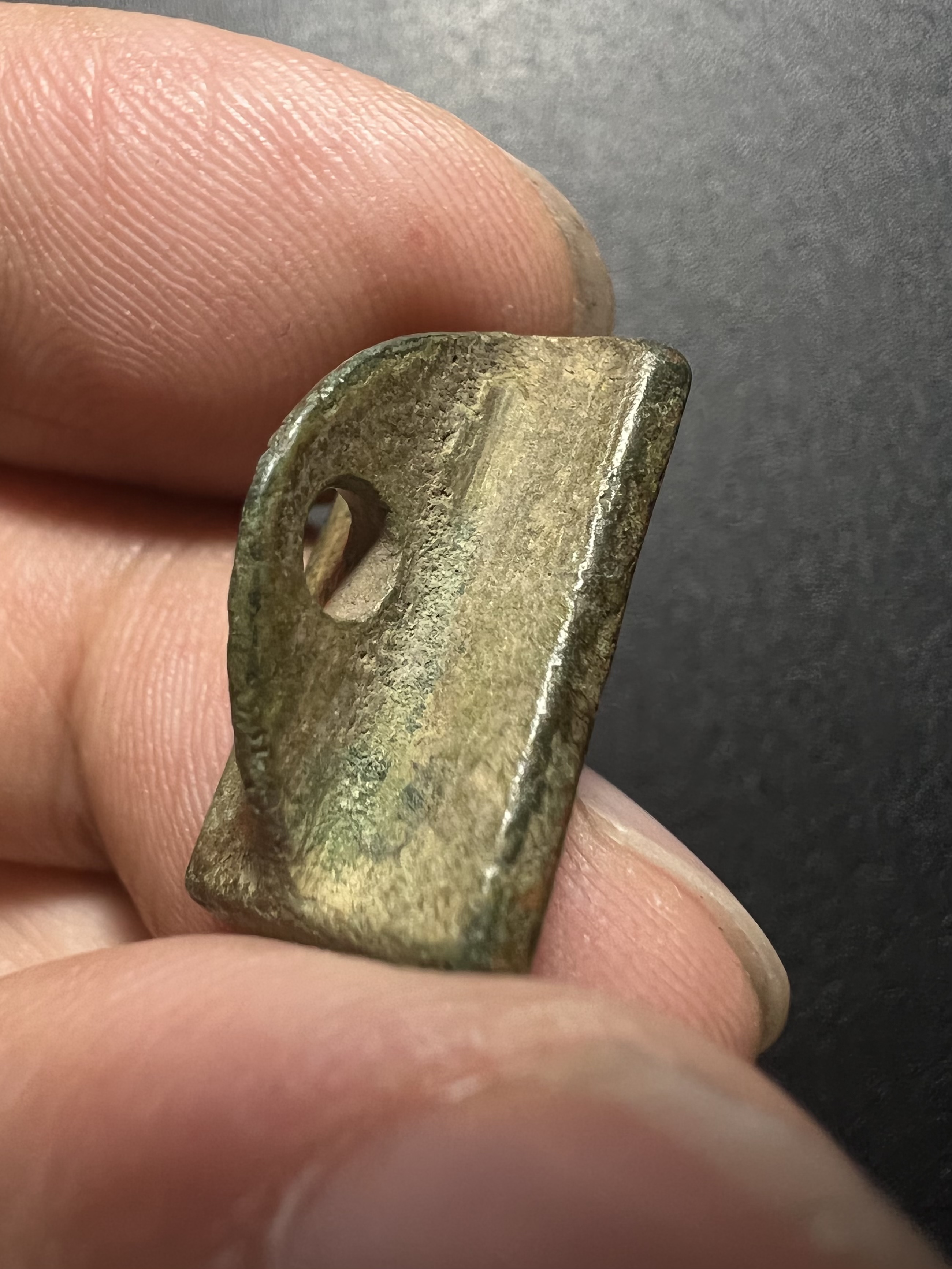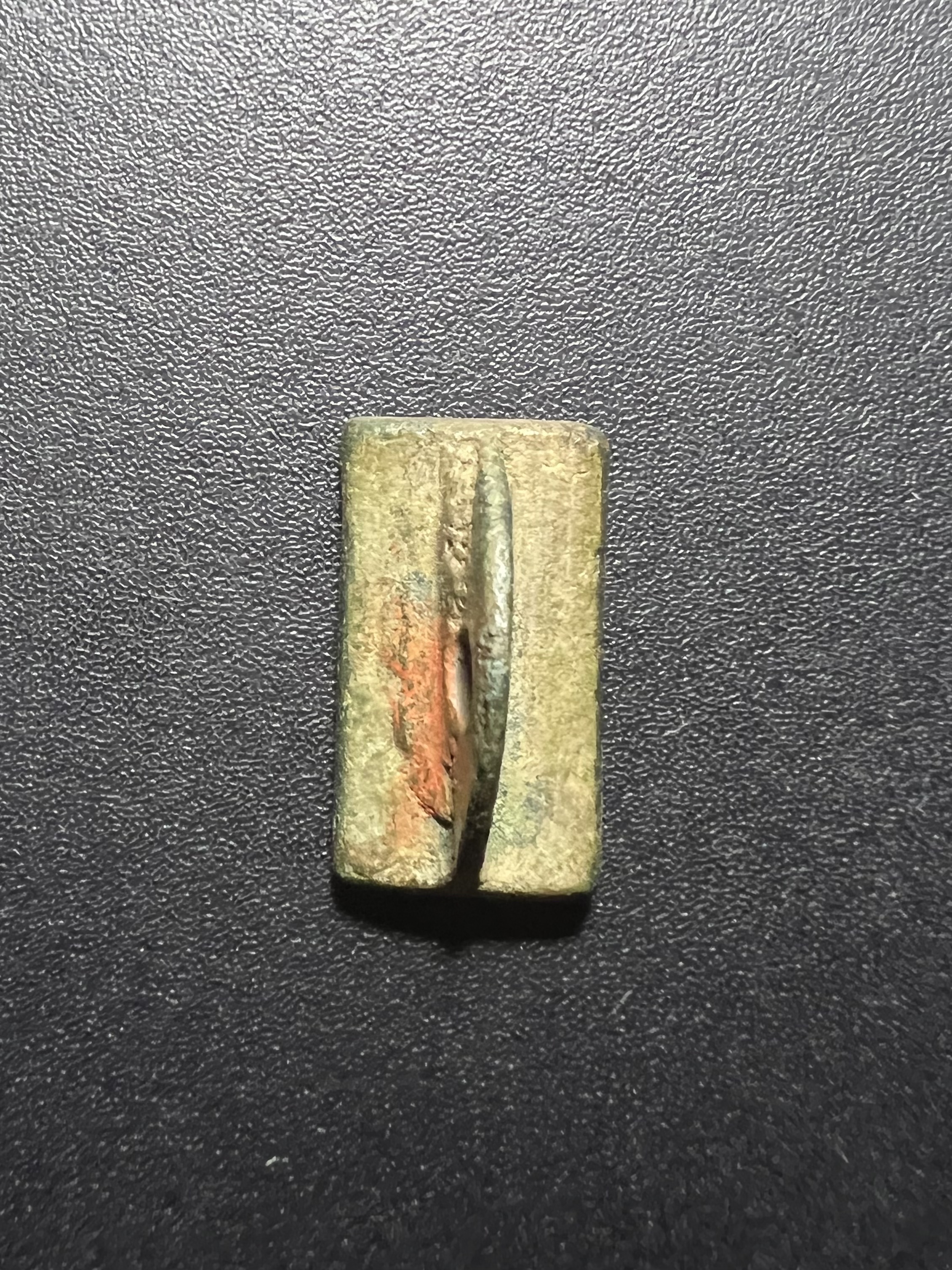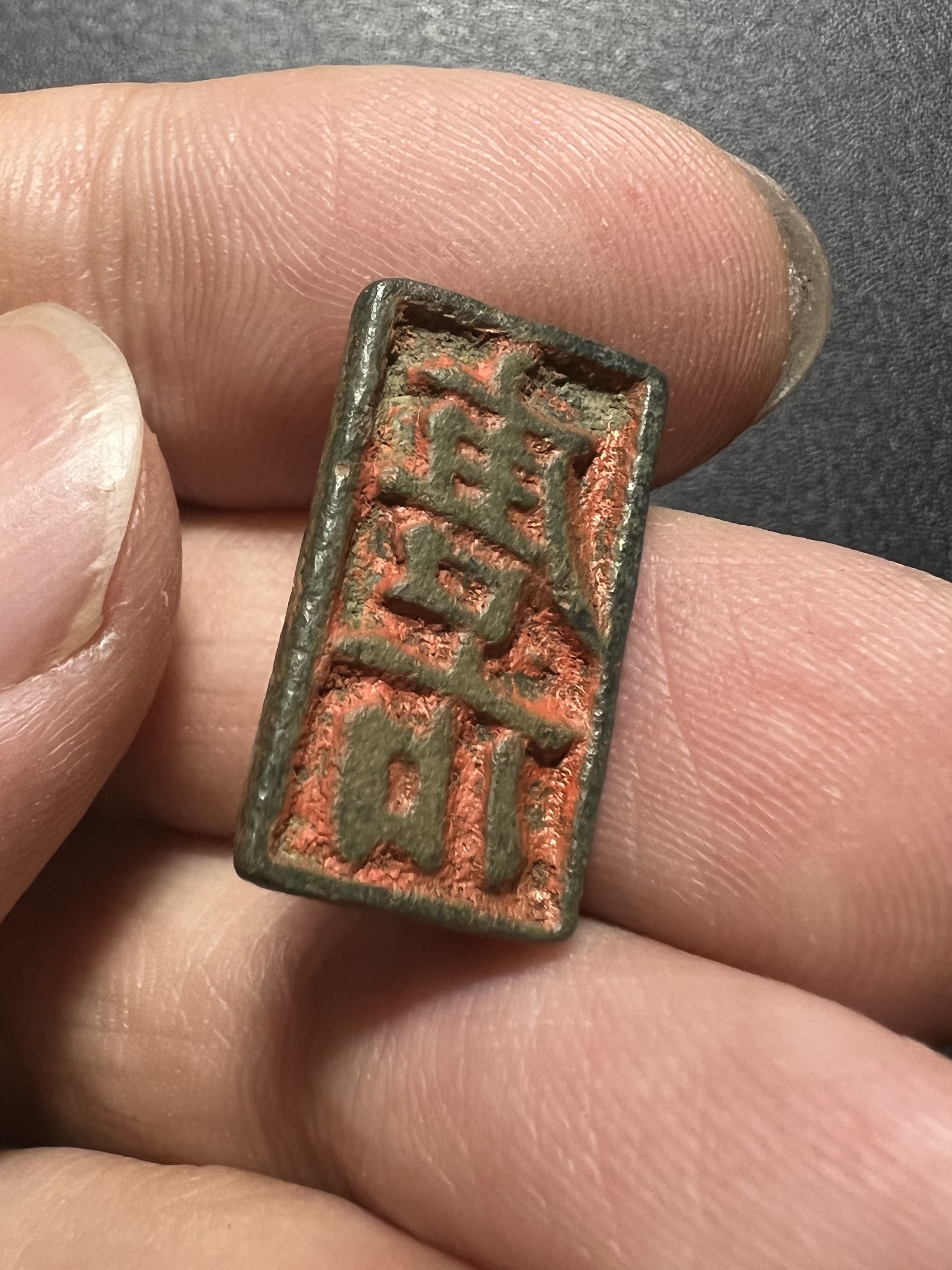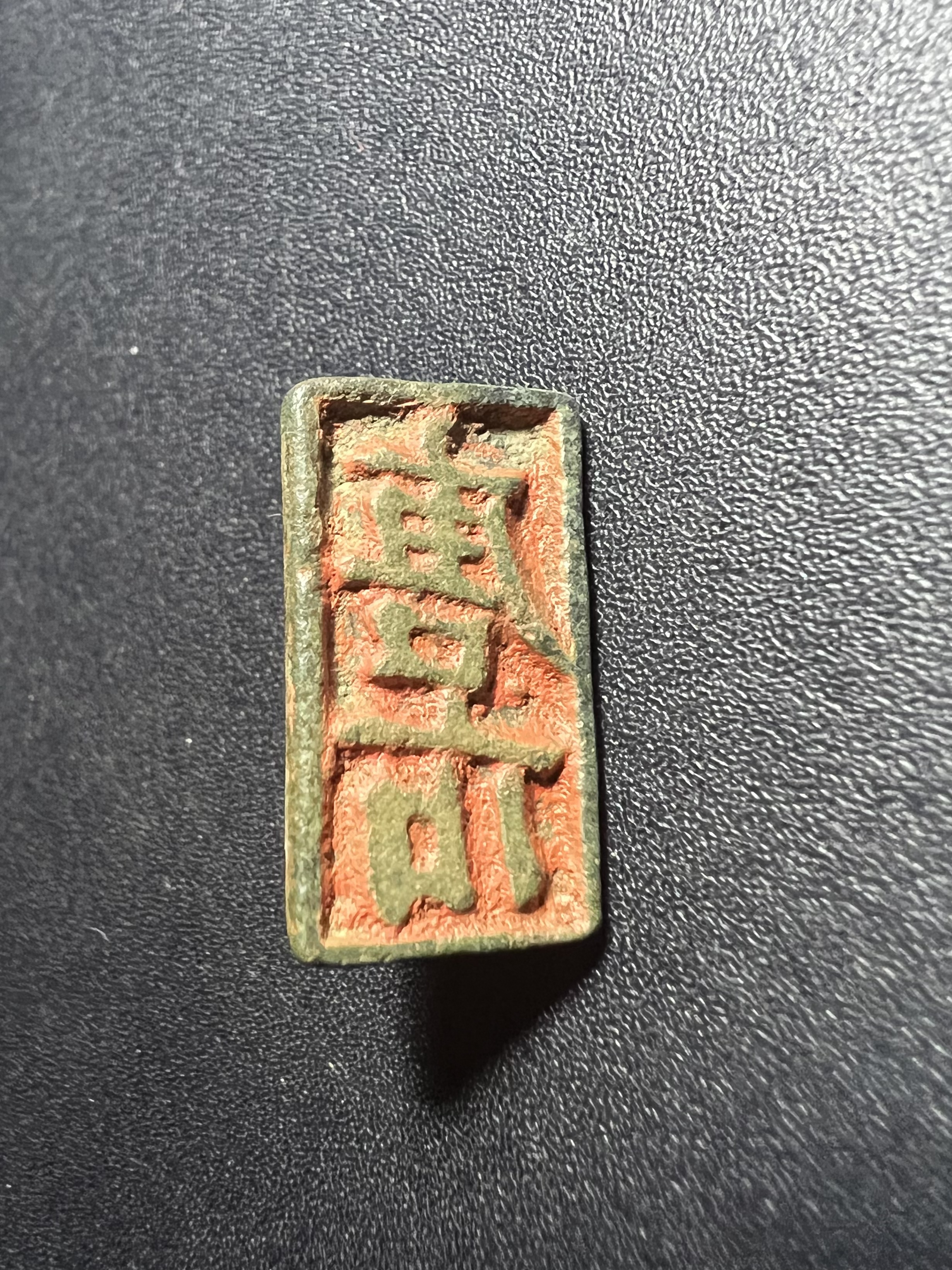 图录号025 姓氏押印 质地:铜 质量:4.9g 尺寸:19.1x10.9x2.5mm 唐姓押印 此印包浆皮壳一流,印文姓氏少见,造型小巧,方便携带,印文书法隽秀,“唐字”下面为花押符号,非汉字,适合佩戴收藏把玩~可做姓名logo。