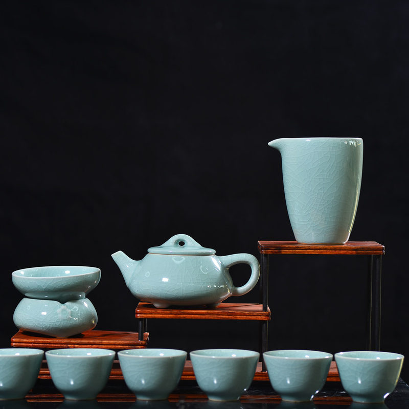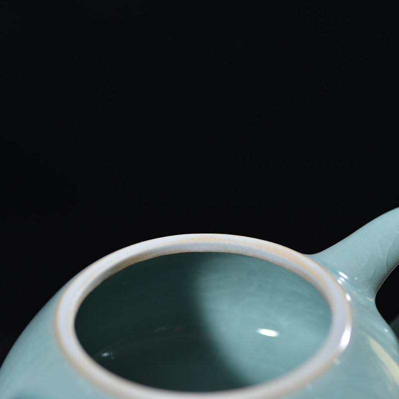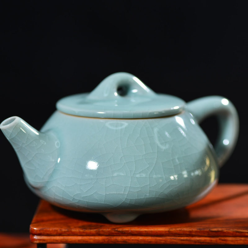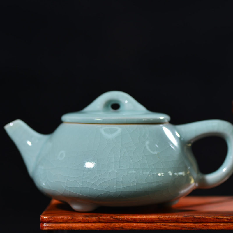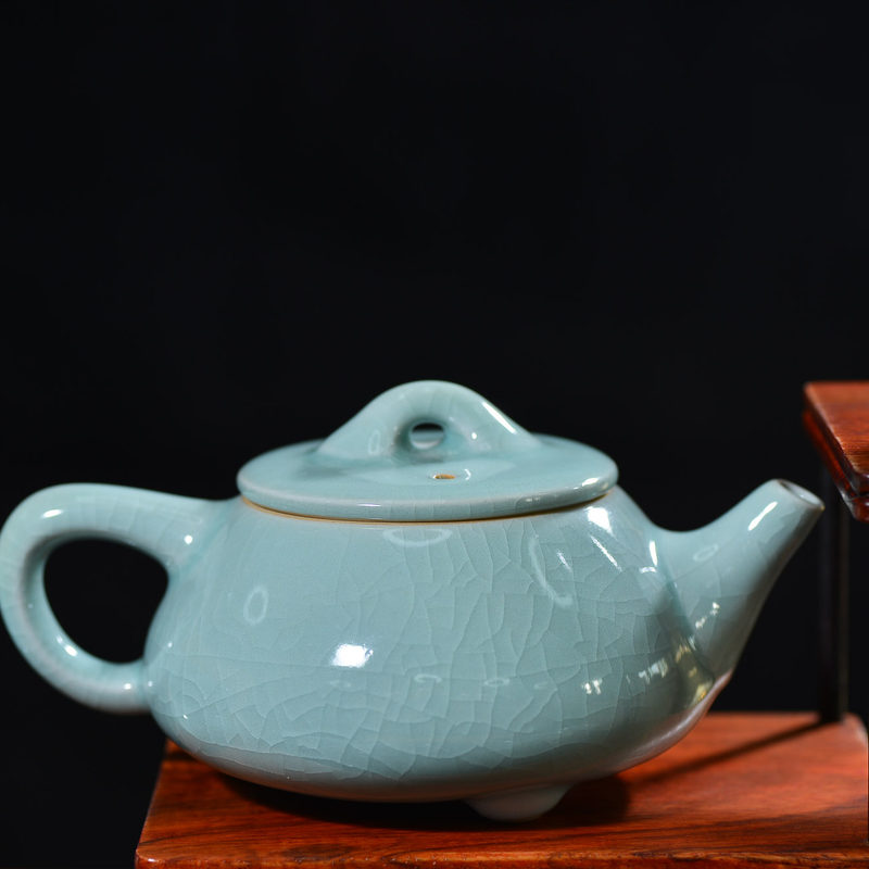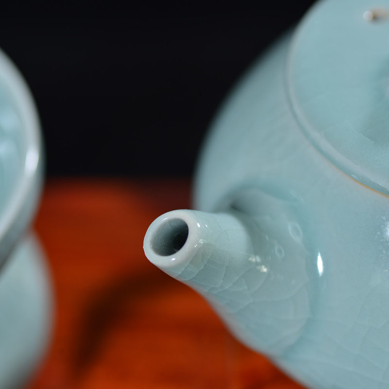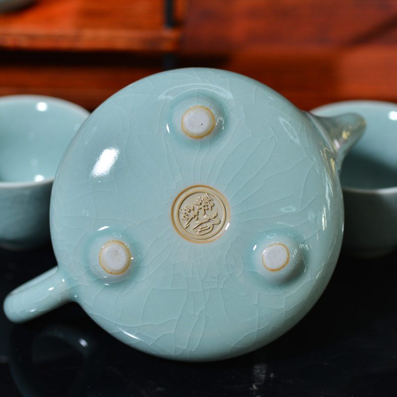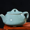 汝瓷 粉青釉 石飘壶茶具 设计巧妙 做工精细 送礼收藏佳品。尺寸壶13*9*6厘米,单杯4*6厘米。作者杨聚斌出生于1962年2月,因为父亲在陵头陶瓷厂工作,因此杨聚斌自幼受父亲耳濡目染,从少年时代就形成了陶瓷情结。1980年正式进入陵头陶瓷厂工作,开始系统学习陶瓷的烧制、配釉、造型、手拉胚等陶瓷制作技术。1990年,杨聚斌受洛阳旅游局聘请,被聘任为洛阳旅游局钧瓷厂技术厂长。1994年,杨聚斌被汝州市政府招聘到汝州市汝瓷一厂担任技术科长。1997年,企业改制后,杨聚斌自己成立了杨聚斌汝瓷工作室。2015年6月,作品《百合洗》《鸡心碗》第五届中国"大地奖"金奖。