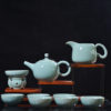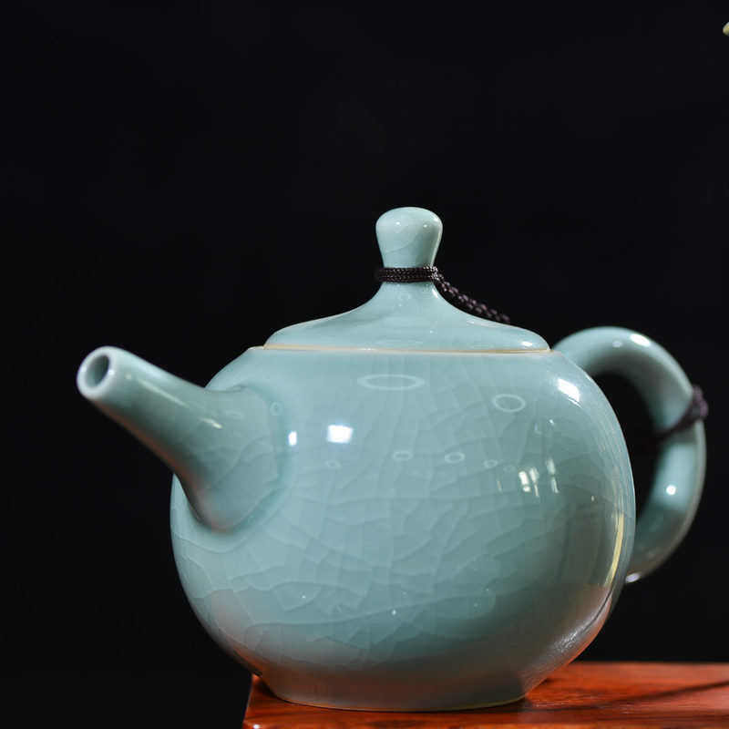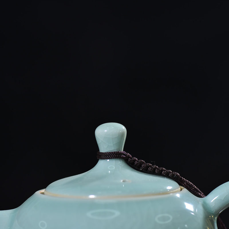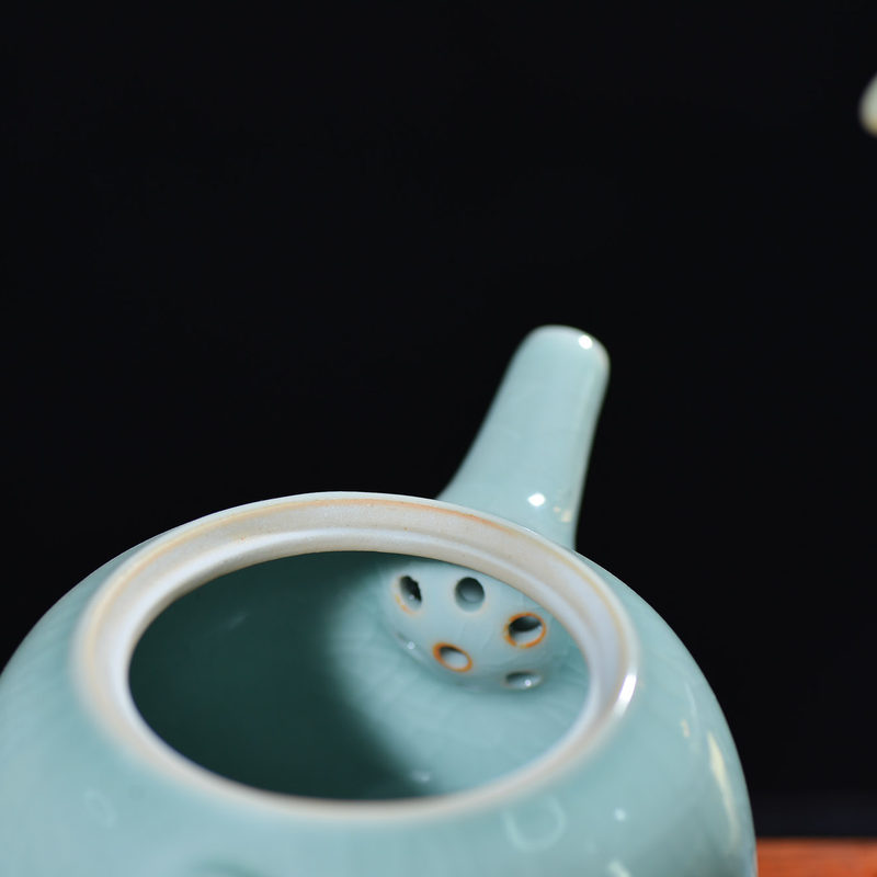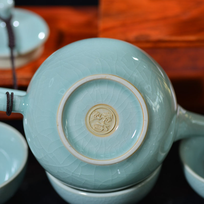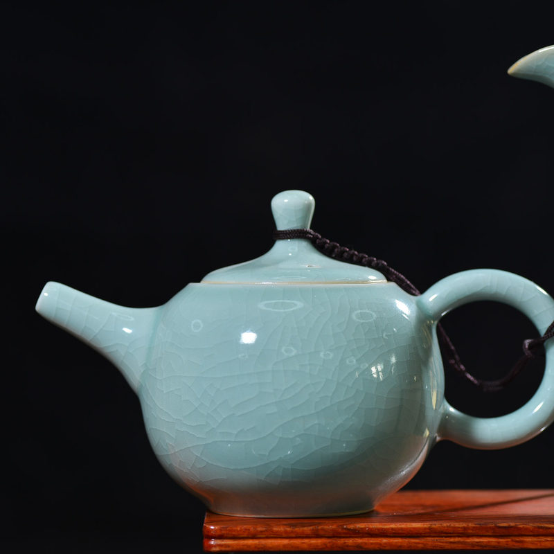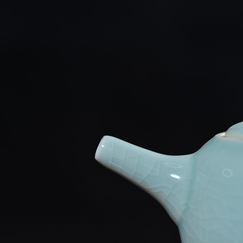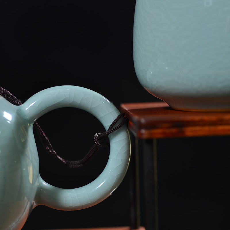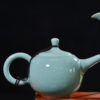 汝瓷 粉青釉 长嘴壶茶具 设计巧妙 做工精细 送礼佳品。壶尺寸15*8*9厘米 单杯尺寸3*7厘米。作者杨聚斌出生于1962年2月,因为父亲在陵头陶瓷厂工作,因此杨聚斌自幼受父亲耳濡目染,从少年时代就形成了陶瓷情结。1980年正式进入陵头陶瓷厂工作,开始系统学习陶瓷的烧制、配釉、造型、手拉胚等陶瓷制作技术。1990年,杨聚斌受洛阳旅游局聘请,被聘任为洛阳旅游局钧瓷厂技术厂长。1994年,杨聚斌被汝州市政府招聘到汝州市汝瓷一厂担任技术科长。1997年,企业改制后,杨聚斌自己成立了杨聚斌汝瓷工作室。2015年6月,作品《百合洗》《鸡心碗》第五届中国"大地奖"金奖。