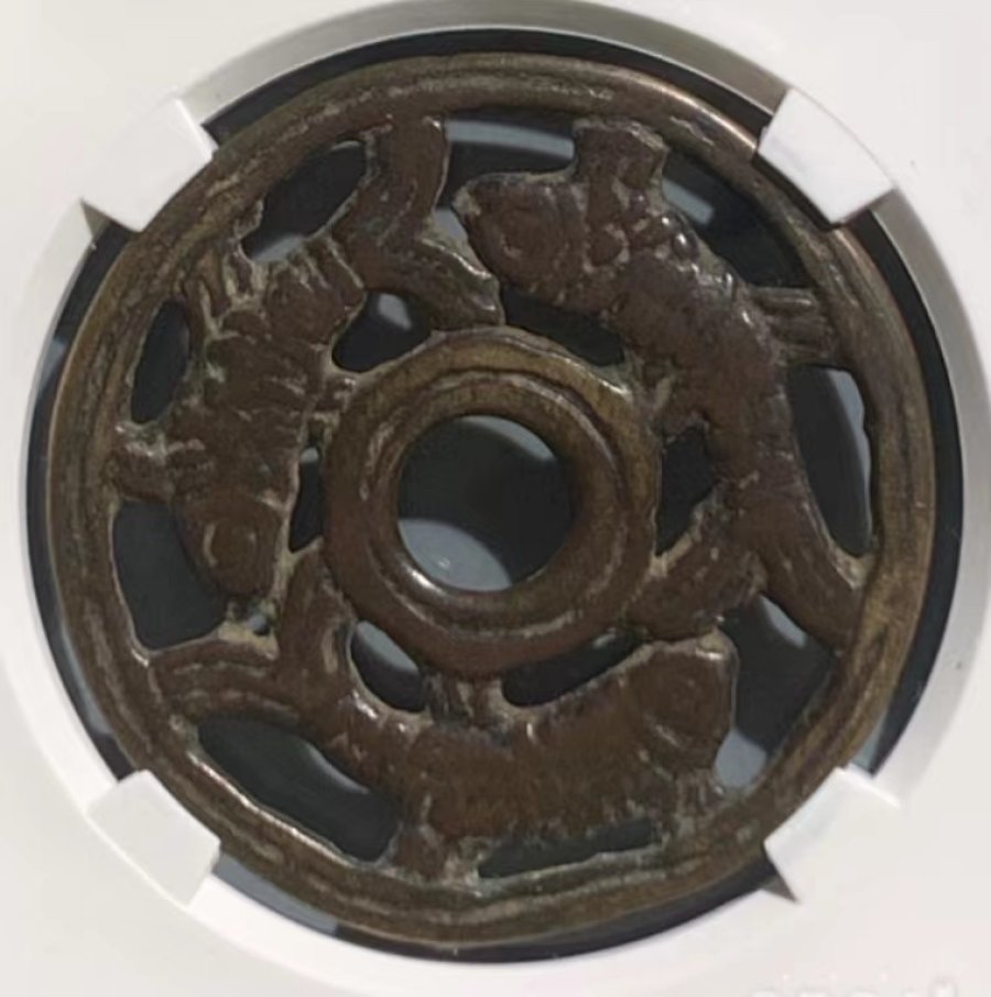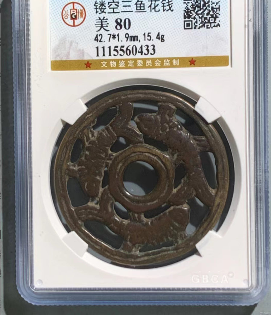 图录号022 镂空三鱼花钱 质地:铜 质量:15.4g 尺寸:42.7x42.7x1.9mm 经典题材,镂空三鱼花钱 ,传世品相,包浆温润熟美,老辣自然,此枚镂空花钱包浆温润喜人,三鱼版式少见,寓意年年有余、吉庆有余,钱币公博评分美80,品相如图所示,特点鲜明,风格考究,值得收藏。
