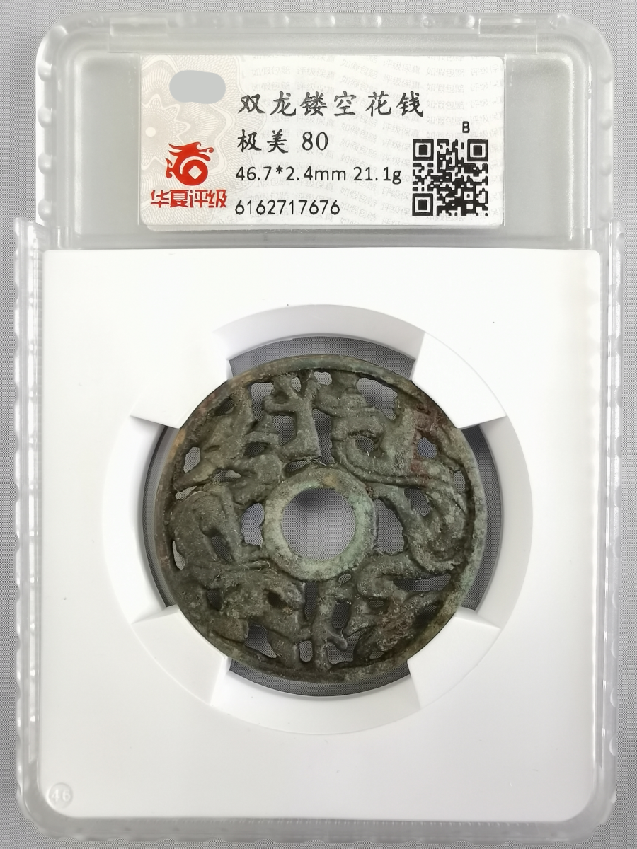 图录号029 双龙镂空花钱 质地:铜 质量:21.1g 尺寸:46.7x46.7x2.4mm 镂空钱收藏必备品种,双龙镂空花钱,传世品相,包浆温润熟美,老辣自然,华夏极美品,开放式盒子,46.7*2.4mm,21.1g。双龙苍劲有力,粗犷豪放,张力十足,威猛霸气,风格典型,特点突出,很有代表性,包浆熟美,无瑕疵。镂空花钱为古泉届的价值洼地,欢迎有缘者结缘。