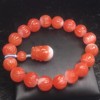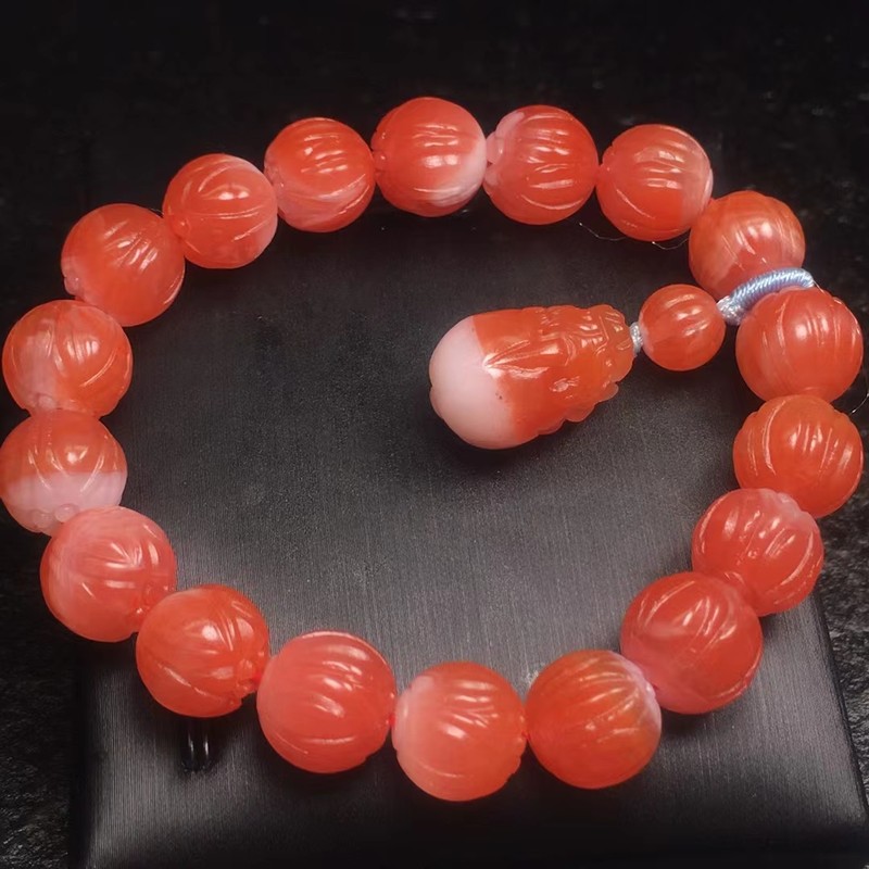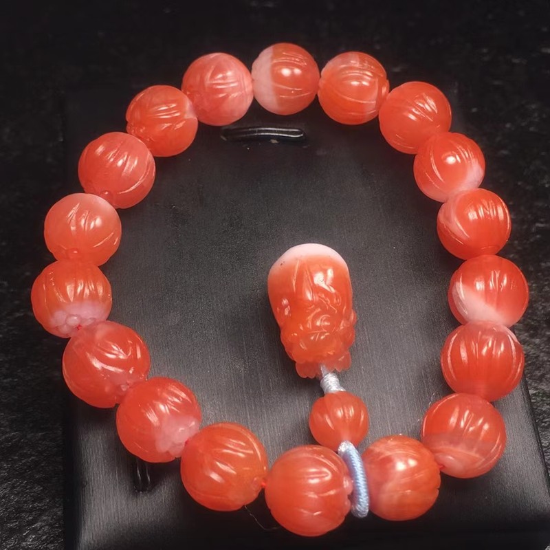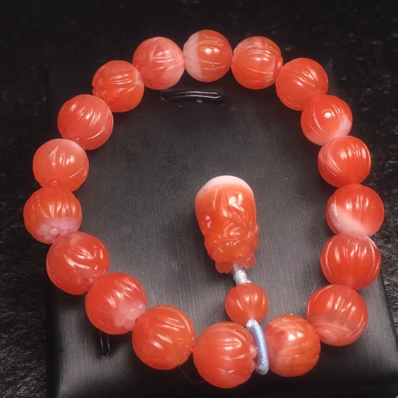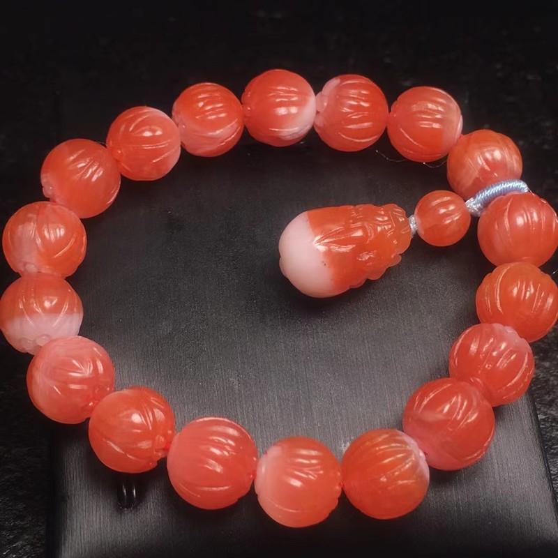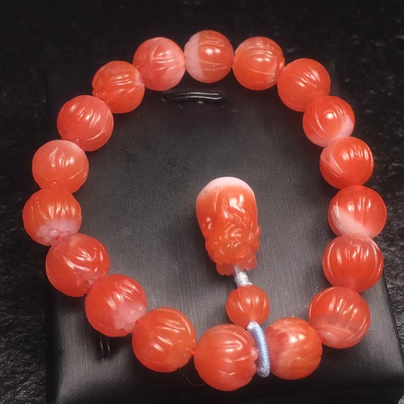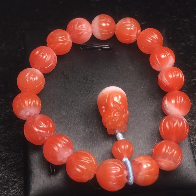 保山 南红 莲花 手串 颜色红润 干净无杂 尺寸11毫米 。南红玛瑙(SouthRedAgate)是玛瑙的一个种类,古称”赤玉”,质地细腻油润,是中国独有的品种。由于产量稀少,南红玛瑙价格急剧上升。南红玛瑙曾被古人用之入药,养心养血。南红玛瑙的应用历史悠久,如云南博物馆馆藏有古滇国时期的出土南红饰品,北京故宫博物院馆藏的*南红玛瑙凤首杯更是精美,是研究南红玛瑙制品、南红玛瑙雕刻件等,宫廷碾玉的实物资料,具有非常重要的历史、艺术价值,被定为国家一级文物。从这些馆藏作品可以看出,历朝历代对南红都非常重视,同时也是很稀少的珍贵材料。 南红玛瑙已经和和田玉、翡翠形成三足鼎立之势。