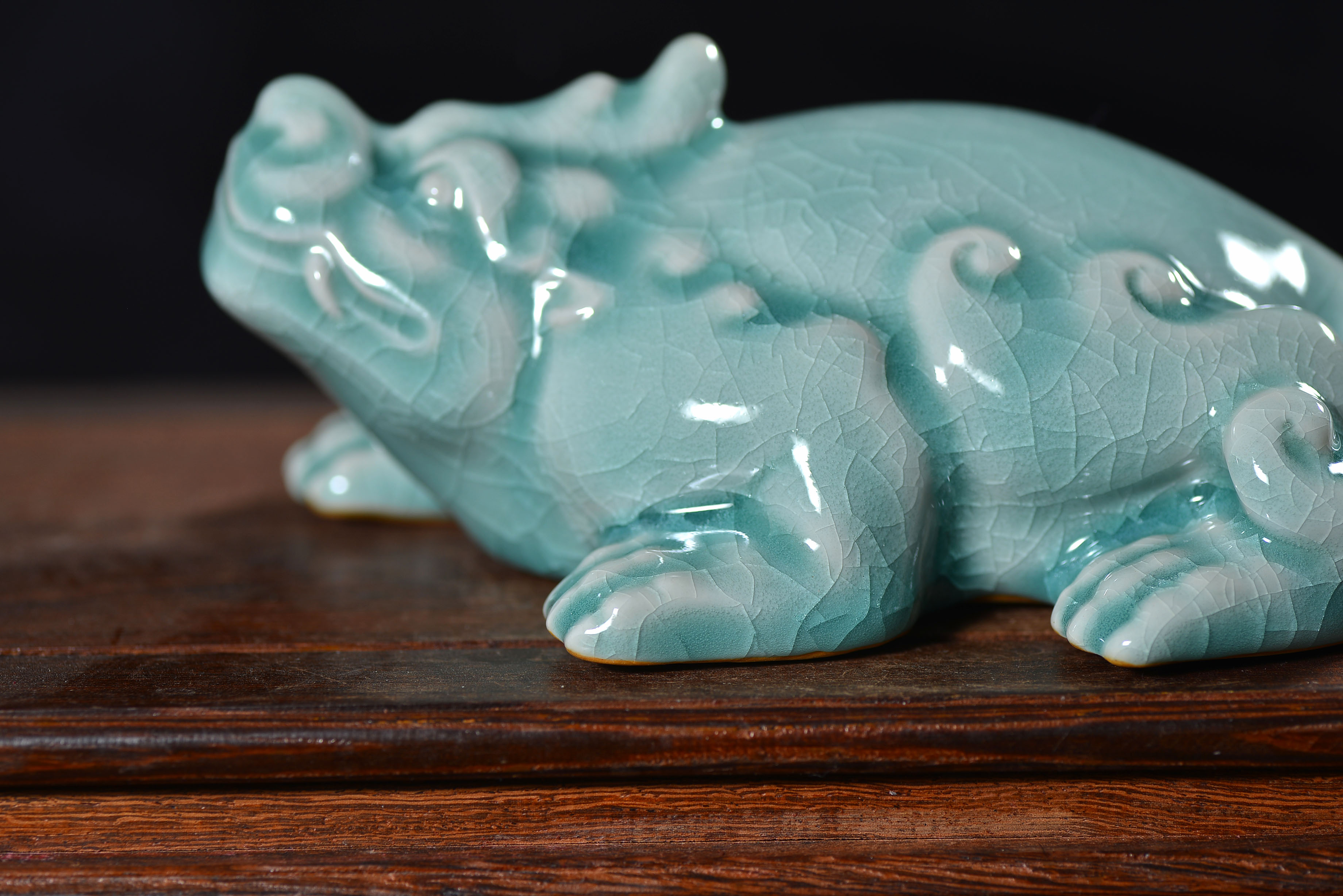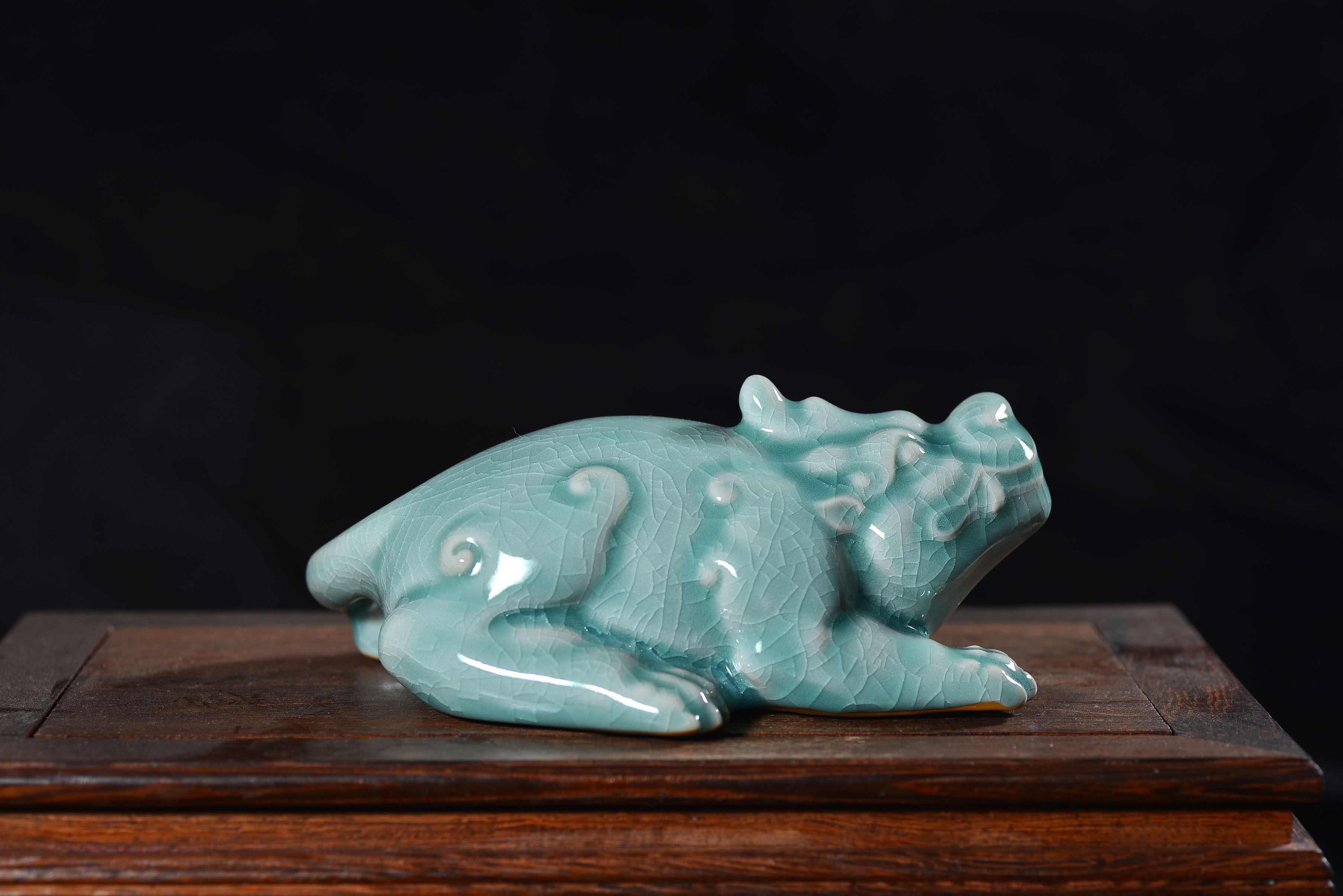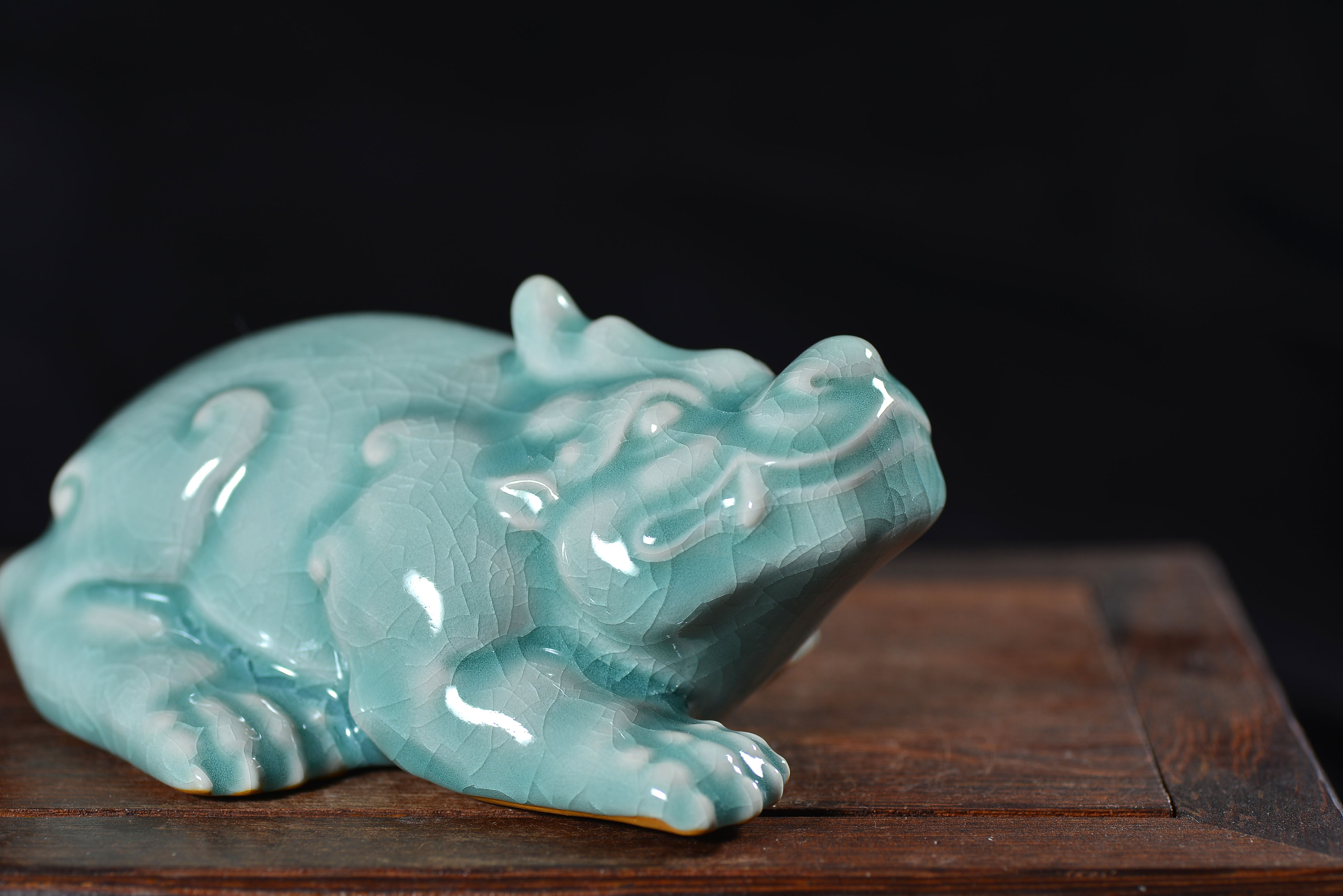 清凉寺仿古釉天青色 龙龟摆件 长16厘米 宽12厘米 高6.5厘米 全品无瑕疵 收藏使用佳品。 收藏使用佳品。清凉寺汝瓷是中国北宋时期的主要代表瓷之一,属于五大名窑之一。清凉寺汝瓷的历史可以追溯到北宋时期,当时的宋王朝为了满足宫廷的特殊需要,设立了汝官窑。这个窑场生产的汝瓷以其独特的美学风格和高*的制作工艺而闻名,被视为青瓷之典范。清凉寺汝官窑遗址是在上世纪被发现的,这一发现揭开了汝官窑消失的千古之谜。自1987年以来,河南省文物考古研究所对清凉寺汝窑遗址进行了多次发掘,发现了大量重要的烧造设施和汝窑瓷器标本。清凉寺汝瓷的艺术特色体现在其独特的制作工艺和美学风格上。它以其工艺精湛、造型秀美、釉面蕴润、高雅素净的丰韵而独具风采。汝瓷的制作工艺包括使用名贵玛瑙为釉,釉色独特,随光变幻,呈现出“雨过天晴云破处”“千峰碧波翠色来”的美妙效果。此外,汝瓷的胎体厚重,釉厚而声如磬。汝瓷的形状古朴大方,器表呈蝉翼纹细小开片,具有“梨皮、蟹爪、芝麻花”的特点。这些装饰手法使得汝瓷不仅美观而且富有变化,被世人称为“似玉、非玉、而胜玉”。