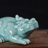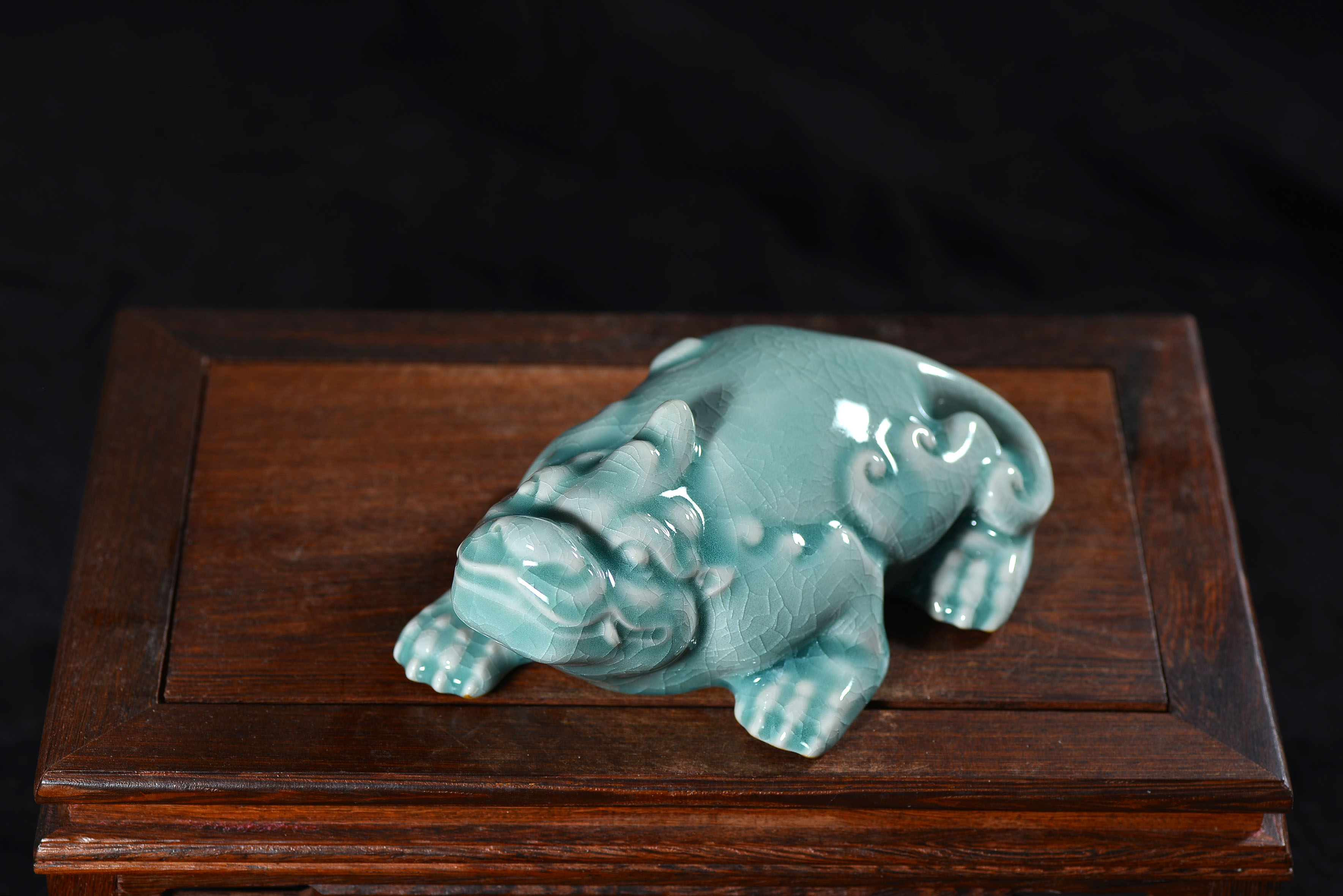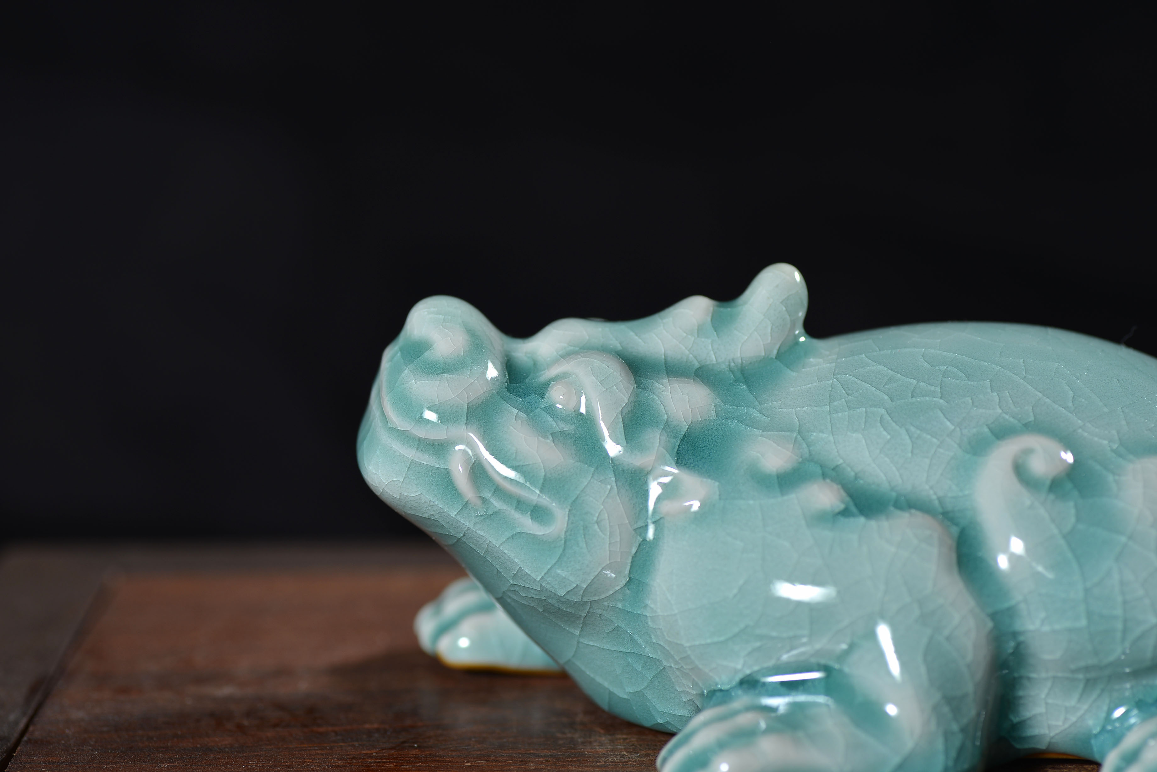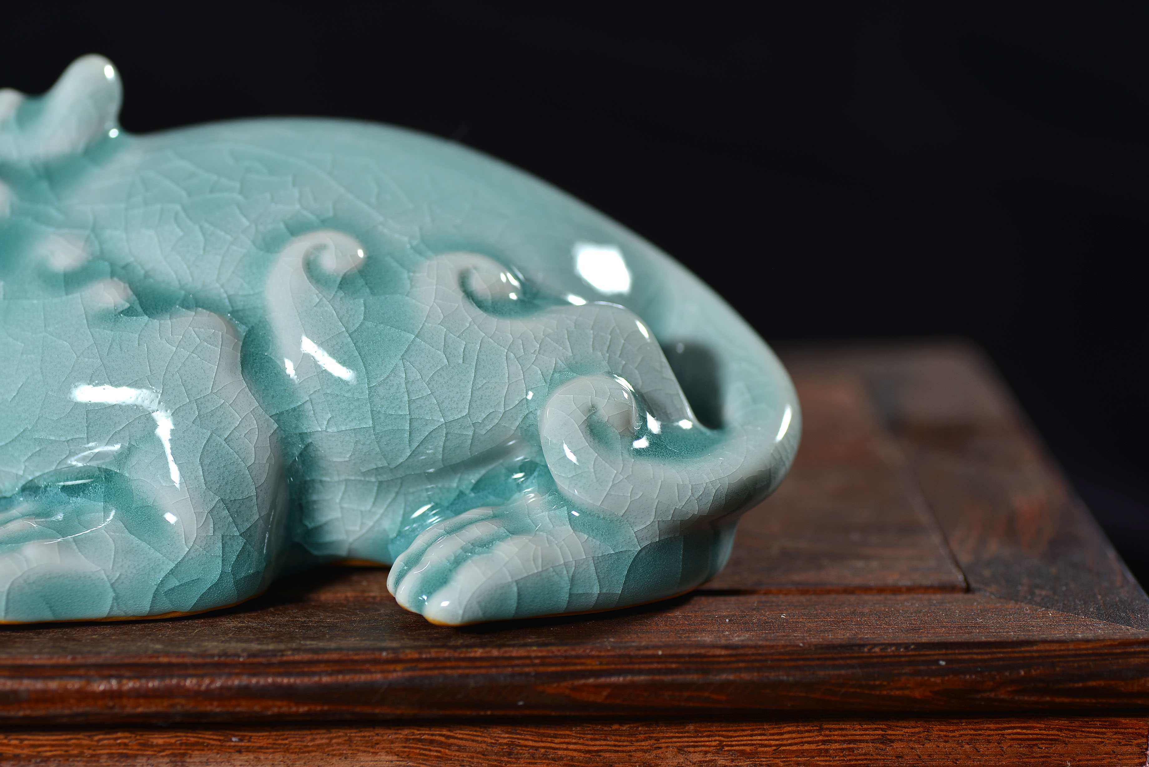 清凉寺仿古釉天青色 龙龟摆件 长16厘米 宽12厘米 高6.5厘米 全品无瑕疵 收藏使用佳品。 收藏使用佳品。清凉寺汝瓷是中国北宋时期的主要代表瓷之一,属于五大名窑之一。清凉寺汝瓷的历史可以追溯到北宋时期,当时的宋王朝为了满足宫廷的特殊需要,设立了汝官窑。这个窑场生产的汝瓷以其独特的美学风格和高*的制作工艺而闻名,被视为青瓷之典范。清凉寺汝官窑遗址是在上世纪被发现的,这一发现揭开了汝官窑消失的千古之谜。自1987年以来,河南省文物考古研究所对清凉寺汝窑遗址进行了多次发掘,发现了大量重要的烧造设施和汝窑瓷器标本。清凉寺汝瓷的艺术特色体现在其独特的制作工艺和美学风格上。它以其工艺精湛、造型秀美、釉面蕴润、高雅素净的丰韵而独具风采。汝瓷的制作工艺包括使用名贵玛瑙为釉,釉色独特,随光变幻,呈现出“雨过天晴云破处”“千峰碧波翠色来”的美妙效果。此外,汝瓷的胎体厚重,釉厚而声如磬。汝瓷的形状古朴大方,器表呈蝉翼纹细小开片,具有“梨皮、蟹爪、芝麻花”的特点。这些装饰手法使得汝瓷不仅美观而且富有变化,被世人称为“似玉、非玉、而胜玉”。