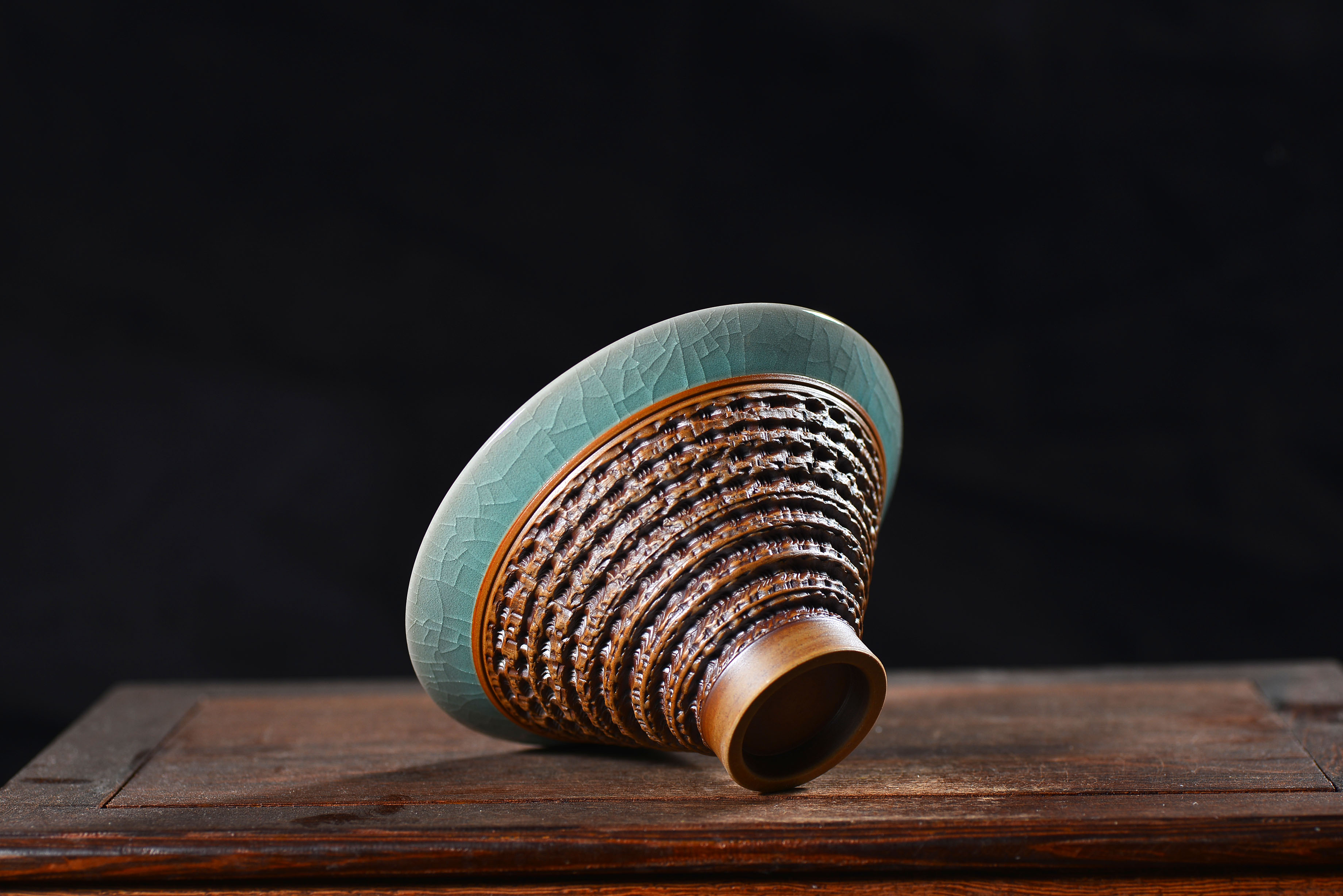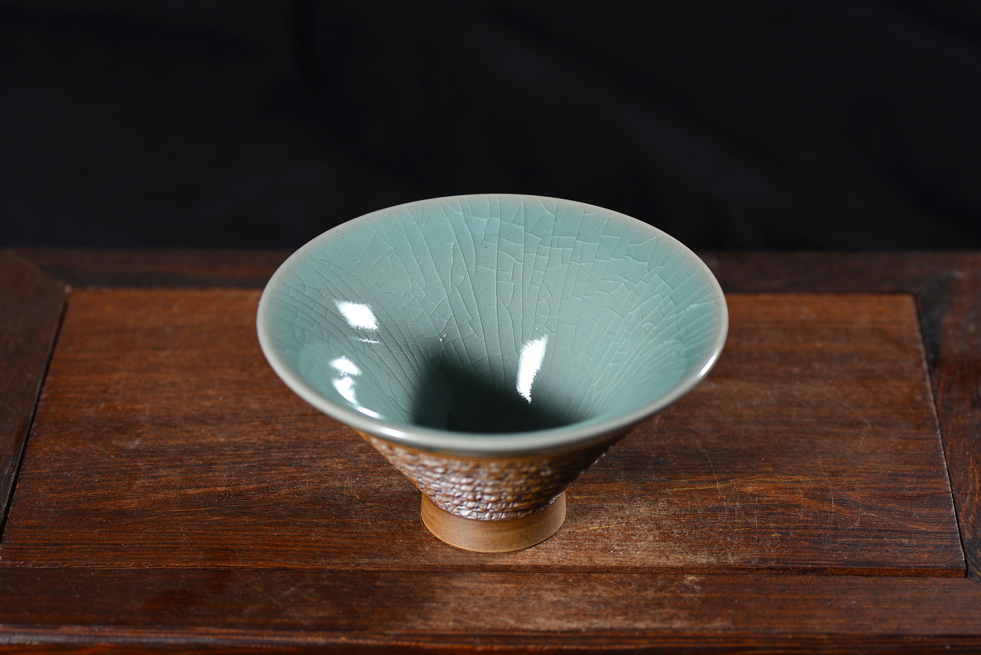 清凉寺仿古釉天青色 手工跳刀直口杯 直径11.5厘米 高8厘米 容量130毫升。全品无瑕疵 收藏使用佳品。 收藏使用佳品。清凉寺汝瓷是中国北宋时期的主要代表瓷之一,属于五大名窑之一。清凉寺汝瓷的历史可以追溯到北宋时期,当时的宋王朝为了满足宫廷的特殊需要,设立了汝官窑。这个窑场生产的汝瓷以其独特的美学风格和高*的制作工艺而闻名,被视为青瓷之典范。清凉寺汝官窑遗址是在上世纪被发现的,这一发现揭开了汝官窑消失的千古之谜。自1987年以来,河南省文物考古研究所对清凉寺汝窑遗址进行了多次发掘,发现了大量重要的烧造设施和汝窑瓷器标本。清凉寺汝瓷的艺术特色体现在其独特的制作工艺和美学风格上。它以其工艺精湛、造型秀美、釉面蕴润、高雅素净的丰韵而独具风采。汝瓷的制作工艺包括使用名贵玛瑙为釉,釉色独特,随光变幻,呈现出“雨过天晴云破处”“千峰碧波翠色来”的美妙效果。此外,汝瓷的胎体厚重,釉厚而声如磬。汝瓷的形状古朴大方,器表呈蝉翼纹细小开片,具有“梨皮、蟹爪、芝麻花”的特点。这些装饰手法使得汝瓷不仅美观而且富有变化,被世人称为“似玉、非玉、而胜玉”。